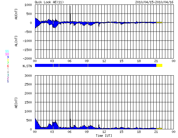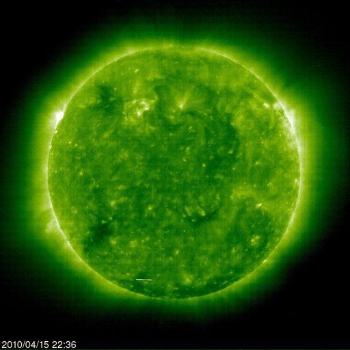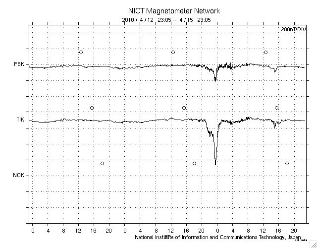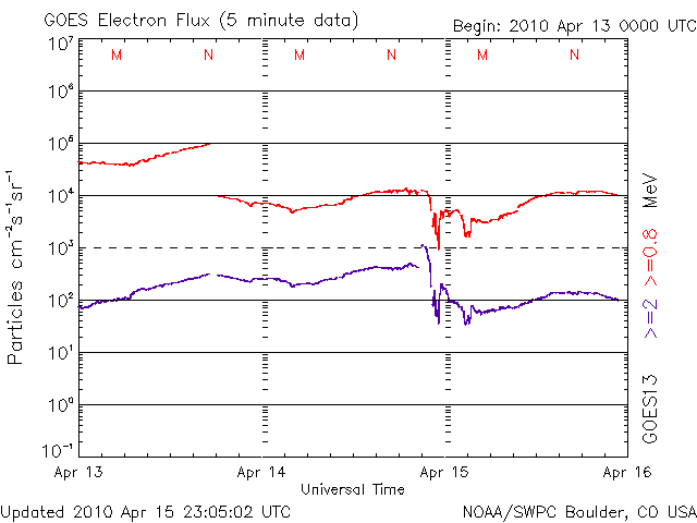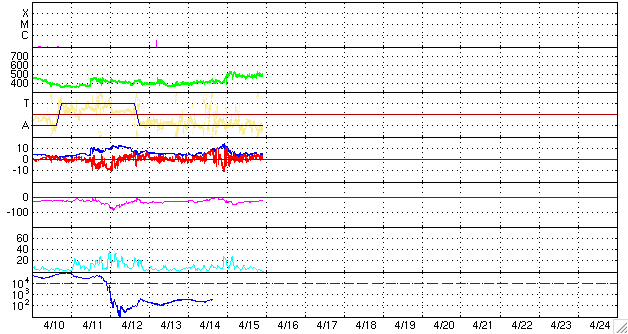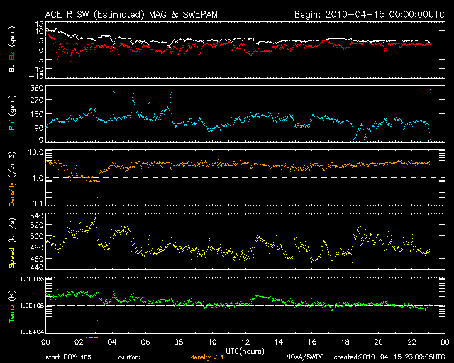 2010/ 4/16 08:09 更新 480km/秒の高速太陽風が続いています。太陽は無黒点です。 担当 篠原 太陽風の速度は480km/秒を前後していて、高速風が続いています。 磁場強度は、5nTと平均的な強さで安定しています。 SOHO EIT195を見ると、コロナホールはだいぶ西の端に近づいていますが、 地球への影響は続いています。 しかし、この写真の様子では、今回の速度の高まりも今日いっぱいくらいではないでしょうか。 高速風は続いていますが、磁気圏活動は静穏です。 これは、オーロラ活動のスイッチとなる太陽風磁場の南北成分(ACEの赤線)が、 スイッチオフである北寄り(プラス側)になっているためです。 今後の太陽風ですが、 明日か明後日くらいに、13日に発生したCMEの影響が見られるかもしれません。 ただし、CMEは比較的横向きに飛び出しているので、あまり大きな変動にはならないでしょう。 それがなければ、速度も下がって、穏やかな太陽風が続くと思います。 放射線帯の高エネルギー電子は、低い状態です。 観測しているGOES衛星が、GOES11からGOES13に世代交代しました。 図の右端に衛星の名前が書かれています。 一昨日のニュースに掲載した図は11号でしたが、昨日から13号に変更されています。 太陽は、無黒点のままです。 EIT195の東端には明るい領域が見えています。 ここに黒点があるかどうか、もし無ければ、しばらく無黒点が続くかもしれません。 SOHO EIT195による太陽コロナ。16日7時半(世界時15日22時半)。 (c) SOHO (ESA & NASA) ![]() SOHOによる太陽可視光写真。無黒点です。 (c) SOHO (ESA & NASA) ![]() ACEが観測した太陽風の磁場(1番上の枠、白線は全体の強度、赤線は南北成分) および、太陽風の密度(3番目の橙線)、速度(4番目の黄線) (c) NOAA/SWPC ![]() リアルタイムAE指数 下段のAEグラフの値が高くなると、オーロラ活動が活発化しています。 (c) 京都大学, NICT ![]() シベリアで観測された3日間の磁場データ 右側の3分の1が、昨日のデータになります。グラフが上がったり下がったりすると、オーロラ活動が活発化しています。 (c) NICT ![]() 27日の太陽周期に合わせたデータプロット 太陽が同じ面を地球に向けていた27日前の変化から、今後を予想することができます。 (c) NICT