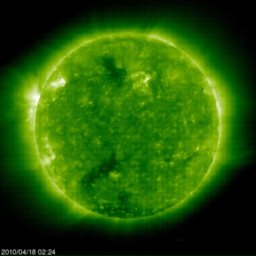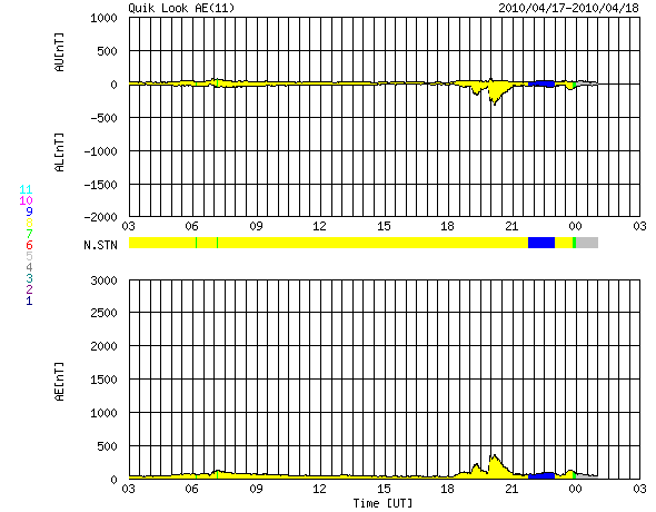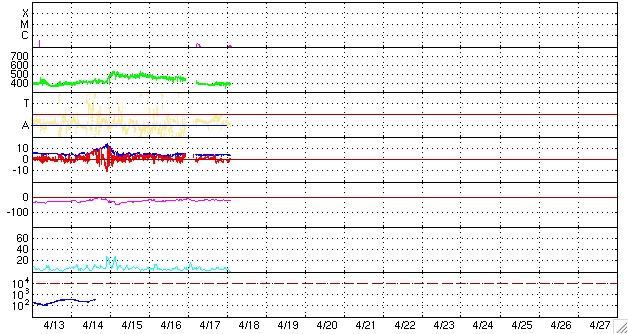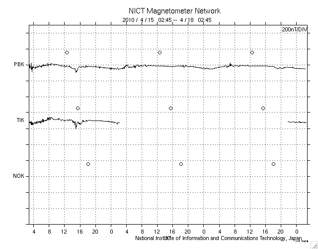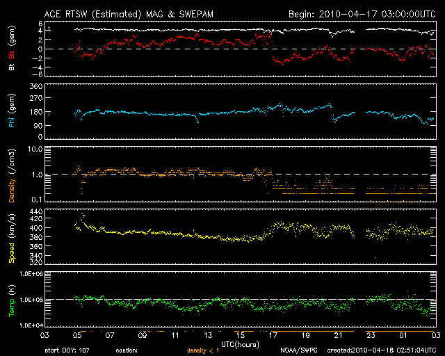 2010/ 4/18 11:51 更新 400km/秒と平均的な速度の太陽風が続いています。磁気圏も概ね静穏です。 担当 篠原 昨日のニュースの後、太陽風の速度は400km/秒と平均的なレベルに下がり、そのまま安定しています。 磁場強度も、4nTで安定しています。 ACEのグラフを見ると、18日2時(世界時17日17時)に太陽風の密度が急に減少しています。 同時に、磁場の南北成分は北寄りから南寄りに転じ、 平坦だった速度のグラフも小幅ですが変動するなど、太陽風の様子が切り替わっています。 しかし、変化としては小さく、特に目立った影響はありません。 オーロラ活動を示すAE指数は、太陽風の磁場が南寄りになったことで、 図の後半に小さな変動が見られますが、全体としては静穏です。 この後も、現在のような穏やかな太陽風が続くでしょう。 SOHO EIT195の太陽コロナ写真を見ると、太陽の南北両側に見られるコロナホールは、 太陽の中心線に達しつつあります。 このため、これから3〜4日後くらいに速度の高い太陽風がやって来る可能性があります。 コロナホールの緯度がやや高めなので、どの程度の影響がやって来るか注目してください。 放射線帯の高エネルギー電子は、低いレベルで安定しています。 太陽は、無黒点ですが、B2の小さなフレア活動が発生しています。 SOHO EIT195で、太陽の東端の向こう側に見える活動領域で発生した様です。 フレア後のコロナガスの噴き上がりをEIT195の動画で見ることができます。 CMEになりそうですが、コロナグラフではまだ見ることができませんでした。 この活動領域が太陽のこちら側に回ってくるまで、もう少し待たされそうですが、 どのような活動度となるでしょうか。 SOHO EIT195による太陽コロナ。18日11時半(世界時18日2時半)。 (c) SOHO (ESA & NASA) ![]() SOHOによる太陽可視光写真。 (c) SOHO (ESA & NASA) ![]() ACEが観測した太陽風の磁場(1番上の枠、白線は全体の強度、赤線は南北成分) および、太陽風の密度(3番目の橙線)、速度(4番目の黄線) (c) NOAA/SWPC ![]() リアルタイムAE指数 下段のAEグラフの値が高くなると、オーロラ活動が活発化しています。 (c) 京都大学, NICT ![]() シベリアで観測された3日間の磁場データ 右側の3分の1が、昨日のデータになります。グラフが上がったり下がったりすると、オーロラ活動が活発化しています。 (c) NICT ![]() 27日の太陽周期に合わせたデータプロット 太陽が同じ面を地球に向けていた27日前の変化から、今後を予想することができます。 (c) NICT