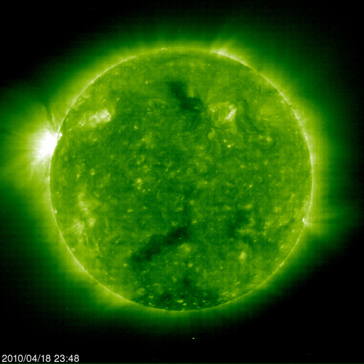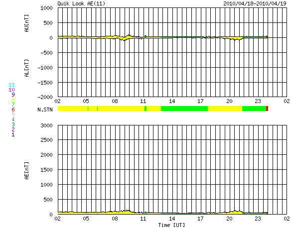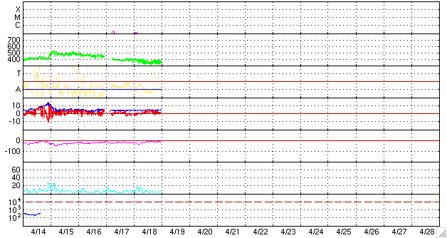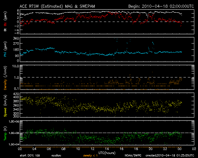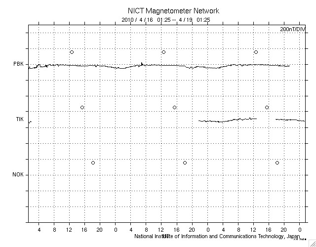 2010/ 4/19 10:25 更新 低速で、密度の低い太陽風になっています。太陽は無黒点です。 担当 篠原 太陽風は速度が350km/秒に下がり、低速風となっています。 特にこの1日半ほど、プラズマの密度が大きく減少しています。 そのため、速度の誤差が大きくなり、グラフが普段よりも拡散しています。 図の様子では、プラズマ密度は回復に向かっているようです。 磁場強度は、4〜5nTと普通の強さで安定しています。 南北成分は北寄りが続いていて、このため磁気圏の活動はほとんど見られず、静穏です。 AE指数はずっと平坦です。 SOHO EIT195のコロナホールは、太陽の中心線を越えて、西半球に入ってきました。 3日後くらいに太陽風が強まる可能性があります。 太陽は、今日も無黒点です。 EIT195の東端には、太陽の向こう側にある活動領域が明るく光っています。 明るい部分が高く迫り出していて、迫力があります。 ここに黒点はできているでしょうか。 SOHO EIT195による太陽コロナ。19日9時(世界時19日0時)。 (c) SOHO (ESA & NASA) ![]() SOHOによる太陽可視光写真。無黒点です。 (c) SOHO (ESA & NASA) ![]() ACEが観測した太陽風の磁場(1番上の枠、白線は全体の強度、赤線は南北成分) および、太陽風の密度(3番目の橙線)、速度(4番目の黄線) (c) NOAA/SWPC ![]() リアルタイムAE指数 下段のAEグラフの値が高くなると、オーロラ活動が活発化しています。 (c) 京都大学, NICT ![]() シベリアで観測された3日間の磁場データ 右側の3分の1が、昨日のデータになります。グラフが上がったり下がったりすると、オーロラ活動が活発化しています。 (c) NICT ![]() 27日の太陽周期に合わせたデータプロット 太陽が同じ面を地球に向けていた27日前の変化から、今後を予想することができます。 (c) NICT