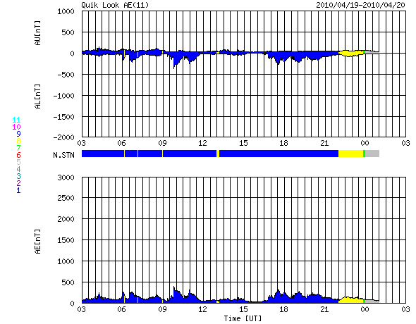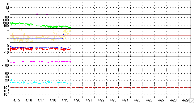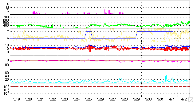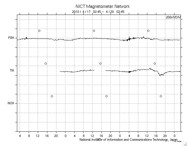 ACEが観測した太陽風の磁場(1番上の枠、白線は全体の強度、赤線は南北成分) および、太陽風の密度(3番目の橙線)、速度(4番目の黄線) (c) NOAA/SWPC ![]() リアルタイムAE指数 下段のAEグラフの値が高くなると、オーロラ活動が活発化しています。 (c) 京都大学, NICT ![]() シベリアで観測された3日間の磁場データ 右側の3分の1が、昨日のデータになります。グラフが上がったり下がったりすると、オーロラ活動が活発化しています。 (c) NICT ![]() 27日の太陽周期に合わせたデータプロット 太陽が同じ面を地球に向けていた27日前の変化から、今後を予想することができます。 (c) NICT