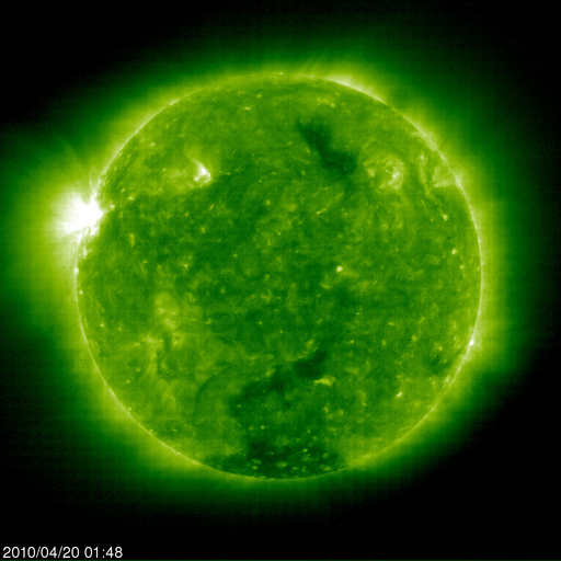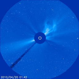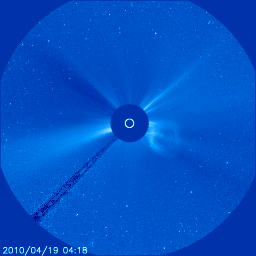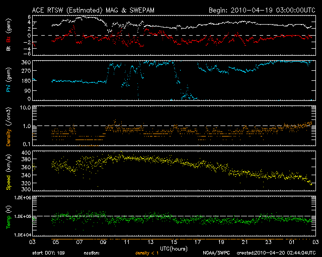 2010/ 4/20 11:45 更新 太陽風は300km/秒台前半の低速風になっています。 担当 篠原 穏やかな宇宙天気が続いています。 太陽風は、速度が330km/秒へ下がり、一段と低速風に変わっています。 磁場強度も、3nT前後と弱めになってきました。 27日周期の図を見ると、前周期もこの頃は300km/秒を割るほどの低速風になっていて、 その分布が残っているようです。 一方、太陽風磁場の南北成分は、弱い南向きになっています。 この影響で、極域では弱いオーロラ活動が続いています。 AE指数では、200nTほどの変動が連続して見られます。 このまま、明日くらいまでは静穏に過ぎていくでしょう。 明後日くらいから、コロナホールの影響で太陽風に変化が見られるかもしれません。 コロナホールの分布する緯度がやや高めなので、あまり強い高速風にはならないと思います。 どの程度地球へやって来るのか、注目してください。 また、SOHO LASCO C3によると、 太陽の南西と北西の2方向に連続してCME(太陽ガスの放出現象)が発生しています。 STEREOと比較すると、どちらも太陽の向こう側の現象で、地球への影響はありません。 SOHO EIT195の東端で明るく輝いていた活動領域が、太陽面のこちら側に回ってきました。 しかし、そこには白斑が見えるだけで、黒点はできていないようです。 X線のグラフも静穏で、特に活動は起こしていないようです。 もうしばらく様子を見る必要がありますが、 ここに黒点が無いようだと、無黒点はもうしばらく続きそうです。 SOHO EIT195による太陽コロナ。20日11時(世界時20日2時)。 (c) SOHO (ESA & NASA) ![]() SOHOによる太陽可視光写真。東端に白斑が現れました。 (c) SOHO (ESA & NASA) ![]() SOHO衛星のLASCO C3カメラの映像 (c) SOHO (ESA & NASA)