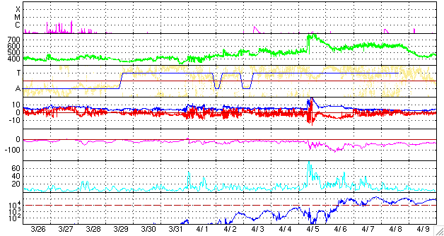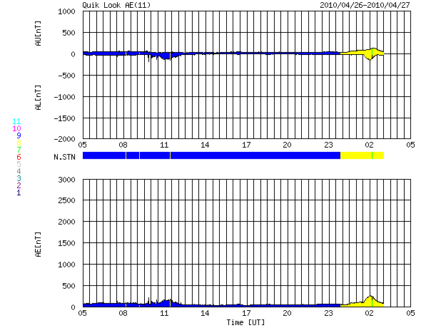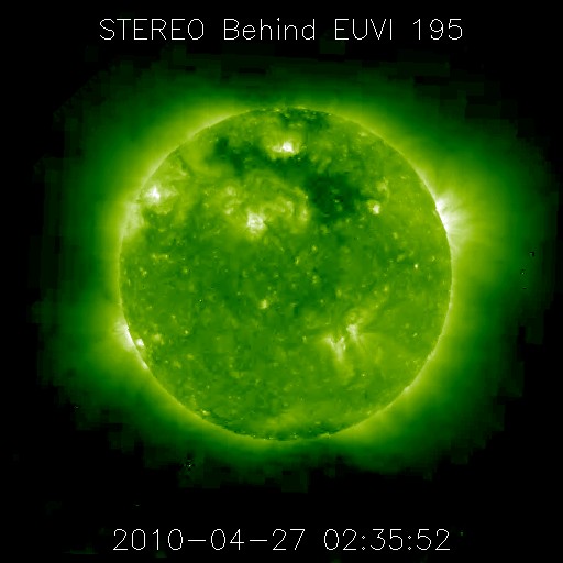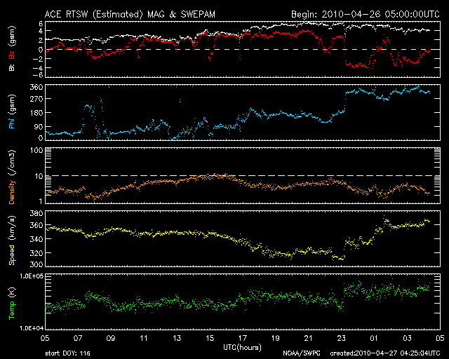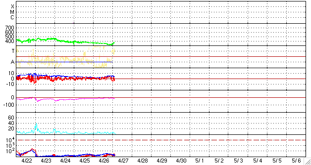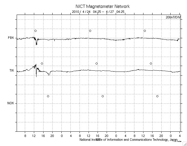 2010/ 4/27 13:25 更新 穏やかな太陽風が続いています。無黒点も続いています。 担当 篠原 太陽風の速度は、昨夜、一旦320km/秒まで下がりましたが、 今朝から、再び360km/秒へ上がり、やや遅い速度の風が続いています。 磁場強度は、4〜5nTと平均的な強さです。 磁気圏も静穏です。 今朝以降の南向き磁場の影響で、小規模のオーロラ活動が観測されそうですが、 速度が低めなので、規模は小さいままでしょう。 27日周期の図で前周期の変化を見ると、 4月2日頃から太陽風の速度が高まり、以降、高速風が続いています。 この高速風が、明後日、29日くらいに回帰してくる可能性があります。 ただし、昨日掲載したSOHO EIT195では、 太陽の中心付近に特にコロナホールなどは見られませんでした。 これは前周期も同じで、高速風の原因がはっきりと分からなかったのです。 今回、回帰が見られるかどうかも含めて、今後の変化に注目してください。 なお、前周期の4月5日以降の大きな変動は、CMEの影響によるものです。 これは突発的な現象ですでの、4月5日以降の太陽風の変化は参考にしないで下さい。 そのSOHO衛星は、キーホールの期間を迎えたようで、 EIT195はメンテナンスに入っていて、写真の更新がありません。 今日は、STEREO Behindのコロナ写真を掲載します。 SOHOの写真で太陽の東端に顔を見せていたコロナホールが、 この写真では太陽の中央を東西に大きく横切っています。 この様子では、高速風としていずれ影響がやって来そうです。 太陽は今日も無黒点です。 STEREO Behindの写真にも特に明るい領域はなく、無黒点は続きそうです。 STEREO Behind EUVI195による太陽コロナ。地球よりも5日分ほど先回りをして太陽を見ています。 (c) NASA ![]() SOHOによる太陽可視光写真。今日も無黒点です。 (c) SOHO (ESA & NASA) ![]() ACEが観測した太陽風の磁場(1番上の枠、白線は全体の強度、赤線は南北成分) および、太陽風の密度(3番目の橙線)、速度(4番目の黄線) (c) NOAA/SWPC ![]() リアルタイムAE指数 下段のAEグラフの値が高くなると、オーロラ活動が活発化しています。 (c) 京都大学, NICT ![]() シベリアで観測された3日間の磁場データ 右側の3分の1が、昨日のデータになります。グラフが上がったり下がったりすると、オーロラ活動が活発化しています。 (c) NICT ![]() 27日の太陽周期に合わせたデータプロット 太陽が同じ面を地球に向けていた27日前の変化から、今後を予想することができます。 (c) NICT
