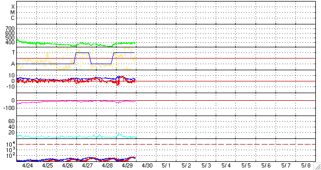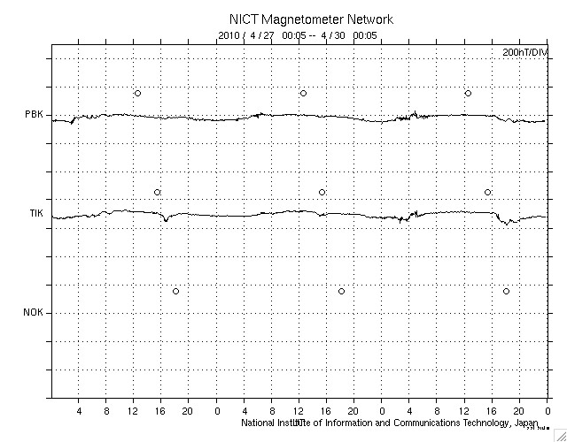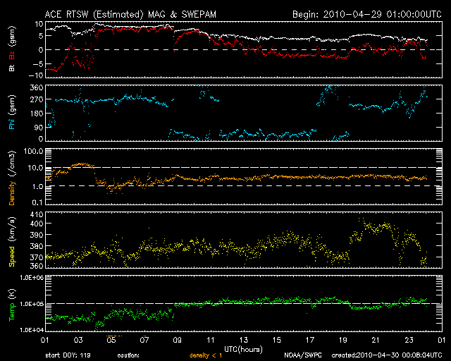 2010/ 4/30 09:08 更新 1063黒点群は消えています。太陽風は穏やかです。コロナホールが太陽の中心線に達したようです。 担当 篠原 1063黒点群はあっさりと消え、太陽は無黒点に戻ってしまいました。 静かな太陽が続いています。 太陽風は、昨日のニュースでは、 磁場強度とプラズマ密度の高まりにより、速度が上がるかもと書きましたが、 ニュース以降も磁場強度は8nTに強まったままでしたが、 速度は特に変化なく、現在まで380km/秒で安定しています。 磁場強度も昨夜には5nTと平均レベルに下がり、 今回は、太陽風の強まりは来ませんでした。 磁気圏では、昨日のニュースで見えていた南向きの太陽風磁場の影響で、 中規模のオーロラ活動が一時的に発生しました。 しかし、その後は太陽風が大きく乱れることもなく、磁気圏活動は穏やかです。 今日も、昨日に続いてGOES-14のX線画像を掲載します。 北半球に大きく広がるコロナホールが、太陽の中心線に達したようです。 (写真では、太陽の南北の軸が右に傾いています) これから3〜4日後くらいに、高速風がやって来ると思われます。 STEREOの写真でコロナホールが比較的濃く見えていたことや、 東西に長く延びていることなどから、 速度の高い風が、5日くらいの規模でやって来るかもしれません。 コロナホールの大きさは、27日前と比べるとずいぶん広がっています。 このため、27日周期の図の前周期の太陽風の変化が予想に使えません。 来週の太陽風の変化に注目してください。 GOES-14のX線カメラによる太陽コロナ。この写真では、太陽の南北軸が少し右に傾いています。 (c) NOAA ![]() SOHOによる太陽可視光写真。無黒点に戻りました。 (c) SOHO (ESA & NASA) ![]() GOES衛星の太陽X線データ (c) NOAA/SWPC ![]() ACEが観測した太陽風の磁場(1番上の枠、白線は全体の強度、赤線は南北成分) および、太陽風の密度(3番目の橙線)、速度(4番目の黄線) (c) NOAA/SWPC ![]() リアルタイムAE指数 下段のAEグラフの値が高くなると、オーロラ活動が活発化しています。 (c) 京都大学, NICT ![]() シベリアで観測された3日間の磁場データ 右側の3分の1が、昨日のデータになります。グラフが上がったり下がったりすると、オーロラ活動が活発化しています。 (c) NICT ![]() 27日の太陽周期に合わせたデータプロット 太陽が同じ面を地球に向けていた27日前の変化から、今後を予想することができます。 (c) NICT