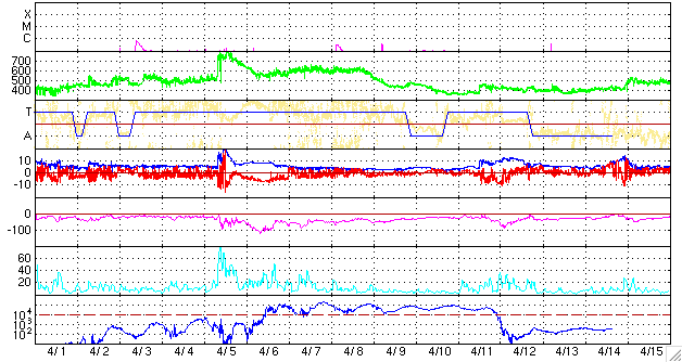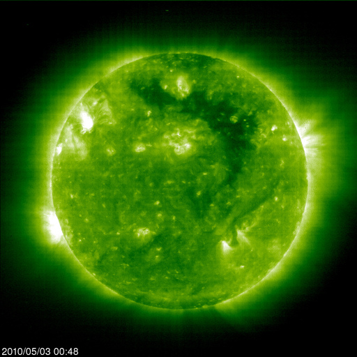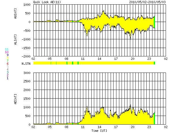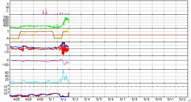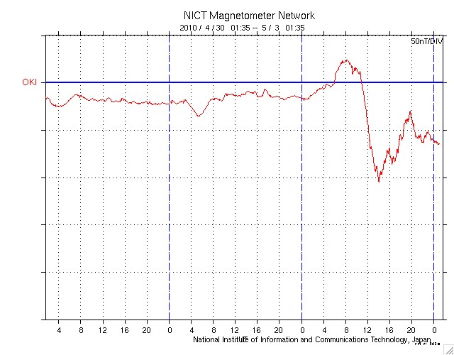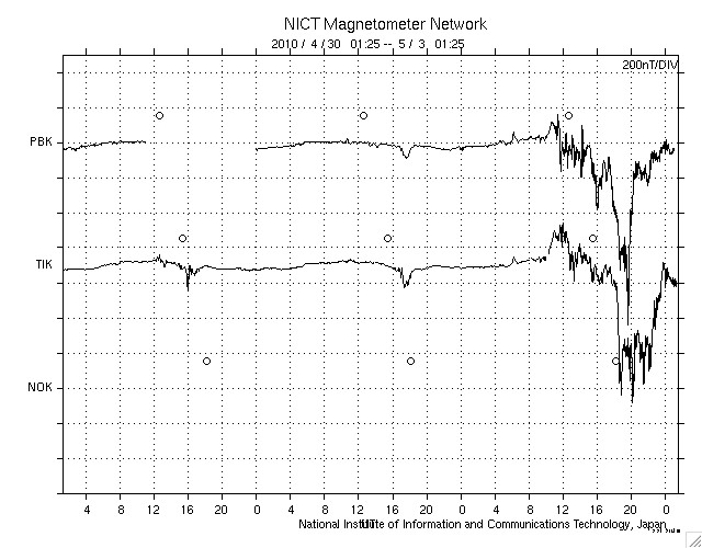 2010/ 5/ 3 10:20 更新 速度650km/秒の高速太陽風が到来しました。磁気圏活動も活発化し、磁気嵐が発生しています。 担当 篠原 コロナホールによる高速の太陽風が始まりました。 昨日、2日14時(世界時2日5時)くらいから、 太陽風の磁場強度が10nTに、プラズマの密度が10個/cm^3くらいに高まりました。 そして、2日19時(世界時1日10時)には、磁場強度は20nT近くにまで強まりました。 この頃から太陽風の速度もゆっくりと上昇を始め、 300km/秒台から、3日0時(世界時3日15時)には、600km/秒を超えるほどに上昇しています。 それから半日ほど、現在まで650km/秒近い高速風が安定して続いています。 コロナホール起源で600km/秒台に達する高速風は久しぶりです。 速度が上がりきるとともに、磁場強度は弱まって、7nTほどに下がっています。 しかし、まだ平均よりも高めで、高速風領域の前半にいると思われます。 磁場強度が強まった頃に、磁場の南北成分が-15nTと強い南向きになりました。 南向き磁場は強まったり弱まったりしながら、5時間ほど強い南向きが続きました。 この影響で、磁気圏が大きく活動しています。 オーロラの活動度を示すAE指数は、 昨夜以降、500〜1000nTの中規模変動をずっと続けています。 また、沖縄の磁場データは青線の静穏レベルから-100nTくらいまで下がっており、 中規模の磁気嵐が発生しています。 太陽風の磁場強度は、7nTへ下がっていますが、 南北成分の南寄りの傾向は続いています。 速度がかなり高まっているために、磁気圏への影響は大きくなっていて、 活発なオーロラの活動はこの後も続きそうです。 SOHO EIT195の太陽コロナ写真の更新が再開されています。 高速風の発生源であるコロナホールは、 太陽の西側の低緯度から、東側の高緯度域へ東西に長く延びています。 緯度が次第に高くなっているため、影響度は次第に弱まりそうですが、 太陽風の変動はこれから5日くらいは続きそうです。 しばらくにぎやかな活動が見られるでしょう。 放射線帯の高エネルギー電子は、現在は低い値です。 しかし、高速太陽風の影響でこれから上昇を始めると思われます。 明日以降の変化に注目してください。 太陽では、北東(左上)の小さな黒点に1067黒点群という番号が付けられました。 5月1日のニュースで、1064黒点群について報告しましたが、 その間に、太陽の南半球に、1065、1066黒点群という小さな黒点が一時的に発生したようです。 現在のSOHOの可視光写真には、これらの黒点は見えていません。 X線グラフでは、Bクラスの小さな変化が度々見えていますが、 C5.7のフレアを起こした1057黒点群は、その後は活動度を下げているようです。 SOHO EIT195による太陽コロナ。3日10時(世界時3日1時)。 (c) SOHO (ESA & NASA) ![]() SOHOによる太陽可視光写真。東端に1067黒点群が見えます。 (c) SOHO (ESA & NASA) ![]() GOES衛星の太陽X線データ (c) NOAA/SWPC ![]() ACEが観測した太陽風の磁場(1番上の枠、白線は全体の強度、赤線は南北成分) および、太陽風の密度(3番目の橙線)、速度(4番目の黄線) (c) NOAA/SWPC ![]() リアルタイムAE指数 下段のAEグラフの値が高くなると、オーロラ活動が活発化しています。 (c) 京都大学, NICT ![]() シベリアで観測された3日間の磁場データ 右側の3分の1が、昨日のデータになります。グラフが上がったり下がったりすると、オーロラ活動が活発化しています。 (c) NICT ![]() 沖縄の磁場擾乱 下へ下がるほど、擾乱が発達している事を意味します。 (c) NICT ![]() 27日の太陽周期に合わせたデータプロット 太陽が同じ面を地球に向けていた27日前の変化から、今後を予想することができます。 (c) NICT