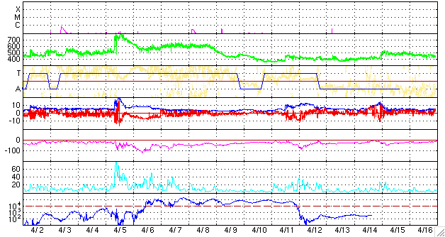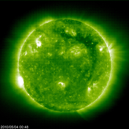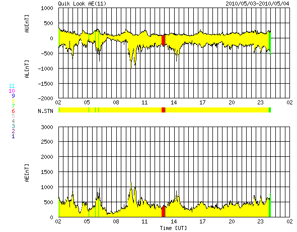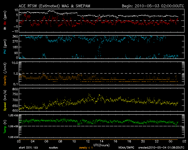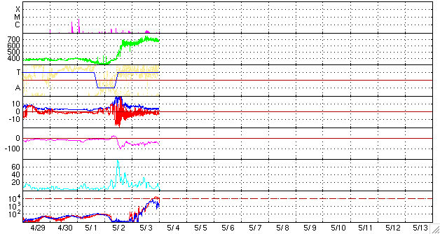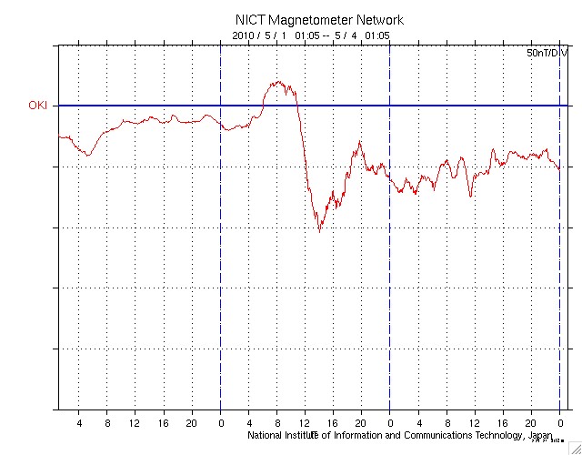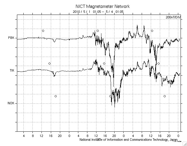 2010/ 5/ 4 10:10 更新 太陽風の速度は700km/秒にまで上昇しました。オーロラ活動が続き、放射線帯も増加しています。 担当 篠原 コロナホールによる高速の太陽風が始まりました。 コロナホールによる高速太陽風は、昨日の午後からもう一段速度が上昇し、 3日21時(世界時3日12時)頃に700km/秒に達しました。 6時間ほどこの速度を保った後、少し下がって、現在は670km/秒くらいです。 速度が上がったのと反対に、磁場強度は一段下がり、 7nTから4nTへ弱まっています。 高速太陽風は、最高速度の領域に達しているようです。 太陽風磁場の南北成分は、南寄りの傾向が続いています。 ただし、磁場強度の弱まりとともに、南向きの振幅も次第に弱まっていて、 速度は上がりましたが、地球への影響は弱まっています。 AE指数のグラフは、500〜1000nTの中規模の変化から、 500nT前後の小規模活動が中心に変わっています。 また、磁気嵐の発生を観測した沖縄の磁場データは、 1日経って、-50nTほどの低下へと回復しています。 太陽風の磁場強度が弱まってきたことから、 高速風の最も激しい領域は通過したと思われます。 SOHO EIT195の写真にあるように、今回のコロナホールは東西に長いため、 太陽風の高速状態は、更に4〜5日ほど続きそうです。 しかし、速度や地球への影響は、次第に弱まっていくでしょう。 今回の高速風の影響で、放射線帯の高エネルギー電子が増加しています。 今日の図では、警戒レベルの10,000に近づいています (GOESの図の下側の紫色の線に注目してください)。 現在の磁気圏の様子では、明日には警戒レベルに達しそうです。 引き続き、増加に注意してください。 太陽では、一時的な眠りから再び目覚めたかの様に、 規模は小さいですが、黒点があちこちに発生しています。 昨日の1067黒点群に加えて、 今日は、南東(左下)に1068黒点群が出現しています。 また、太陽の北西(右上)には、数日前に消えていた1063黒点群が復活し、 昨日掲載の写真では見えなかった1066黒点群も、 太陽の中心からやや南で、再び黒点を発生させています。 X線のグラフによると、今のところ、目立ったフレア活動は起きていません。 EIT195の動画を見ると、再出現した1063黒点群が、 小さいながらも活動の気配を見せています。 この後、フレアを起こすかもしれません。 今回の黒点の活性化がどこまで続くのか、じっくりと眺めていきましょう。 SOHO EIT195による太陽コロナ。4日10時(世界時4日1時)。 (c) SOHO (ESA & NASA) ![]() SOHOによる太陽可視光写真。小さい黒点群があちこちに見えます。 (c) SOHO (ESA & NASA) ![]() ACEが観測した太陽風の磁場(1番上の枠、白線は全体の強度、赤線は南北成分) および、太陽風の密度(3番目の橙線)、速度(4番目の黄線) (c) NOAA/SWPC ![]() リアルタイムAE指数 下段のAEグラフの値が高くなると、オーロラ活動が活発化しています。 (c) 京都大学, NICT ![]() シベリアで観測された3日間の磁場データ 右側の3分の1が、昨日のデータになります。グラフが上がったり下がったりすると、オーロラ活動が活発化しています。 (c) NICT ![]() 沖縄の磁場擾乱 下へ下がるほど、擾乱が発達している事を意味します。 (c) NICT ![]() 27日の太陽周期に合わせたデータプロット 太陽が同じ面を地球に向けていた27日前の変化から、今後を予想することができます。 (c) NICT