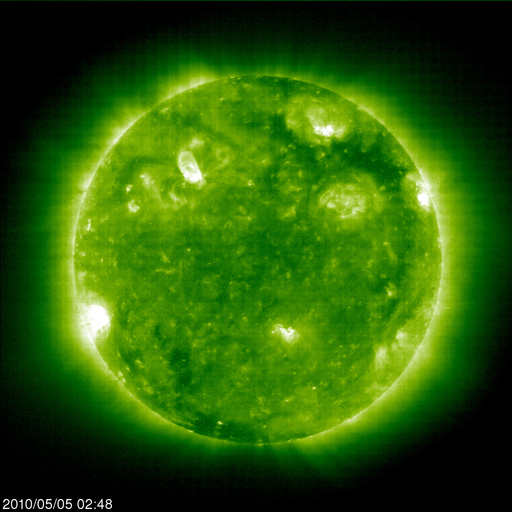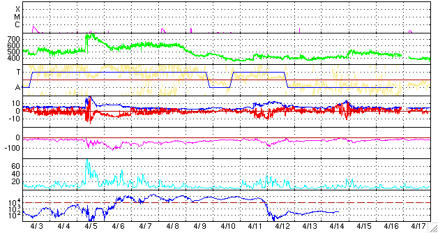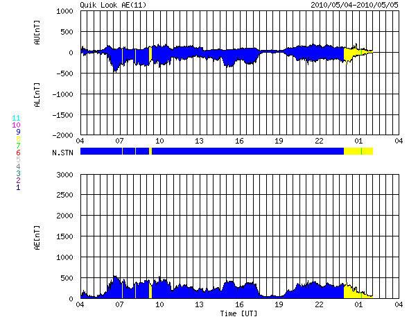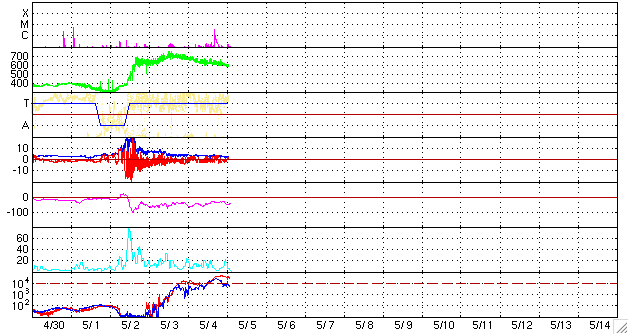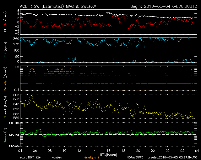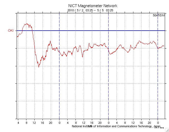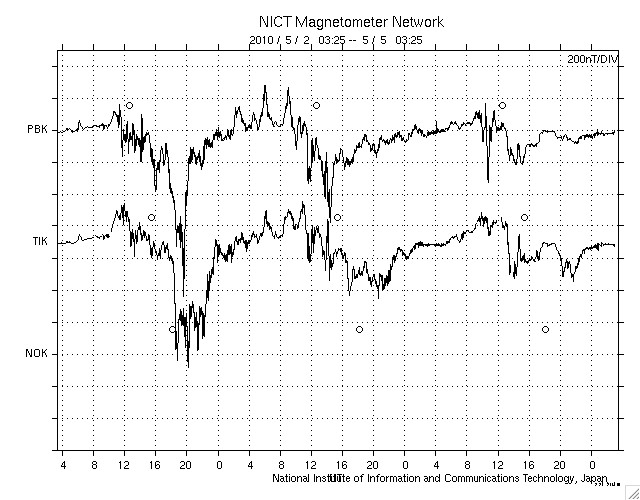 2010/ 5/ 5 12:27 更新 高速風は次第に弱まり、600km/秒台を割りました。新しい1069黒点群が、C3.6のフレアを起こしました。 担当 篠原 5月2日より3日間にわたって自動更新が停止し、申し訳ありませんでした。 今日以降は、通常の運用態勢に戻ります。 高速の太陽風が続いています。 速度は、3日から4日にかけて達した700km/秒を最高に、その後はゆっくりと下がり続け、 今朝、600km/秒台を割って、現在は590km/秒です。 下がってきたとは言え、依然、高い速度が続いています。 磁場強度も、だいぶ弱まってきました。 昨日の4nTから、現在は2nTに下がっています。 高速風は、中盤から、後半へと移ってきたようです。 ただし、今回のコロナホールは、東西に長く延びていたため、 最後尾が昨日太陽の中心線を越えたくらいです。 従って、まだ3〜4日程度は高速風が残る可能性があります。 引き続き注意してください。 太陽風磁場の南北成分は、振幅は小さくなったものの、 南寄りの傾向が続いています。 このため、AE指数で300〜500nTくらいの小規模のオーロラ活動が、 現在も連続的に発生しています。 現在、太陽風は速度、磁場強度ともに弱まる傾向にあります。 磁気圏の活動も、規模は次第に小さくなっていくでしょう。 高速風による磁気圏の擾乱が一息ついた頃に影響が強まってくるのが、 放射線帯の高エネルギー電子です。 昨日より一段増加して、10,000の警戒レベルを超えました。 増加の勢いはだいたい止まった様に見えるので、 ここから更に大きく増えることはなさそうです。 一旦増加すると、数日間に渡って高い状態が続きます。 衛星の運用などではしばらく注意が必要でしょう。 太陽の黒点出現ラッシュは続いています。 今日は、北西(右上)に1069黒点群が現れていて、 早速、5日1時(世界時4日16時)に、C3.6の小規模フレアを起こしています。 1069群は、磁場の構造も一段複雑なレベルに分類されていて、 引き続きフレア活動を起こす可能性があります。 その他の黒点は、中心から北東(左上)の1067黒点群が見えるだけの様です。 SOHO EIT195による太陽コロナ。5日12時(世界時5日3時)。 (c) SOHO (ESA & NASA) ![]() SOHOによる太陽可視光写真。北西に、1069黒点群が現れました。 (c) SOHO (ESA & NASA) ![]() ACEが観測した太陽風の磁場(1番上の枠、白線は全体の強度、赤線は南北成分) および、太陽風の密度(3番目の橙線)、速度(4番目の黄線) (c) NOAA/SWPC ![]() リアルタイムAE指数 下段のAEグラフの値が高くなると、オーロラ活動が活発化しています。 (c) 京都大学, NICT ![]() シベリアで観測された3日間の磁場データ 右側の3分の1が、昨日のデータになります。グラフが上がったり下がったりすると、オーロラ活動が活発化しています。 (c) NICT ![]() 沖縄の磁場擾乱 下へ下がるほど、擾乱が発達している事を意味します。 (c) NICT ![]() 27日の太陽周期に合わせたデータプロット 太陽が同じ面を地球に向けていた27日前の変化から、今後を予想することができます。 (c) NICT