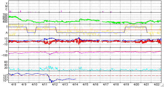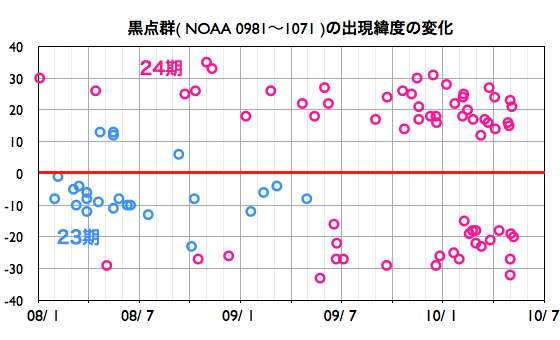 図の2枚目は、黒点群の出現と緯度の推移です。 これを見ると、黒点群の出現頻度や緯度分布に特に変わった様子はなく、 南北両半球で、中低緯度域に広く黒点群が現われ続けています。 4月に無黒点の日が多くなったのは、たまたまなのかもしれません。 引き続き、ゆっくりと見ていきましょう。 1069黒点群は太陽の向こう側に沈んでいきました。 活動は続いていて、Bクラスの変化がX線で観測されています。 ただし、これは活動領域が向こう側に没しかけての観測ですので、 本当の規模はもう少し大きかったと思われます。 1069群が見えなくなり、現在の太陽は無黒点です。 太陽風の速度は、昨日のニュース以降も低下して、360km/秒と低速風に変わっています。 磁場強度は、2nTと弱まっていたものが、今朝に入って4nTとやや回復しています。 磁気圏も静穏になり、AE指数には小さな変化が所々見られる程度です。 今後の太陽風は、基本的に穏やかな状態で推移しそうです。 ただし、昨日の記事に書いたように、 12日頃に、前周期の速度の小さな高まりが回帰するかもしれません。 放射線帯の高エネルギー電子は、今日も10,000を保っています。 太陽風が落ち着いたため、ここからの減少はゆっくりになりそうです。 2006年7月以降の、月ごとの無黒点日数の変化 (c) 作図 : 宇宙天気ニュース、データ : SIDC ![]() 2008年1月以降に出現した太陽黒点の緯度の変化。 (c) 作図 : 宇宙天気ニュース、データ : NOAA ![]() SOHO EIT195による太陽コロナ。10日10時(世界時10日1時)。 (c) SOHO (ESA & NASA) ![]() SOHOによる太陽可視光写真。無黒点です。 (c) SOHO (ESA & NASA) ![]() GOES衛星の太陽X線データ (c) NOAA/SWPC ![]() ACEが観測した太陽風の磁場(1番上の枠、白線は全体の強度、赤線は南北成分) および、太陽風の密度(3番目の橙線)、速度(4番目の黄線) (c) NOAA/SWPC ![]() リアルタイムAE指数 下段のAEグラフの値が高くなると、オーロラ活動が活発化しています。 (c) 京都大学, NICT ![]() 27日の太陽周期に合わせたデータプロット 太陽が同じ面を地球に向けていた27日前の変化から、今後を予想することができます。 (c) NICT