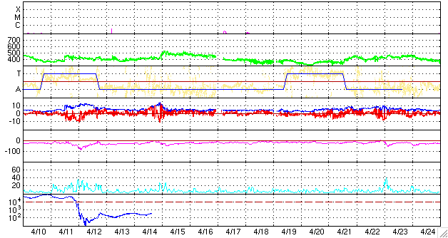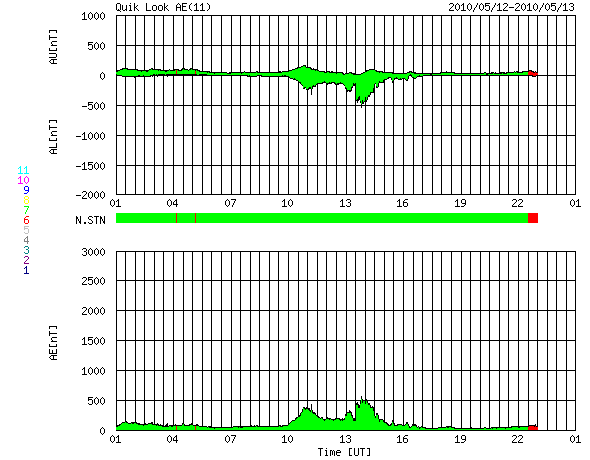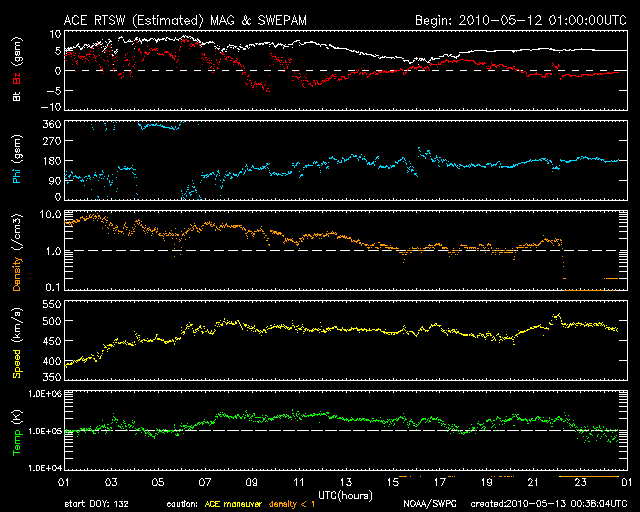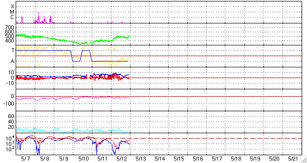 2010/ 5/13 09:38 更新 太陽風の速度は500km/秒弱くらいに上がっています。太陽は無黒点です。 担当 篠原 昨日の昼ごろより、太陽風の速度は一段上昇して、480km/秒ほどになりました。 そのまま、現在まで500km/秒弱くらいで安定しています。 27日周期の図を見ると分かりますが、 前周期(4月15日)とほぼ同じタイミングに、同程度の速度の高まりがやって来ました。 昨日のニュースの頃に見られていたプラズマ密度の高まりは、 速度上昇につながる変化だったようです。 速度が上がり始めるとともにこちらは低下して、通常の密度に戻っています。 磁気圏は比較的静穏です。 オーロラの活動度を示すAE指数を見ると、 グラフの中ほどに、500nTの小規模の変化が発生しています。 しかし、その他の時間帯は静穏で、 これは、太陽風磁場の南北成分が概ね北寄りに推移しているためでしょう。 SOHO EIT195の太陽コロナ写真を見ると、 太陽の中心付近のコロナホールは、昨日よりも濃く写っています (見ている角度の違いによるのだと思います)。 この様子では、ここからの影響で、ある程度の速度上昇が見られるかもしれません。 2日後くらいに注目してください。 また、東端には南北の低緯度側にそれぞれコロナホールが見えています。 この低い角度でも見えていることを考えると、十分な濃さを持ったコロナホールの様です。 ただ、緯度がやや高めにあるためか、前周期は450km/秒程に速度が上がった程度でした。 今回はどうなるか、数日経ってコロナホールがはっきり見えてくると、 前周期との比較もできるでしょう。 放射線帯高エネルギー電子は、昨日の時点で大きく減少しました。 今日は、警戒レベルを割っています。 太陽では新たな黒点の出現はなく、無黒点が続いています。 X線のグラフには、Bクラスの小さな活動が見られていますが、 これらは西の端近くにあった活動領域が起こしていた現象です。 現在は西の端にほぼ没していて、地球からはもう見えなくなります。 EIT195の太陽画像は、明るい領域がほぼ見られなくなり、穏やかな印象です。 しかし、中央部や東端付近には、コロナホールの暗い領域がいくつか見えていて、 一頃の、全く何にもなかった太陽よりはましな感じです。 SOHO EIT195による太陽コロナ。13日9時(世界時13日0時)。 (c) SOHO (ESA & NASA) ![]() SOHOによる太陽可視光写真。無黒点です。 (c) SOHO (ESA & NASA) ![]() ACEが観測した太陽風の磁場(1番上の枠、白線は全体の強度、赤線は南北成分) および、太陽風の密度(3番目の橙線)、速度(4番目の黄線) (c) NOAA/SWPC ![]() リアルタイムAE指数 下段のAEグラフの値が高くなると、オーロラ活動が活発化しています。 (c) 京都大学, NICT ![]() 27日の太陽周期に合わせたデータプロット 太陽が同じ面を地球に向けていた27日前の変化から、今後を予想することができます。 (c) NICT