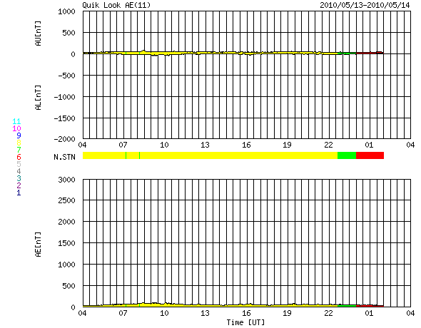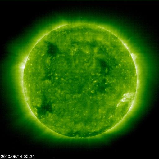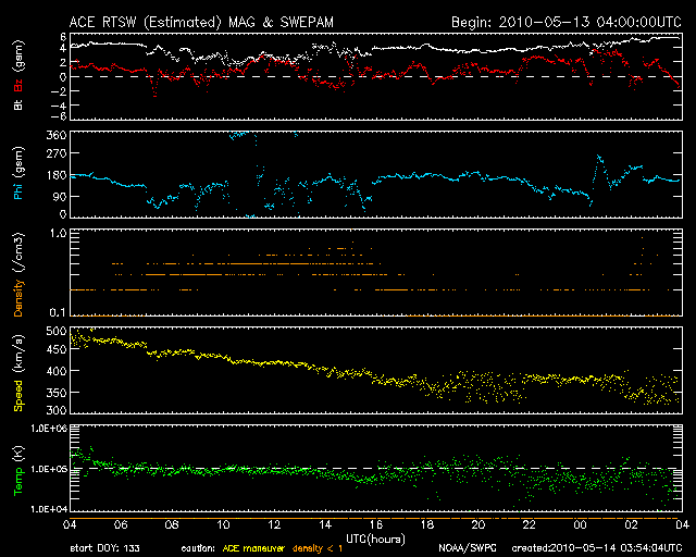 2010/ 5/14 12:54 更新 太陽風の速度は下がり、磁気圏も穏やかです。明日くらいに次の速度上昇がやって来るかもしれません。 担当 篠原 500km/秒弱に上がっていた太陽風の速度は、昨日のニュースの後に低下を始め、 昨夜のうちに400km/秒と通常の速度まで下がりました。 それとともにプラズマの密度が大きく下がっていて、 この影響で速度データが分散し始めています(測定の誤差が大きくなっています)。 太陽風の磁場強度は4nTほどで、平均的な状態です。 南北成分は、0nTから北寄りに推移しています。 このため、磁気圏は静穏な状態を保っています。 今日のAE指数は、全く変化が見られません。 小規模の速度の高まりは早くも終わり、今日いっぱいは穏やかな状態が続きそうです。 そして、明日くらいからは、次のコロナホールの影響がやって来そうです。 今日のSOHO EIT195でも、西半球側の赤道付近にはっきりと見えています。 地球へやって来る高速太陽風は、 コロナホールが太陽の中心付近を通過した時に、既に地球へ向かって飛び出しています。 本当にやって来るかどうかはこれからですが、 可能性としては、今、この風は太陽から地球への途上にあるわけです。 EIT195では、東側の南北両半球のコロナホールも濃くはっきりと見えています。 どちらも緯度が高めのため、地球へ影響が届くかどうかははっきり分かりませんが、 高速風の発生源としては十分な見え方をしています。 こちらは、まだ6日ほど先のことです。 放射線帯高エネルギー電子は、やや高めの状態を保っていますが、 既に10,000の線は割っています。 ただし、明日以降の太陽風の様子では、再び増加する可能性があります。 太陽は無黒点のままです。 太陽のこちら側には目立った活動領域はなく、 STEREO Behindで少し離れた東側にやや活動的な領域が見られる程度です。 無黒点はしばらく続くかもしれません。 SOHO EIT195による太陽コロナ。14日11時半(世界時14日2時半)。 (c) SOHO (ESA & NASA) ![]() SOHOによる太陽可視光写真。無黒点です。 (c) SOHO (ESA & NASA) ![]() ACEが観測した太陽風の磁場(1番上の枠、白線は全体の強度、赤線は南北成分) および、太陽風の密度(3番目の橙線)、速度(4番目の黄線) (c) NOAA/SWPC ![]() リアルタイムAE指数 下段のAEグラフの値が高くなると、オーロラ活動が活発化しています。 (c) 京都大学, NICT ![]() 27日の太陽周期に合わせたデータプロット 太陽が同じ面を地球に向けていた27日前の変化から、今後を予想することができます。 (c) NICT