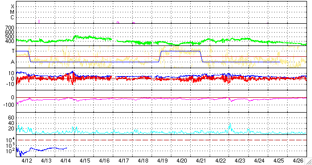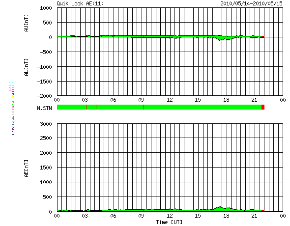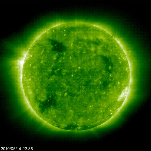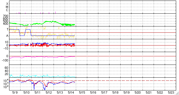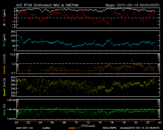 2010/ 5/15 08:18 更新 300km/秒台中盤の穏やかな太陽風が続いています。これから速度の上昇がやって来るかもしれません。 担当 篠原 太陽風は、340〜380km/秒と、300km/秒台中盤の穏やかな風が続いています。 プラズマの密度は、減った状態が続いていましたが、今朝くらいから戻り始めています。 磁場強度は、4〜5nTと平均的なレベルで安定しています。 南北成分は、南北にやや振れるようになっていますが、振幅は小さいです。 また、速度も遅いために地球への影響度は小さく、 AE指数は特に目立った変化をしていません。 地球の磁気圏も静穏です。 SOHO EIT195を見ると、コロナホールが太陽の西側の半分程度に進み、 地球へ高速風がやって来る目安のタイミングとなっています。 今日くらいに、太陽風速度の上昇が始まるかもしれません。 コロナホールの規模から考えると、やって来る変動は、それほど大きなものではなさそうです。 前周期には見られなかった変化なので、この後のACEのデータに注目して下さい。 放射線帯高エネルギー電子は、やや高めの状態で安定しています。 太陽風、磁気圏が静穏だと、減衰はとてもゆっくりです。 この後、太陽風の変化がやって来れば、 高エネルギー電子が大きく減少したり、その後再び強まったりという変化が見られます。 太陽は無黒点です。 可視光写真では、南西(右下)の端に白斑が微かに見える程度です。 SOHO EIT195による太陽コロナ。15日7時半(世界時14日22時半)。 (c) SOHO (ESA & NASA) ![]() SOHOによる太陽可視光写真。無黒点が続いています。 (c) SOHO (ESA & NASA) ![]() ACEが観測した太陽風の磁場(1番上の枠、白線は全体の強度、赤線は南北成分) および、太陽風の密度(3番目の橙線)、速度(4番目の黄線) (c) NOAA/SWPC ![]() リアルタイムAE指数 下段のAEグラフの値が高くなると、オーロラ活動が活発化しています。 (c) 京都大学, NICT ![]() 27日の太陽周期に合わせたデータプロット 太陽が同じ面を地球に向けていた27日前の変化から、今後を予想することができます。 (c) NICT