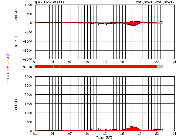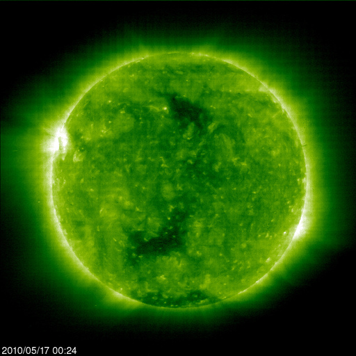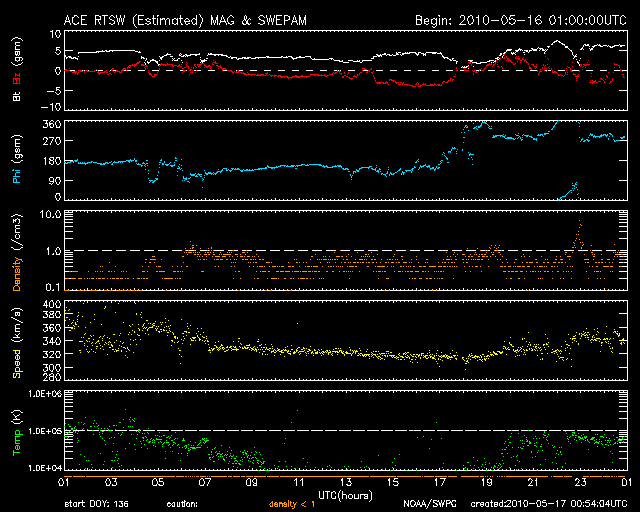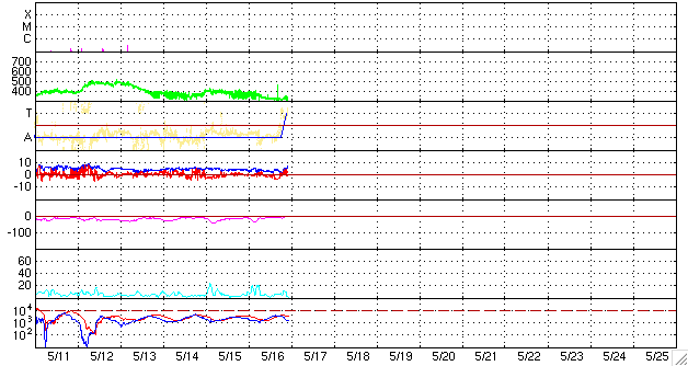 2010/ 5/17 09:54 更新 太陽風は低速(340km/秒)で、磁気圏も穏やかです。月と金星の大接近が見られました。 担当 篠原 宇宙天気とは関係ありませんが、昨夕、夕焼けの残る西の空で細い月と金星が大接近をしました。 鹿児島は晴天でしたので、じっくり観望することができました。 その時の写真を掲載します。 昨夕の月は、新月を過ぎたばかりのとても細い月でした。 そのため、月の大部分は、太陽の光が当たらない真っ黒な姿をしていましたが、 よく見るとそこには地球が反射した太陽の光が当たっていて、うっすらと光っているのです。 地球照と言います。 掲載の写真は、露出を長めにして、この地球照を目立たせました。 このため、月は満月のような姿に写っています。 昨夜の月と金星は、こんなにも近づいて見えたのです。 太陽風は低速状態が続いています。 昨日のニュース以降、速度は320km/秒まで下がりました。 今朝になって少し戻して、現在は340km/秒ほどです。 結局、コロナホールの影響は無かった様です。 磁気圏も静穏です。 太陽風磁場が弱い南向きになって、AE指数に200nTほどの変化を作っていますが、 その他はほとんど変化していません。 SOHO EIT195の太陽コロナを見ると、 南北に分かれたコロナホールは、太陽の自転とともに西へ進んでいます。 今、地球の方向へ速度の高い太陽風を吹き出しているはずです。 ただし、緯度が若干高めのため、 吹き出した風が地球に直接当たるのか、高緯度側に外れてしまうのか、 明後日くらいに、その結果が分かります。 太陽では、東の端に白斑が現れましたが、黒点はありません。 SOHOの磁場写真を見ると、強まった部分はほとんどなく、寂しい太陽になっています。 16日の夕方、夕暮れの西の空で月と金星が大接近しました。 (c) 篠原学 ![]() SOHO EIT195による太陽コロナ。17日9時半(世界時17日0時半)。 (c) SOHO (ESA & NASA) ![]() SOHOによる太陽可視光写真。東端に白斑が見えます。 (c) SOHO (ESA & NASA) ![]() ACEが観測した太陽風の磁場(1番上の枠、白線は全体の強度、赤線は南北成分) および、太陽風の密度(3番目の橙線)、速度(4番目の黄線) (c) NOAA/SWPC ![]() リアルタイムAE指数 下段のAEグラフの値が高くなると、オーロラ活動が活発化しています。 (c) 京都大学, NICT ![]() 27日の太陽周期に合わせたデータプロット 太陽が同じ面を地球に向けていた27日前の変化から、今後を予想することができます。 (c) NICT