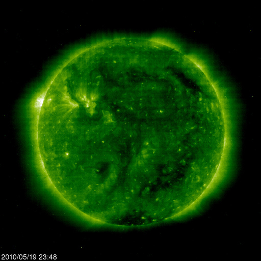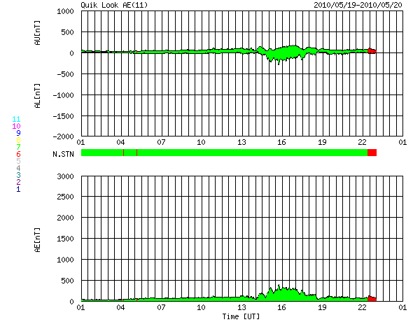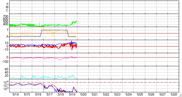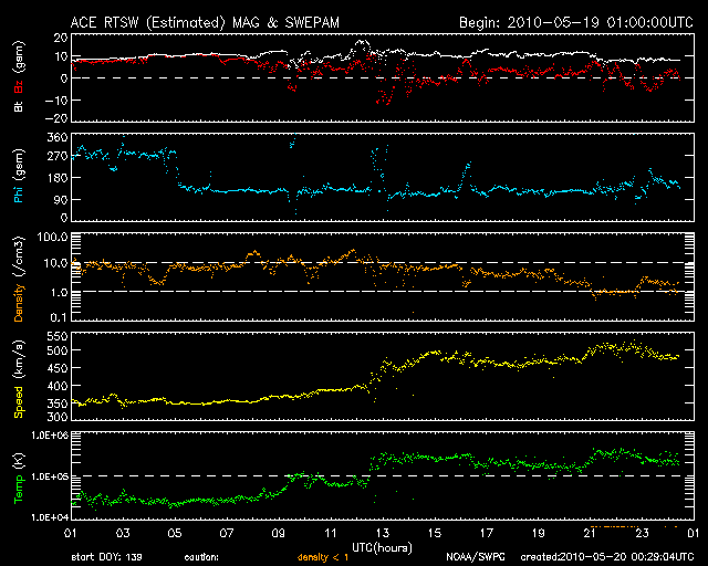 2010/ 5/20 09:29 更新 500km/秒の高速太陽風がやって来ました。磁気圏は静穏です。太陽は無黒点が続いています。 担当 篠原 昨夜、19日21時(世界時19日12時)頃から、太陽風の速度が上昇を始め、 500km/秒ほどの高速太陽風がやって来ました。 それから半日ほど経っていますが、現在もこの速度で安定しています。 昨日、8nTに強まっていた磁場強度は、その後10nTを超えるくらいにまで高まりました。 今朝になって少し下がっていますが、まだ、9nT程度の強さです。 この様子から、高速風の領域としてはまだ前半部にあり、 速度はもう一段上昇する可能性があります。 今回の変化が、北半球のコロナホールからの影響だと見ると、 これから南半球側のコロナホールの影響が加るのかもしれません。 引き続き、太陽風の変化に注目してください。 太陽風の磁場は強まりましたが、南北成分は、だいたい北寄りに推移しています。 このため、磁気圏への影響はあまり大きくありません。 AE指数では、一部の時間帯で300nTの変動が発生しただけで、その他は静穏です。 磁場の傾向がこのままであれば、この後も磁気圏活動は比較的穏やかに推移するでしょう。 しかし、磁場の傾向が逆向きに変われば、そこからオーロラは活動的になります。 今日のSOHO EIT195は、写真の明るさが下げられていて、 コロナホールの様子が見にくくなっています。 この写真では、南半球側のコロナホールは太陽の中心線を完全に通過した様です。 このため、高速風の影響は、これから4日くらい先までと見込めそうです。 太陽は、今日も無黒点です。 STEREOのAhead、Behindを見ても、 黒点のありそうな活動的な領域はほとんど見られません。 SOHO EIT195による太陽コロナ。20日9時(世界時20日0時)。 (c) SOHO (ESA & NASA) ![]() SOHOによる太陽可視光写真。無黒点が続いています。 (c) SOHO (ESA & NASA) ![]() ACEが観測した太陽風の磁場(1番上の枠、白線は全体の強度、赤線は南北成分) および、太陽風の密度(3番目の橙線)、速度(4番目の黄線) (c) NOAA/SWPC ![]() リアルタイムAE指数 下段のAEグラフの値が高くなると、オーロラ活動が活発化しています。 (c) 京都大学, NICT ![]() 27日の太陽周期に合わせたデータプロット 太陽が同じ面を地球に向けていた27日前の変化から、今後を予想することができます。 (c) NICT