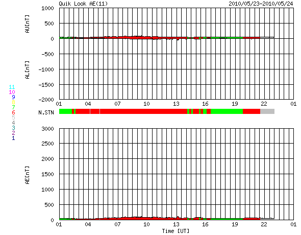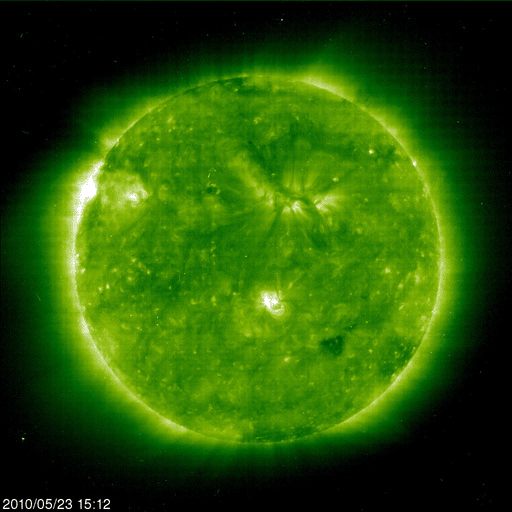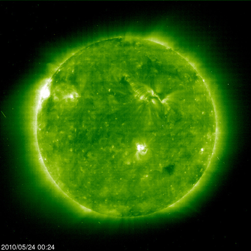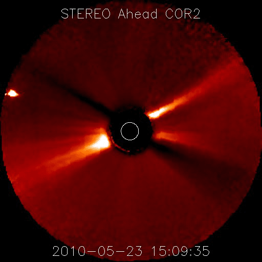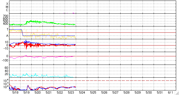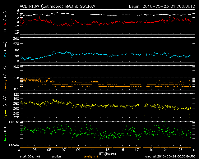 2010/ 5/24 09:31 更新 フィラメンの噴出によって、地球方向にCMEが発生しています。現在の太陽風、磁気圏は静穏です。 担当 篠原 今日の未明、24日2時(世界時23日17時)頃から、 太陽の北半球の中央部でフィラメントの噴出が発生しました。 その様子を、SOHO EIT195の動画で紹介します。 昨日や一昨日のEIT195の写真でも、この大きなフィラメントは目立っていました。 気になっていたのですが、その領域が噴き出しました。 これに続いて、CME(太陽ガスの放出現象)も発生しています。 SOHOのLASCOカメラの更新が止まっているので、 STEREO AheadのCOR2カメラの動画を紹介します。 地球は、この写真の左側にあります。 地球へ向かって、ガスが激しく吹き出していることが分かります。 この噴出の影響が、4日後くらいの太陽風にやって来そうです。 フレアほどの激しい現象ではないので、速度が大きく上がることはありませんが、 磁場の強まりを運んでくる可能性があります。 その時に、磁場が大きく南を向くと、 地球では活発な磁気嵐やオーロラ活動が発生することになります。 これからしばらくは、ACEのデータに注意してください。 現在の太陽風は、速度が360km/秒まで下がり、すっかり低速の風になっています。 磁場強度も3nTと弱めで、太陽風は穏やかです。 また、磁気圏も静かです。 太陽風の速度が下がった事と、太陽風磁場の南北成分がほぼ0nT付近にあるためです。 速度が低くても、磁場がある程度南を向いていれば、 小さなオーロラ活動が見られるのですが、 現在はその様子もありません。 27日周期の図によると、当面は穏やかな太陽風が続きそうです。 4日後くらいにCMEの影響が到来しそうですが、それに加えて、 前周期の通りであれば、5月29日の夜くらいから高速風が始まると予想されます。 発生源となるコロナホールは、今日のSOHOではまだ東端にあり、様子は良く分かりません。 太陽は、1072黒点群が見えていますが、フレア活動は見られません。 X線グラフの弱い高まりは、フィラメントの噴出に関係する変化です。 太陽は穏やかな状態が続きそうです。 太陽の北半球の中央部でフィラメントの噴出が発生しました。 (c) SOHO (ESA & NASA)、動画加工 : 宇宙天気ニュース ![]() STEREO Aheadから見たCME。左側が地球の方向です。 (c) STEREO (NASA)、動画加工 : 宇宙天気ニュース ![]() SOHO EIT195による太陽コロナ。24日9時(世界時24日0時)。 (c) SOHO (ESA & NASA) ![]() SOHOによる太陽可視光写真。 (c) SOHO (ESA & NASA) ![]() ACEが観測した太陽風の磁場(1番上の枠、白線は全体の強度、赤線は南北成分) および、太陽風の密度(3番目の橙線)、速度(4番目の黄線) (c) NOAA/SWPC ![]() リアルタイムAE指数 下段のAEグラフの値が高くなると、オーロラ活動が活発化しています。 (c) 京都大学, NICT ![]() 27日の太陽周期に合わせたデータプロット 太陽が同じ面を地球に向けていた27日前の変化から、今後を予想することができます。 (c) NICT