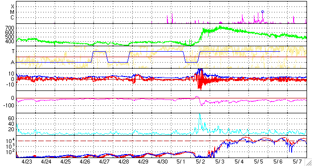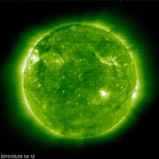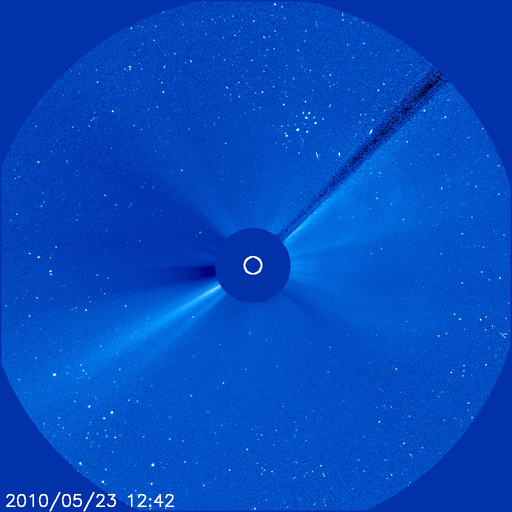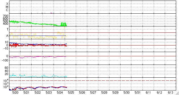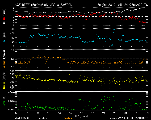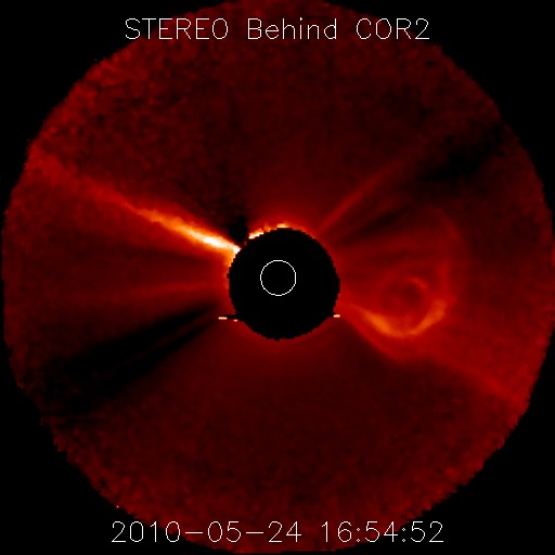 2010/ 5/25 13:48 更新 再びCMEが発生しています。4日後くらいの太陽風に影響が現れそうです。現在の太陽風は300km/秒です。 担当 篠原 昨日紹介した太陽の爆発現象ををそのままもう一度繰り返したような現象が発生しました。 発生時刻は、24日23時(世界時24日14時)くらい、 場所は昨日と同じで、SOHO EIT195のコロナ写真の、 太陽の中央から少し右上に明るく見える活動領域です。 GOESのX線データでは、B1の小さな長時間型の変動が観測されています。 SOHO LASCO C3では、CME(太陽ガスの放出現象)が観測されています。 昨日報告したCMEも含めて、2回連続して飛び出す様子を動画で見て下さい。 どちらも、太陽全体を包むように広がるハロー型と呼ばれるCMEになっています。 地球に向かって飛び出していると考えられるので、これから3〜4日後くらいに、 2発連続で地球に押し寄せてくるかもしれません。 今後のACEの変化に注目してください。 このCMEをSTEREO Behindから見てみましょう(2枚目の写真)。 今日はBehindなので、地球は写真の右方向にあります。 そちらへむかって、ガスが風船のように広がっている姿が見えています。 この様子だと、地球へ影響がやって来るのは確実かもしれません。 太陽では、目立った活動はこれくらいで、 1072黒点群は静かに安定しています。 SOHOの写真では、南半球の西端(右端)にも小さな黒点が発生しているようです。 EIT195で明るく光っている場所です。 小さな群でもあり、NOAAの番号が付くかどうかは分かりません。 太陽風は、速度が300km/秒まで下がってしまい、しっかりと低速風です。 磁場強度は、3nTから4nTくらいとこちらも穏やかです。 コロナホールの回帰かCMEの影響がやって来るまでは、このまま低速風が続きそうです。 EIT195の北半球の東端(左端)には、コロナホールの暗い影が見え始めています。 この位置だと、影響が及ぶまでにまだ6日くらいかかりそうです。 引き続き様子を見ていきましょう。 昨日に続いて、今日の未明にもCMEが発生しました。SOHO LASCO C3。 (c) SOHO (ESA & NASA) ![]() STEREO Behindから見たCME。地球は右側にあります。 (c) STEREO (NASA) ![]() SOHO EIT195による太陽コロナ。25日13時(世界時25日4時)。 (c) SOHO (ESA & NASA) ![]() SOHOによる太陽可視光写真。 (c) SOHO (ESA & NASA) ![]() GOES衛星の太陽X線データ (c) NOAA/SWPC ![]() ACEが観測した太陽風の磁場(1番上の枠、白線は全体の強度、赤線は南北成分) および、太陽風の密度(3番目の橙線)、速度(4番目の黄線) (c) NOAA/SWPC ![]() リアルタイムAE指数 下段のAEグラフの値が高くなると、オーロラ活動が活発化しています。 (c) 京都大学, NICT ![]() 27日の太陽周期に合わせたデータプロット 太陽が同じ面を地球に向けていた27日前の変化から、今後を予想することができます。 (c) NICT