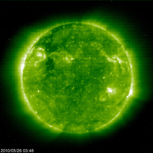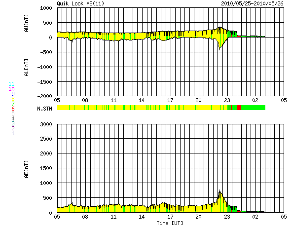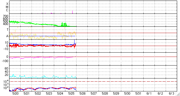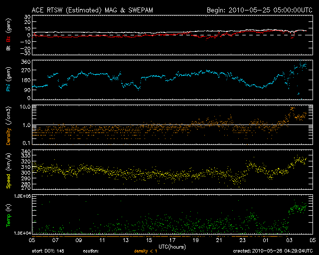 2010/ 5/26 13:29 更新 300km/秒の低速の太陽風が続いています。明日以降、CMEの影響がやって来そうです。 担当 篠原 穏やかな太陽風が続いています。 速度は、300km/秒に下がったまま安定しています。 磁場強度は、グラフの縦軸が縮まってしまい、読み取りにくいのですが、 7〜8nTに少し強まっています。 まだ、CMEの影響がやって来るには早いので、すぐに大きく変化することはないと思います。 今日のAE指数は、エラーデータが混じっているようで、変な図になっています。 基本的には穏やかな状態が続いている様です。 ただ、昨日あたりは、太陽風磁場が弱い南向きになっていたので、 地上でも弱いオーロラ活動は見られたのではないでしょうか。 もうしばらくは低速の太陽風が続くと思われるので、その間は、磁気圏も静穏でしょう。 明日か明後日くらいに、太陽で発生したCMEの影響がやってくると思われます。 速度はそれほど高くないと思いますが、まとまった磁場が運ばれてきて、 強い南向き磁場を作り、磁気嵐や活発なオーロラ活動を起こす可能性があります。 CMEの影響は2回にわたって到来し、その後は、コロナホールによる高速風が始まると思われます。 これから1週間程度、にぎやかな状態が続くかもしれません。 太陽では、中心やや北寄りに小さな黒点が発生しています。 まだ番号は付いていないようです。 X線のグラフでは、B6の小さなフレアが発生しています。 1072黒点群で発生したそうです。 しかし、1072群が特に活動を強めているという様子は見られず、 太陽は、基本的には穏やかな状態が続くでしょう。 SOHO EIT195による太陽コロナ。26日13時(世界時26日4時)。 (c) SOHO (ESA & NASA) ![]() SOHOによる太陽可視光写真。 (c) SOHO (ESA & NASA) ![]() ACEが観測した太陽風の磁場(1番上の枠、白線は全体の強度、赤線は南北成分) および、太陽風の密度(3番目の橙線)、速度(4番目の黄線) (c) NOAA/SWPC ![]() リアルタイムAE指数 下段のAEグラフの値が高くなると、オーロラ活動が活発化しています。 (c) 京都大学, NICT ![]() 27日の太陽周期に合わせたデータプロット 太陽が同じ面を地球に向けていた27日前の変化から、今後を予想することができます。 (c) NICT