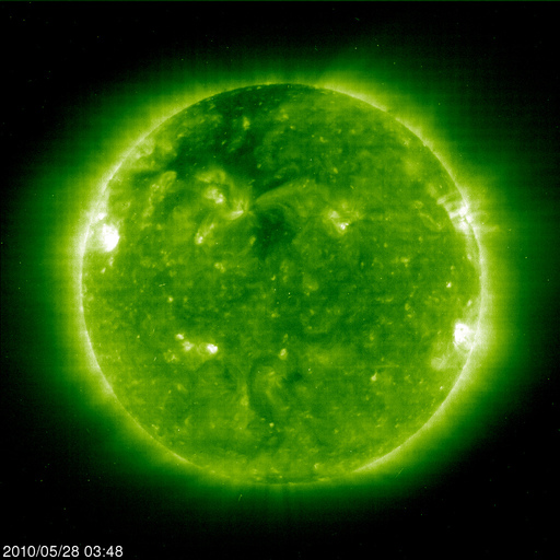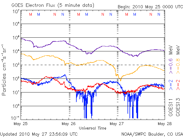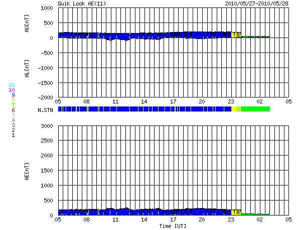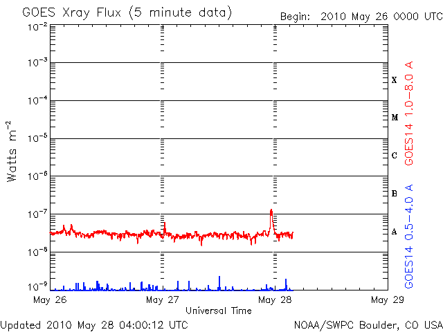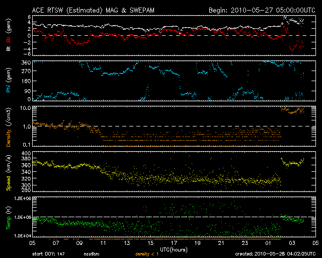 2010/ 5/28 13:03 更新 CMEの擾乱がやって来ました。今のところ太陽風の変化は小規模で、目立った影響はなさそうです。 担当 篠原 つい先ほど、28日11時(世界時28日2時)に、CMEによる太陽風の擾乱がやって来ました。 ACEのグラフを見ると、昨夜から速度は320km/秒に下がっていましが、 つい先ほど、急に360km/秒へ上昇しています。 同時に、プラズマの密度も、0.2個/cm^3くらいに下がっていたものが、 一気に10個/cm^3近くへ増加しています。 磁場強度は、2nTから4nTに強まった程度で、目立った変化ではありません。 全体的に太陽風の変動としては小規模で、 このままであれば、地球へは特に影響を及ぼすことはないでしょう。 明日には、第二波がやって来ると思われますが、 そちらも、同じような規模かもしれません。 AE指数は、またデータエラーが発生しているようです。 しかし、ほとんど変化はありません。 太陽風にこれ以上の変化が発生しなければ、今後も静穏でしょう。 SOHO EIT195の太陽コロナ写真によると、コロナホールは、太陽の中心線に達しています。 これから3日後の、31日くらいから影響が始まるのではないかと思います。 前周期は日本時間で5月2日から3日に変わる頃に高速風が始まりました。 単純に27日を足すと、29日から30日くらいと予想できます。 しかし、今回は、コロナホールの広がりが東側に縮まっていて、 高速風の始まりは遅れそうに見えます。 実際にどうなるか、明日以降はACEの変化に注意してください。 太陽は、1072黒点群が西の端に近づいています。 今日も見えている黒点はこれひとつで、 東端から上がってきた活動的な領域には、白斑が見えるだけでした。 X線のデータにもほとんど変化はなく、太陽は穏やかです。 SOHO EIT195による太陽コロナ。28日12時半(世界時28日3時半)。 (c) SOHO (ESA & NASA) ![]() SOHOによる太陽可視光写真。 (c) SOHO (ESA & NASA) ![]() ACEが観測した太陽風の磁場(1番上の枠、白線は全体の強度、赤線は南北成分) および、太陽風の密度(3番目の橙線)、速度(4番目の黄線) (c) NOAA/SWPC ![]() リアルタイムAE指数 下段のAEグラフの値が高くなると、オーロラ活動が活発化しています。 (c) 京都大学, NICT ![]() GOES衛星による、静止衛星軌道における高エネルギー電子の変化 (c) NOAA/SWPC ![]() GOES衛星の太陽X線データ (c) NOAA/SWPC ![]() | |||||||||||||||||||||||||||||||||||||||||||||||||||||||||||||||||||||||||||||||||||||||||||||||||||||||||||||||||||||||||||||||||||||||||||||||||||||||||||||||||||||||||||||||||||||||||