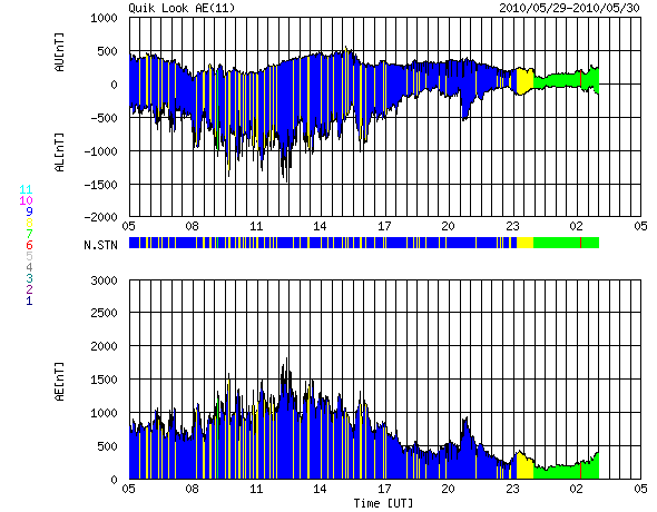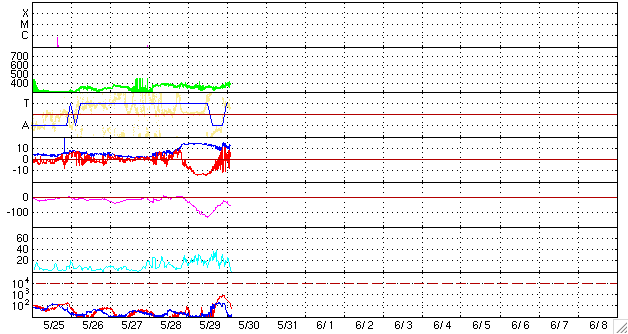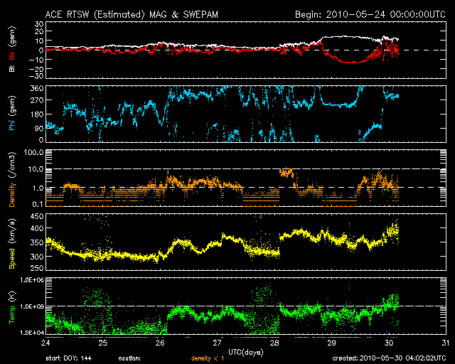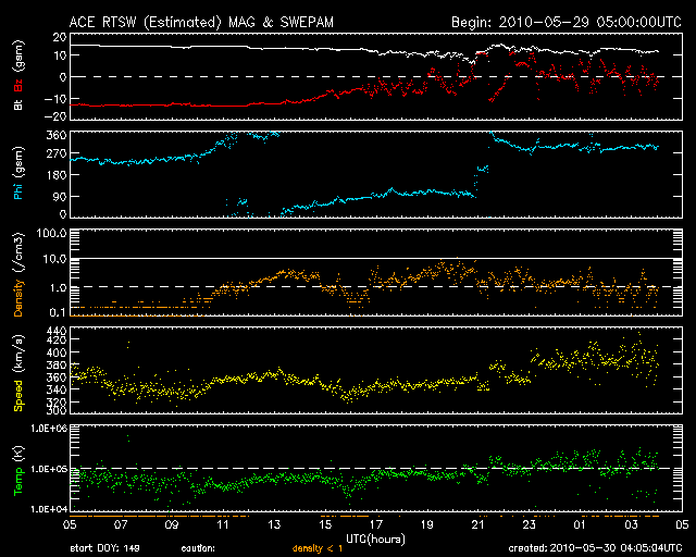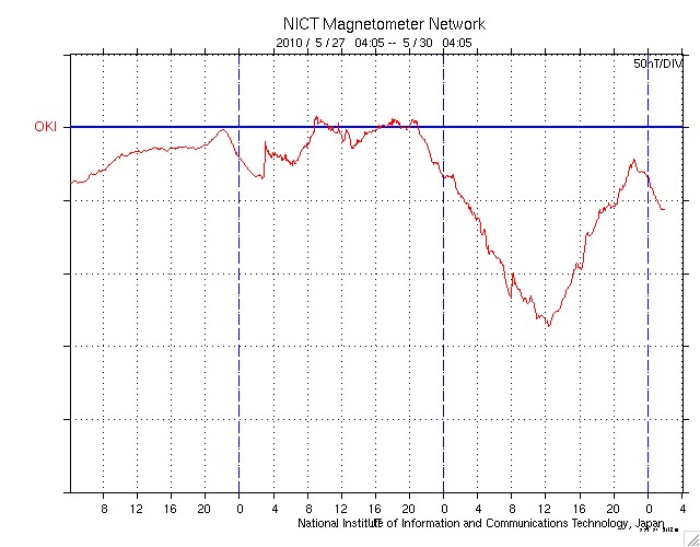 2010/ 5/30 13:05 更新 太陽風磁場が大きく南を向き、磁気嵐が発生しました。続いてコロナホールの影響が始まりそうです。 担当 篠原 昨日始まった太陽風磁場の強まりは、15nTのまま半日ほど経過し、 現在も11nTくらいに強まった状態が続いています。 南北成分は、昨日のニュース以降-15nT近くまで大きく振れ、 今朝までずっと南向きになっていました。 CMEの噴出によって、太陽から磁場のかたまりが流れてきたと考えられます。 太陽の写真に続いて、ACEの一週間の図を掲載します。 磁場の南北成分が、半日ほど大きく南向き(マイナス方向)に振れている様子がよく分かります。 磁場のかたまりが流れてきた時に見られる変化です。 太陽風の速度は、360km/秒とやや低速のままでしたが、 磁場の南向きがかなり強まったため、磁気圏の活動はかなり活発になりました。 AE指数は、1000nTから、最高1500nTに達するかなり大きな変動をしています。 沖縄の磁場データも、昨日のニュース以降、どんどん低下し、 静穏レベル(青線)から最大で-130nTの低下となりました。 この変動幅には、局地的な影響が含まれるので、 世界規模で観測するDst指数を参照すると、最大で-80nTの低下となっています。 中規模の磁気嵐が発生したようです。 太陽風磁場の強まりは、現在も続いています。 しかし、強い南向きの傾向は終わり、今朝からは0nTを挟んで南北に振れるようになっています。 それとともに、AE指数の変動は小規模になっています。 沖縄の磁場データも最大値を超え、回復の傾向にあります。 CMEによる擾乱は一段落ついて、次は、コロナホールの高速風の到来となりそうです。 明日くらいに始まる可能性があります。 太陽では、昨日現われた太陽の北東(左上)寄りの黒点に、 1073黒点群という番号が付けられました。 続いて、北半球の西橋に1074黒点群、中心南寄りに1075黒点群が発生し、 どれも小さいながら3つの黒点群が見えています。 フレア活動は特になく、太陽は穏やかです。 SOHO EIT195による太陽コロナ。 (c) SOHO (ESA & NASA) ![]() SOHOによる太陽可視光写真。 (c) SOHO (ESA & NASA) ![]() 1週間の太陽風データ (c) NOAA/SWPC ![]() ACEが観測した太陽風の磁場(1番上の枠、白線は全体の強度、赤線は南北成分) および、太陽風の密度(3番目の橙線)、速度(4番目の黄線) (c) NOAA/SWPC ![]() リアルタイムAE指数 下段のAEグラフの値が高くなると、オーロラ活動が活発化しています。 (c) 京都大学, NICT ![]() 沖縄の磁場擾乱 下へ下がるほど、擾乱が発達している事を意味します。 (c) NICT ![]() 27日の太陽周期に合わせたデータプロット 太陽が同じ面を地球に向けていた27日前の変化から、今後を予想することができます。 (c) NICT
