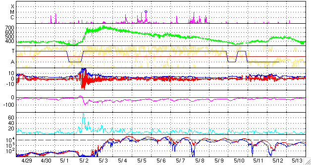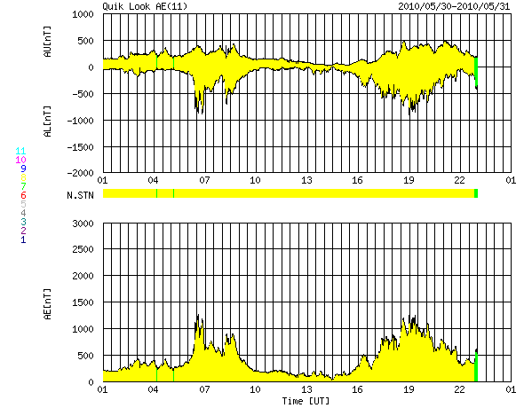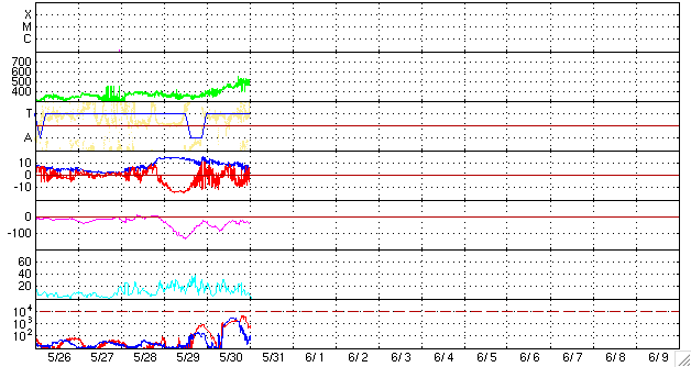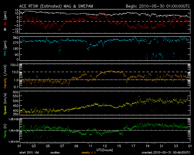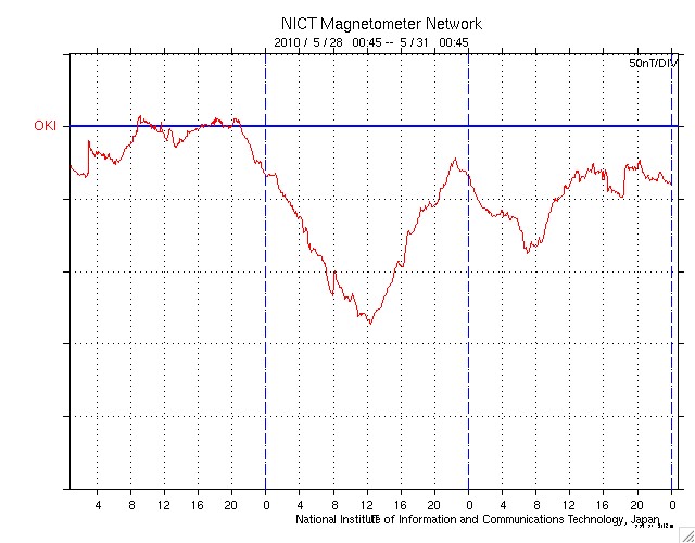 2010/ 5/31 09:49 更新 高速太陽風が始まりました(500km/秒)。南向き磁場が強まり、激しいオーロラ活動が発生しています。 担当 篠原 昨夜のうちに、太陽風の速度(ACEの図の黄色線)は500km/秒へ上昇し、 高速太陽風が始まりました。 コロナホールの影響がやって来たのではないかと思います。 速度上昇に先立って、太陽風のプラズマの密度(橙色線)が10個/cm^3へ一時的に上昇しています。 高速風の始まりによく見られる変化です。 一方、磁場強度(白線)については、 今回はその前にCMEによる磁場の強まりが発生していたためか、 目立った変化はありませんでした。 むしろ、10nT超の強さからゆっくりと下がり続け、現在は7nTほどになっています。 磁場南北成分(赤線)が南に大きく振れる傾向は、昨日も続き、 -8nTくらいのまとまった南向きが長い時間見られました。 この影響で、AE指数では、1000nTを越える激しい変動が発生しています。 沖縄の磁場データも、2回目の減少を記録しています。 磁気圏の赤道面に流れる電流系が強まったためです。 Dst指数も、再度-60nTへの減少を記録していて、この部分だけでも小規模磁気嵐の変動です。 コロナホールによる高速風が始まったと考えると、 太陽風の乱れは(規模は次第に小さくなりますが)、1週間近く続く可能性があります。 SOHO EIT195では、コロナホールは北半球の高緯度側に広がっています。 緯度が高めなので、どの程度地球へ影響が及ぶのか読みにくいところがありますが、 前周期の記録を参照すると(27日周期の図)、5月8日まで高速風は続いていて、 これは6月4日に相当します。 磁気圏活動の高まりによって、放射線帯高エネルギー電子が増加を始めています。 今日は、まだ数千のレベルですが、明日以降、警戒レベルの10,000に達する可能性があります。 注意してください。 太陽は、静穏です。 3つの黒点群は、今日の写真では非常に淡く、見つけるのが難しい状態です。 フレア活動もありません。 SOHO EIT195による太陽コロナ。 (c) SOHO (ESA & NASA) ![]() SOHOによる太陽可視光写真。 (c) SOHO (ESA & NASA) ![]() ACEが観測した太陽風の磁場(1番上の枠、白線は全体の強度、赤線は南北成分) および、太陽風の密度(3番目の橙線)、速度(4番目の黄線) (c) NOAA/SWPC ![]() リアルタイムAE指数 下段のAEグラフの値が高くなると、オーロラ活動が活発化しています。 (c) 京都大学, NICT ![]() 沖縄の磁場擾乱 下へ下がるほど、擾乱が発達している事を意味します。 (c) NICT ![]() 27日の太陽周期に合わせたデータプロット 太陽が同じ面を地球に向けていた27日前の変化から、今後を予想することができます。 (c) NICT