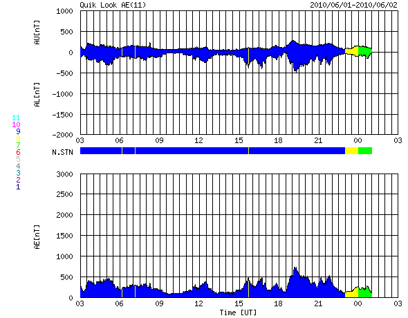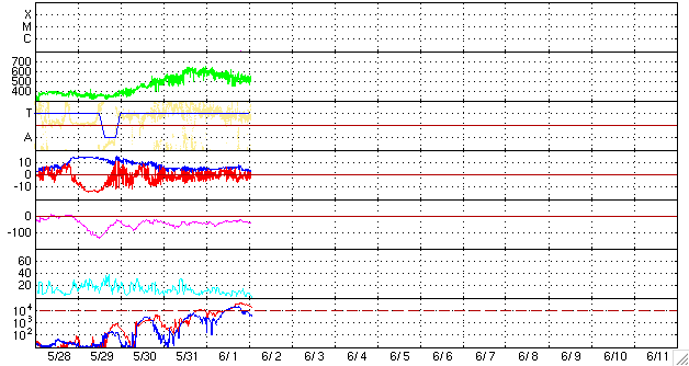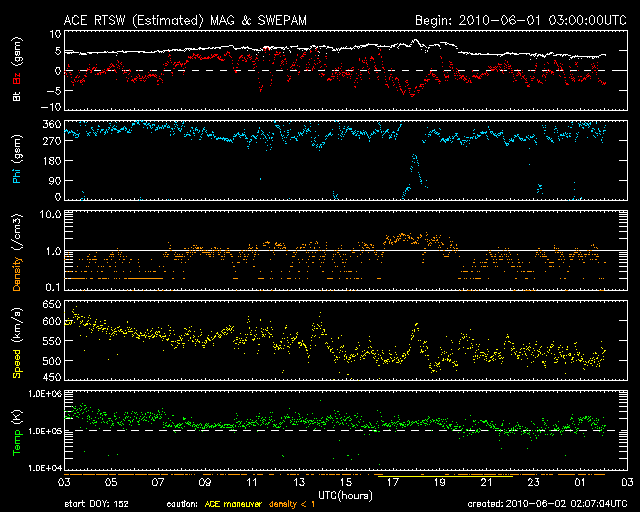2010/ 6/ 2 11:07 更新 高速太陽風は続いていますが、速度は500km/秒に下がってきました。放射線帯が強まっています。 担当 篠原 太陽風は、昨日のニュースの頃までが最高速度だった様で、 以降、じわじわと速度は低下し、 昨日は、600km/秒とだいぶ高めだった太陽風の速度は、 現在は500km/秒と普通の高速風になっています。 磁場強度は、5nTをやや割ったくらいで、まだ大きく低下はしていません。 コロナホールの分布もあり、 まだこのまますぐに速度が下がってしまうことではない様に思います。 速度の低下とともに、磁気圏の活動も規模が小さくなっています。 AE指数は500nT程度と、小規模の活動ばかりです。 SOHO EIT195を見ると、高速風をもたらしているコロナホールは、 ちょうど北半球の中心部を通りすぎたところです。 緯度が高めなので、地球への影響度は読みにくいところがあるのですが、 27日周期の図も参考にすると、 まだ、このまま3〜4日程度は速度が高めの状態が続くのではないでしょうか。 磁気圏でも、小規模の活動がしばらく見られそうです。 今回の擾乱を受けて、放射線帯の高エネルギー電子が一段と増加しています。 GOES11、13の両衛星が10,000の警戒レインを突破しています。 衛星の運用ではしばらく注意が必要な状態です。 太陽では、1076黒点群が昨日よりもはっきり見えるようになっています。 しかし、活動は特になく、太陽は静穏です。 また、EIT195を見ると、1076群の左下の明るい領域が強まっているようです。 やがてこちらにも黒点が発生するかもしれません。 SOHO EIT195による太陽コロナ。 (c) SOHO (ESA & NASA) ![]() SOHOによる太陽可視光写真。 (c) SOHO (ESA & NASA) ![]() ACEが観測した太陽風の磁場(1番上の枠、白線は全体の強度、赤線は南北成分) および、太陽風の密度(3番目の橙線)、速度(4番目の黄線) (c) NOAA/SWPC ![]() リアルタイムAE指数 下段のAEグラフの値が高くなると、オーロラ活動が活発化しています。 (c) 京都大学, NICT ![]() 27日の太陽周期に合わせたデータプロット 太陽が同じ面を地球に向けていた27日前の変化から、今後を予想することができます。 (c) NICT