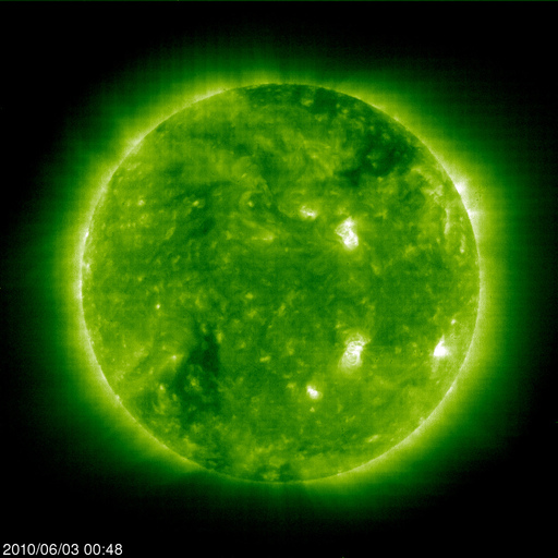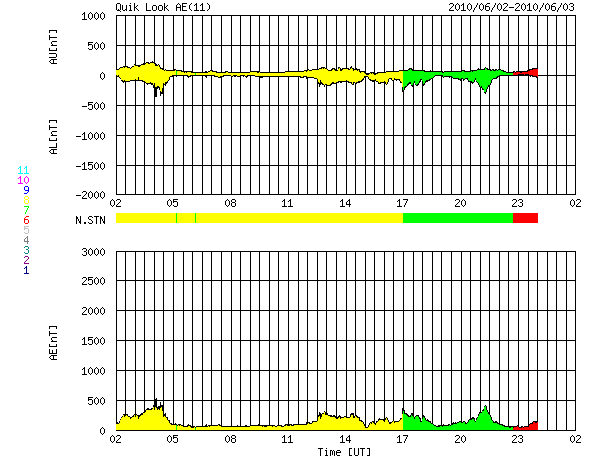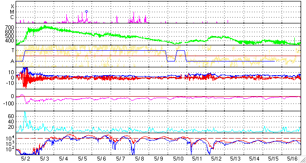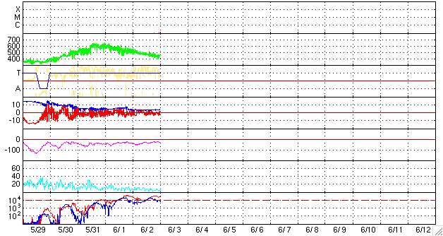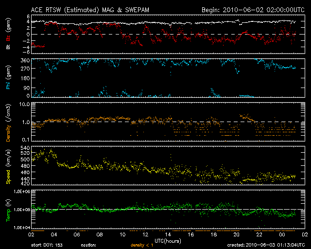 2010/ 6/ 3 10:14 更新 太陽風の速度は440km/秒に下がり、高速風は終わりました。放射線帯は強まったままです。 担当 篠原 今回の高速太陽風領域は、ずいぶんと小さくなってしまったようです。 昨日のニュースの後も、太陽風の速度は下がり続け、 昨日の午後には500km/秒台を割り、 現在は、440km/秒とやや高めというくらいにまで下がってしまいました。 27日周期の図で、前周期の変化と比較して下さい。 高速風の立ち上がりが遅れ、上昇の勢いも弱まったことに対応するように、 最高速度は、前周期の700km/秒から、今回は600km/秒に下がり、 高速風の後半も、5日間近く継続した前周期と違い、 今回は2日と持たずに平均レベルに下がってしまいました。 コロナホールによる太陽風の変動は、これで一段落となりそうです。 磁気圏の活動も穏やかになっています。 オーロラの活動度を示すAEは、300〜400nTの小さな変動が発生している程度です。 まだ、速度はやや高めのため、小規模の活動は発生している様です。 今後は、400km/秒前後の平均的な太陽風になり、穏やかな状態がしばらく続くでしょう。 そして、SOHO EIT195の南半球東側に、次のコロナホールが見えています。 もう2日ほどで太陽の中心線に達し、 3日後の6月8日くらいに影響が地球へやって来るでしょう。 27日周期の図では、前周期の5月12日に小さな速度の山が見えています。 この回帰です。 ただし、コロナホールは今回の方がよりはっきりと見えているので、 影響も多少強まるかもしれません。 放射線帯の高エネルギー電子は、増加は止まり、10,000の警戒レベルを保っています。 高エネルギー電子は、一旦増えるとなかなか減りません。 次の太陽風の乱れがやって来ると予想される、8日くらいまでは、 高いレベルを保ちそうです。 太陽では、1076黒点群の黒点が大きくなっています。 SOHOの可視光写真でも、見栄えする大きさになっています。 しかし、X線のデータに特に変動はなく、活動は穏やかです。 5月の初めに1069黒点群が活動を起こして以来、1カ月ほど静かな太陽が続いています。 SOHO EIT195による太陽コロナ。 (c) SOHO (ESA & NASA) ![]() SOHOによる太陽可視光写真。 (c) SOHO (ESA & NASA) ![]() ACEが観測した太陽風の磁場(1番上の枠、白線は全体の強度、赤線は南北成分) および、太陽風の密度(3番目の橙線)、速度(4番目の黄線) (c) NOAA/SWPC ![]() リアルタイムAE指数 下段のAEグラフの値が高くなると、オーロラ活動が活発化しています。 (c) 京都大学, NICT ![]() 27日の太陽周期に合わせたデータプロット 太陽が同じ面を地球に向けていた27日前の変化から、今後を予想することができます。 (c) NICT