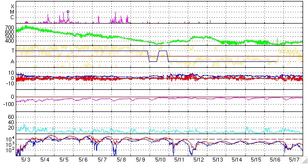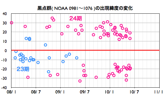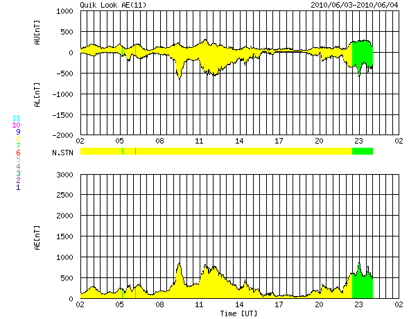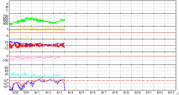 現在も、5月の後半から連続して黒点が現われてはいますが、 フレア活動はほとんど見られず、太陽は静穏なままです。 全体としては、太陽活動が低調であることは変わらず、 この表の発表も、もうしばらく続くことになりそうです。 その太陽は、現在、1076黒点群が南西(右下)方向に見えています。 黒点の面積は更に増えているようです。 しかし、X線のデータには特に変動はなく、静かな黒点です。 太陽風は、高速風の第二波がやって来ました。 昨夜に入って再び速度が上昇し、550km/秒の高速風となっています。 コロナホールは東西に広がっていたので、高速風の分布にも広がりがあったのでしょう。 磁場強度も6nTくらいに強まり、-5nTレベルの南向き磁場も発生しています。 この影響で、AE指数で800nTほどの中規模のオーロラ活動が発生しています。 SOHO EIT195を見ると、北半球のコロナホールは西端近くに去りつつあり、 高速風がこれ以上強まることはなさそうです。 2日程度で落ち着くのではないでしょうか。 また、EIT195では、次のコロナホールが太陽の中心線に近づいています。 南極から北半球の中緯度近くまで、縦に細く連なったコロナホールです。 ここからの影響は、4日くらい先にやって来そうです。 コロナホールの様子から、短期間の高速風になりそうです。 太陽風が再び強まった影響は、放射線帯の高エネルギー電子にも現れています。 青線のGOES11、赤線のGOES13、どちらも急激に大きく減少しています。 磁気圏が変動しているためです。 ただし、こちらはこの後に回復して、再び高いレベルに達する可能性があります。 もう2日程度は、変化に注意してください。 2006年7月以降の、月ごとの無黒点日数の変化 (c) 作図 : 宇宙天気ニュース、データ : SIDC ![]() 2008年1月以降に出現した太陽黒点の緯度の変化。 (c) 作図 : 宇宙天気ニュース、データ : SIDC ![]() SOHO EIT195による太陽コロナ。 (c) SOHO (ESA & NASA) ![]() SOHOによる太陽可視光写真。 (c) SOHO (ESA & NASA) ![]() GOES衛星の太陽X線データ (c) NOAA/SWPC ![]() ACEが観測した太陽風の磁場(1番上の枠、白線は全体の強度、赤線は南北成分) および、太陽風の密度(3番目の橙線)、速度(4番目の黄線) (c) NOAA/SWPC ![]() リアルタイムAE指数 下段のAEグラフの値が高くなると、オーロラ活動が活発化しています。 (c) 京都大学, NICT ![]() 27日の太陽周期に合わせたデータプロット 太陽が同じ面を地球に向けていた27日前の変化から、今後を予想することができます。 (c) NICT