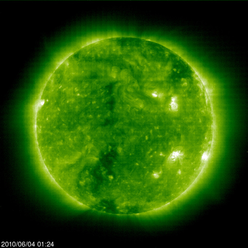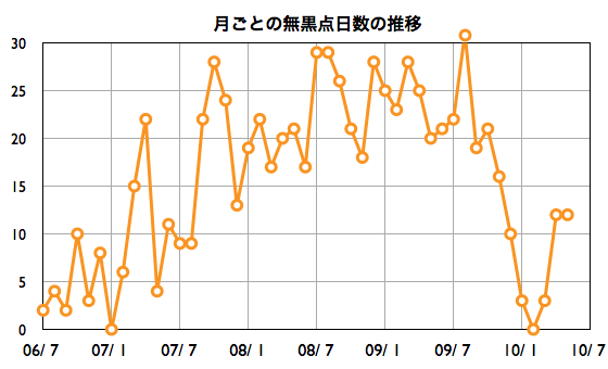 2010/ 6/ 4 10:31 更新 550km/秒の高速風が再びやって来ました。放射線帯が一旦大きく減少しています。5月までの無黒点日情報です。 担当 篠原 延長戦が続く、太陽無黒点日数の記録です。 最新のデータは、SIDCのページをご覧ください。 5月は、中盤に連続して12日間無黒点の日が続きました。 4月と同じ日数が並び、太陽の活動度はどちらへ向かうのか、じらされる結果となっています。