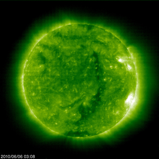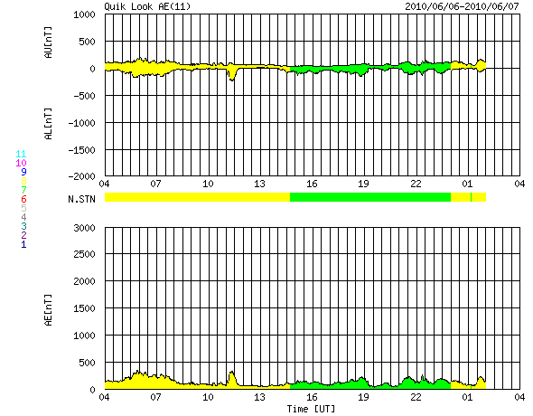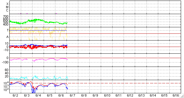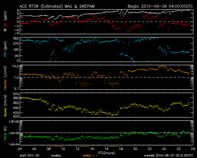 2010/ 6/ 7 12:31 更新 太陽風の速度は440km/秒に下がり、高速風は終わりました。明日くらいに、次の速度上昇が到来しそうです。 担当 篠原 太陽風の速度は、440km/秒付近へ下がって、落ち着いています。 高速風は終わり、平均的な太陽風の速さに戻っています。 一方、磁場強度は、3nTに弱まっていたのですが、6nT近くに強まっています。 まだ、強度として平均的なレベルに戻った程度ですが、 明日くらいから次の太陽風の乱れがやって来ると予想しているため、 その兆しとなっている可能性もあります。 掲載しているSOHO EIT195は、昨日の昼頃の写真です。 コロナホールはこれよりも西側(右側)に動いており、 そろそろ影響がやって来てもおかしくはありません。 27日周期の図によると、単純に27日で回帰するなら、乱れの到来は明日になるでしょう。 前周期は、500km/秒の太陽風が1日強続いた程度で、 たいした変動ではありませんでした。 今回は、南半球に広がるコロナホールがよりはっきりしているため、 最高速度はもう一段上がるかもしれません。 東西の幅は狭いため、継続期間は3日程度ではないでしょうか。 現在の磁気圏は、概ね静穏です。 AE指数は、小さな変動が見られる程度です。 再度警戒レベルに達した放射線帯の高エネルギー電子は、 今日は、わずかに減少しています。 ぎりぎり10,000に届いたくらいで、今後も減少が続くでしょう。 太陽では、1077黒点群は早くも消失し、 1076群が西の端に見えているだけです。 目立ったフレア活動も無く、静穏です。 SOHO EIT195による太陽コロナ。 (c) SOHO (ESA & NASA) ![]() SOHOによる太陽可視光写真。 (c) SOHO (ESA & NASA) ![]() ACEが観測した太陽風の磁場(1番上の枠、白線は全体の強度、赤線は南北成分) および、太陽風の密度(3番目の橙線)、速度(4番目の黄線) (c) NOAA/SWPC ![]() リアルタイムAE指数 下段のAEグラフの値が高くなると、オーロラ活動が活発化しています。 (c) 京都大学, NICT ![]() 27日の太陽周期に合わせたデータプロット 太陽が同じ面を地球に向けていた27日前の変化から、今後を予想することができます。 (c) NICT