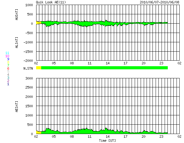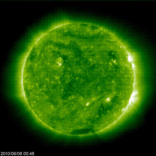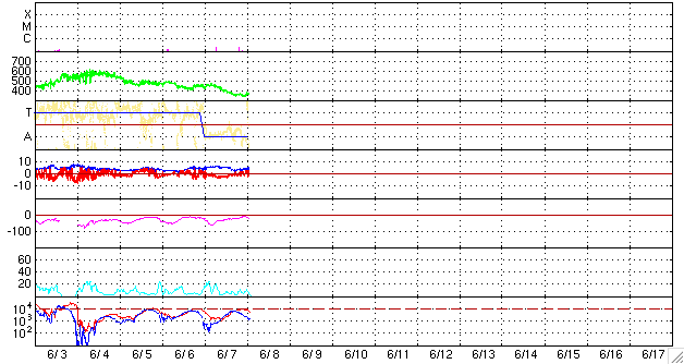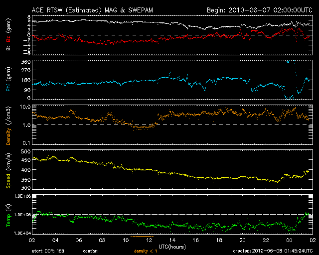 2010/ 6/ 8 10:46 更新 太陽風は370km/秒と低速風になっています。これから、コロナホールの影響がやって来る可能性があります。 担当 篠原 1カ月ほど前から、Twitterにニュースのタイトルを公開し始めました。 http://twitter.com/swnews 記事更新のお知らせになると思いますので、ご利用下さい。 このアカウントには、 C3以上のフレアが発生した場合に自動検出で速報を書き込んでいます。 検出精度は十分だと思いますが、ソフトが止まっていたり、 Twitterへの書き込みに失敗したりする可能性がありますので、 信頼性はその程度に考えて下さい。 実は、太陽がずっと静かなので、フレア速報の実地テストがほとんどできていません。 しばらく動作確認をしてから公開したかったのですが、 現在の太陽の様子ではいつになるか分からないので、見切り発車でお知らせします。 また、6月末で、Twitterの書き込みの認証方式が変わるそうです。 現在は旧方式で動かしていて、新方式への切り替えを試みているところです。 早く切り替えたいと思っていますが、私の手に負えない場合、 7月からは手動更新になってしまうかもしれません。 その時は、どなたかお助け下さい。 太陽風は、更に速度を下げ、370km/秒と低速風に変わっています。 磁場が強まりつつあるように見えた変化は、その後は続かず、 磁場強度は5nTと平均的なレベルで安定しています。 これからコロナホールの影響がやって来ると思われますが、 それまでは低速の静かな太陽風です。 磁気圏活動も、概ね静穏ですが、 太陽風磁場が弱い南向きになっている影響で、 AE指数で200nT弱くらいの小さな変化が続いています。 SOHO EIT195は、昨日掲載の写真から2日ほど経過しているため、 コロナホールが一気に西に動いて、ずいぶん違う太陽に見えます。 コロナホールの位置としては、太陽風に変化がやって来て良い頃です。 今日から明日くらいにかけて、注目してください。 放射線帯の高エネルギー電子は、もう少し減少して、 警戒レベルを割りつつあります。 この後、太陽風の乱れがやって来ると、そこで一気に減少するでしょう。 太陽は、1076黒点群が西に没して、無黒点の状態です。 拡大写真を詳しく見ると、ごく小さな黒点がいくつか見えているようですが、 ここから発達するのか、すぐに消えてしまうのか、どうなるでしょう。 SOHO EIT195による太陽コロナ。 (c) SOHO (ESA & NASA) ![]() SOHOによる太陽可視光写真。 (c) SOHO (ESA & NASA) ![]() ACEが観測した太陽風の磁場(1番上の枠、白線は全体の強度、赤線は南北成分) および、太陽風の密度(3番目の橙線)、速度(4番目の黄線) (c) NOAA/SWPC ![]() リアルタイムAE指数 下段のAEグラフの値が高くなると、オーロラ活動が活発化しています。 (c) 京都大学, NICT ![]() 27日の太陽周期に合わせたデータプロット 太陽が同じ面を地球に向けていた27日前の変化から、今後を予想することができます。 (c) NICT