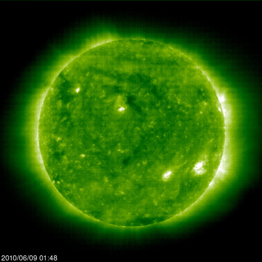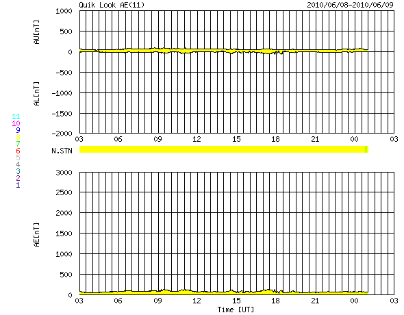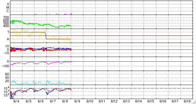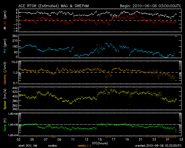2010/ 6/ 9 11:17 更新 太陽風は、400km/秒で安定しています。1078黒点群が発生しました。 担当 篠原 Twitterへのフォローをありがとうございます。 太陽が元気になって、フレアを起こし始めると、 情報発信としてもにぎやかになるでしょう。 (その点は情報BOXも同じで、元気のない表示が続いています) さて、太陽風は、昨日のニュース以降400km/秒を回復していたのですが、 そのまま、現在までこの速度で安定しています。 磁場強度も、4nTで落ち着いた状態が続き、今朝に入るとむしろ2nTに下がっています。 コロナホールの影響はまだ見られず、このままやって来ないかもしれません。 27日周期の図によると、前周期の開始よりも既に1日遅れています。 磁気圏も静穏です。 AE指数は全く変化していません。 今回のコロナホールは外れだったのかもしれませんが、 太陽の東端には、次のコロナホールがやって来ています。 SOHO EIT195では、まだ東の端ぎりぎりなので、はっきりと見えていませんが、 北半球の高緯度から南極へ向かって縦に伸びる、大きなコロナホールがあります。 27日周期の図の前周期、5月19日から始まっている速度の高まりの発生源です。 STEREOで比較すると、コロナホールは前周期よりも大きくなっています。 このため、高速風の領域もより大きくなっている可能性があります。 来週、6月15-16日くらいにやって来ると思われます。 放射線帯の高エネルギー電子は、また少し減少し、 10,000のラインからは離れつつあります。 この後も、ゆっくりと減少していくでしょう。 太陽では、南西側に1078黒点群が発生しました。 昨日、微かに見えていた部分が大きく成長した様です。 X線では、Bクラスの小さな変化は見えていますが、 今のところ、特に目立った活動は起こしていません。 SOHO EIT195による太陽コロナ。 (c) SOHO (ESA & NASA) ![]() SOHOによる太陽可視光写真。 (c) SOHO (ESA & NASA) ![]() ACEが観測した太陽風の磁場(1番上の枠、白線は全体の強度、赤線は南北成分) および、太陽風の密度(3番目の橙線)、速度(4番目の黄線) (c) NOAA/SWPC ![]() リアルタイムAE指数 下段のAEグラフの値が高くなると、オーロラ活動が活発化しています。 (c) 京都大学, NICT ![]() 27日の太陽周期に合わせたデータプロット 太陽が同じ面を地球に向けていた27日前の変化から、今後を予想することができます。 (c) NICT