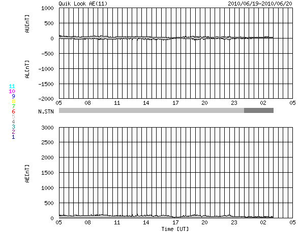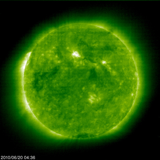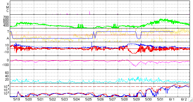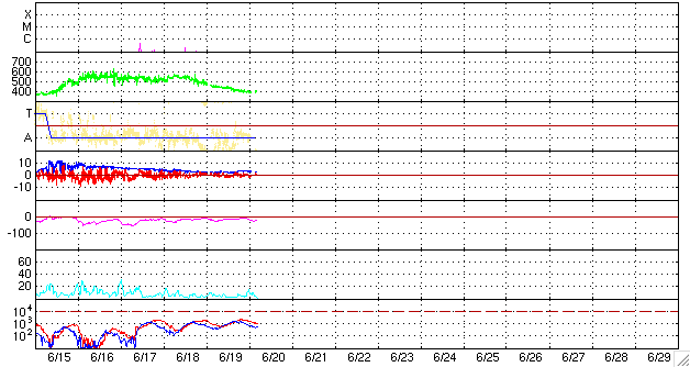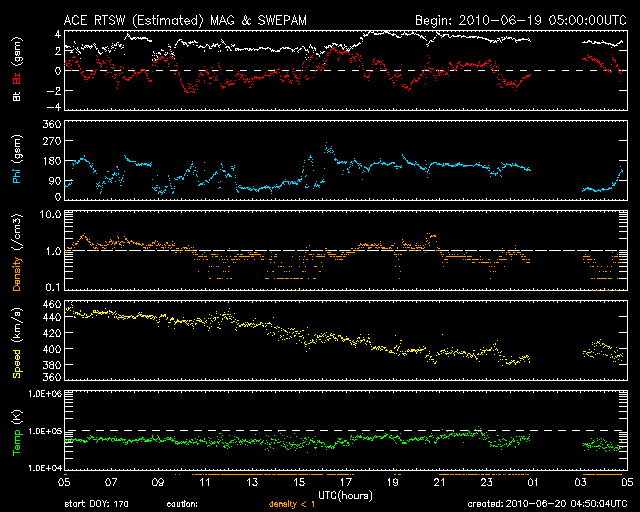 2010/ 6/20 13:51 更新 太陽風は400km/秒と通常の状態に戻りました。また新しく黒点が現われています。 担当 篠原 つい先ほど、20日11時(世界時20日2時)頃に、太陽の東端からCMEが飛び出しました。 その様子を、SOHO衛星LASCO C2の動画で紹介します。 最新の現象なので、途中の画像までしか届いていません。 また、それに先立って、EIT195では、フィラメントの噴出らしき様子が撮影されています。 その様子も、同じ動画の前半に加えています。 とても淡く、一瞬の変化なので、かなり見にくいですが、 赤道をまたいで、北半球から南半球に届く大きな現象だった様です。 STEREO BehindのEUVI195の動画でも、見ることができます。 地球からは真横の現象なので、影響はありません。 太陽風の速度は、昨日より低下を続け、 今朝の段階で400km/秒と平均的な状態に戻りました。 磁場強度も3nTを前後していて、やや弱まった状態です。 このため、磁気圏も静穏です。 AE指数は全く変化していません。 高速風は完全に終わり、太陽風は普通の状態になりました。 これから1週間弱、穏やかな状態が続くでしょう。 太陽では、北半球側の中央付近に、また新しい黒点群が出現しました。 SOHOの写真では、左右に2つ並んで見えますが、 左側は既に出現していた1082黒点群、右が新しく出現した黒点です。 小さいものばかりですが、出現が続いています。 X線の変化は全くなく、フレア活動は静かです。 太陽の東端でフィラメントの噴出が起こり、CMEが発生しました。 (c) SOHO (ESA & NASA)、動画加工 : 宇宙天気ニュース ![]() SOHOによる太陽コロナ。 (c) SOHO (ESA & NASA) ![]() SOHOによる太陽可視光写真。 (c) SOHO (ESA & NASA) ![]() ACEが観測した太陽風の磁場(1番上の枠、白線は全体の強度、赤線は南北成分) および、太陽風の密度(3番目の橙線)、速度(4番目の黄線) (c) NOAA/SWPC ![]() リアルタイムAE指数 下段のAEグラフの値が高くなると、オーロラ活動が活発化しています。 (c) 京都大学, NICT ![]() 27日の太陽周期に合わせたデータプロット 太陽が同じ面を地球に向けていた27日前の変化から、今後を予想することができます。 (c) NICT