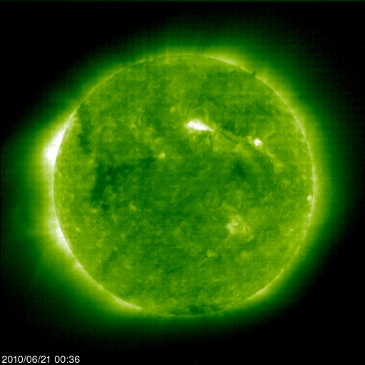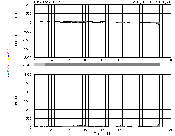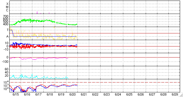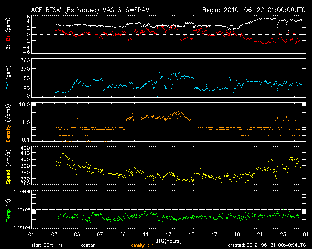 2010/ 6/21 09:41 更新 穏やかな太陽風が続いています。太陽も静穏です。 担当 篠原 太陽風の速度は、380km/秒まで下がったところで止まり、 400km/秒を割ったあたりで安定しています。 磁場強度も、3〜4nTと弱めの状態です。 今週末まで、太陽風は穏やかに推移しそうです。 磁気圏も静穏です。 オーロラの活動度を示すAE指数は、全く変化していません。 観測点のいくつかから、リアルタイムでデータが届かない状態が続いているようで、 このところ、グラフの色は灰色ばかりです。 早い回復を願っています。 SOHO EIT195の東半球側に、コロナホールの淡い影が見えてきました。 まだ斜めに見ているためなのか、コロナホールはあまりはっきりしていません。 ここからの高速風は、前周期は600km/秒に達しました。 今回はどの程度の規模になるでしょうか。 26-27日頃の回帰が予想されます。 太陽では、昨日現れた黒点が、もう一段大きくなっています。 しかし、NOAAの発表では新しい番号は付けられておらず、 1082黒点群の一部という扱いなのかもしれません。 X線データに変動はなく、太陽の静かな状態は続いています。 SOHO EIT195による太陽コロナ。 (c) SOHO (ESA & NASA) ![]() SOHOによる太陽可視光写真。 (c) SOHO (ESA & NASA) ![]() ACEが観測した太陽風の磁場(1番上の枠、白線は全体の強度、赤線は南北成分) および、太陽風の密度(3番目の橙線)、速度(4番目の黄線) (c) NOAA/SWPC ![]() リアルタイムAE指数 下段のAEグラフの値が高くなると、オーロラ活動が活発化しています。 (c) 京都大学, NICT ![]() 27日の太陽周期に合わせたデータプロット 太陽が同じ面を地球に向けていた27日前の変化から、今後を予想することができます。 (c) NICT