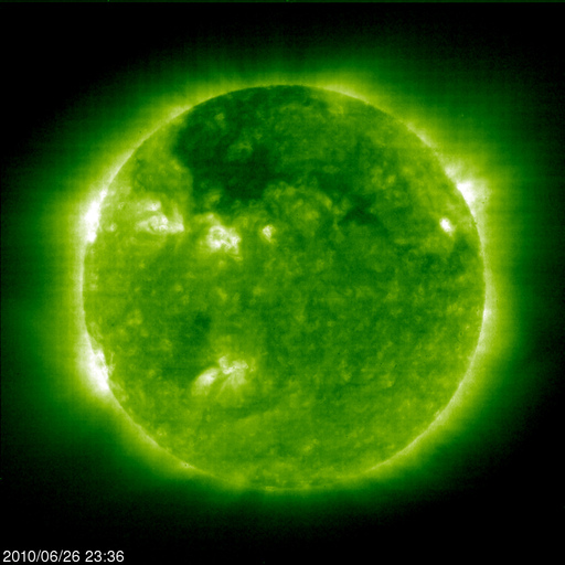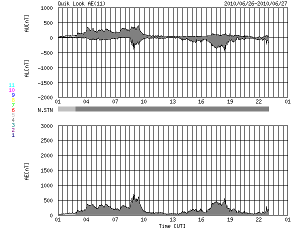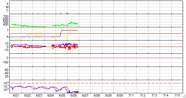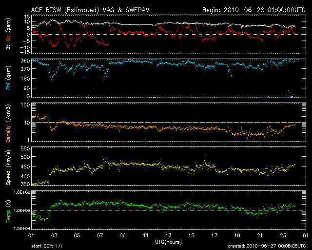 2010/ 6/27 09:08 更新 太陽風はやや高速になっています(450km/秒)。速度は、もう一段上昇する可能性があります。 担当 篠原 26日12時(世界時16日3時)頃に、太陽風の速度は450km/秒へ上がりました。 コロナホールによる太陽風の変化がやって来たようですが、 速度の上昇は450km/秒で止まっていて、本格的な高速風とはなっていません。 27日周期の図で前周期の様子を見ると、 前周期(5月30〜31日)は2日ほどかけてゆっくりと速度が高まっていきました。 今回も、これから更に上昇していくのか、あるいはここまでなのか、 この後の変化に注目して下さい。 10nTに強まっていた太陽風の磁場強度は、7nTほどに下がっています。 やや勢いはなくなっている印象です。 磁気圏のオーロラ活動は、ある程度活発化しています。 AE指数では、300〜500nTの小規模の変化が見られています。 ただし、今日も灰色のグラフになっていて、 指数作成に使用しているデータ数が少ない状態です。 このため、オーロラ活動をとらえきれていないようで、 特に図の前半の活動は、本当は2倍程度は大きかったと思われます。 太陽では、東端から新しい黒点が上がってきました。 一方、昨日見えていた小さな黒点は消えています。 X線に特に変化はなく、穏やかな太陽が続いています。 SOHO EIT195による太陽コロナ。 (c) SOHO (ESA & NASA) ![]() SOHOによる太陽可視光写真。 (c) SOHO (ESA & NASA) ![]() ACEが観測した太陽風の磁場(1番上の枠、白線は全体の強度、赤線は南北成分) および、太陽風の密度(3番目の橙線)、速度(4番目の黄線) (c) NOAA/SWPC ![]() リアルタイムAE指数 下段のAEグラフの値が高くなると、オーロラ活動が活発化しています。 (c) 京都大学, NICT ![]() 27日の太陽周期に合わせたデータプロット 太陽が同じ面を地球に向けていた27日前の変化から、今後を予想することができます。 (c) NICT