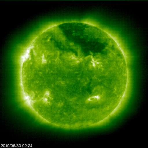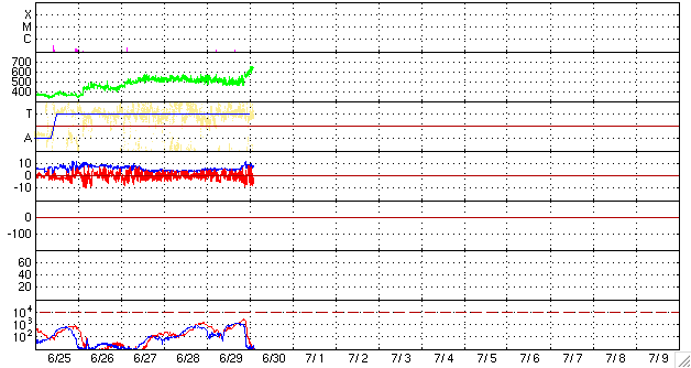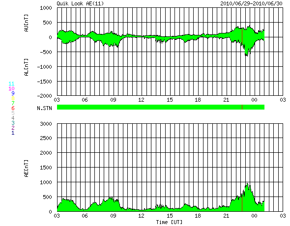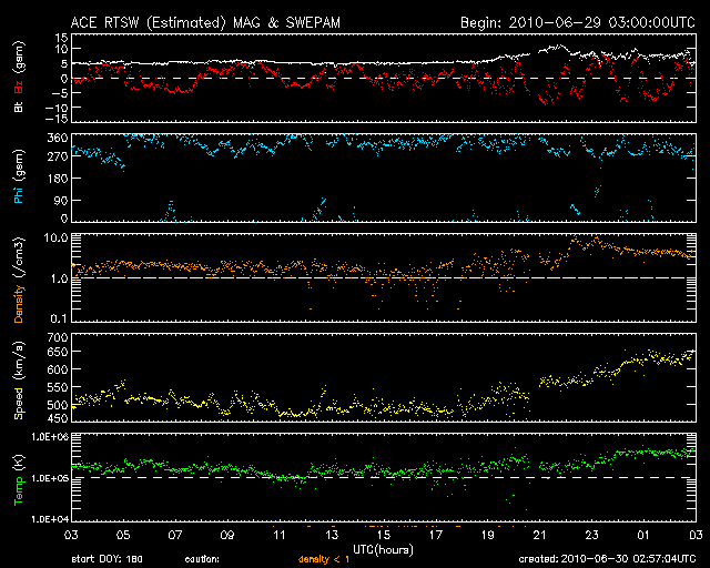 2010/ 6/30 11:57 更新 太陽風の速度は630km/秒に上がり、高速風が強まっています。オーロラ活動も強まっています。 担当 篠原 太陽風の速度が、もう一段上昇しています。 昨日より500km/秒前後で推移していた太陽風の速度は、 今朝、30日6時(世界時29日21時)頃よりゆっくりと上昇し、 現在630km/秒に上がっています。 前周期に見られた高速風領域の第二波が、今回もやって来た様です。 ただし、今回は後半の方がより高い速度となっています。 ここまでは、およそ500km/秒とあまり速度の高くない高速風でしたが、 600km/秒台に上がり、しっかりした高速風となっています。 速度の上昇とともに、磁場強度は5nTから8nTへ強まっています。 このため、速度はもうしばらく上昇を続けるかもしれません。 引き続きACEのデータに注目してください。 太陽風速度の高まりとともに、磁気圏のオーロラ活動も強まりを見せています。 AE指数の図では、最新のデータで1000nTに迫る中規模の活動が発生しています。 こちらも、今後の変化に注目です。 高速太陽風は、これから4日程度は続くだろうと思います。 今日から明日にかけては、磁気圏でも活発な活動が続く可能性があります。 太陽では、昨日現れていた小さな黒点に1085黒点群という番号が付けられました。 しかし、黒点はもう消えていて、今日の写真では見つけることはできません。 現在は、1084黒点群の大きな丸い黒点がひとつ見えるだけです。 X線の変化もほとんどなく、太陽は静穏です。 SOHO EIT195による太陽コロナ。 (c) SOHO (ESA & NASA) ![]() SOHOによる太陽可視光写真。 (c) SOHO (ESA & NASA) ![]() ACEが観測した太陽風の磁場(1番上の枠、白線は全体の強度、赤線は南北成分) および、太陽風の密度(3番目の橙線)、速度(4番目の黄線) (c) NOAA/SWPC ![]() リアルタイムAE指数 下段のAEグラフの値が高くなると、オーロラ活動が活発化しています。 (c) 京都大学, NICT ![]() 27日の太陽周期に合わせたデータプロット 太陽が同じ面を地球に向けていた27日前の変化から、今後を予想することができます。 (c) NICT