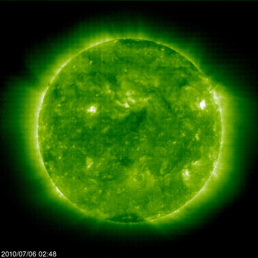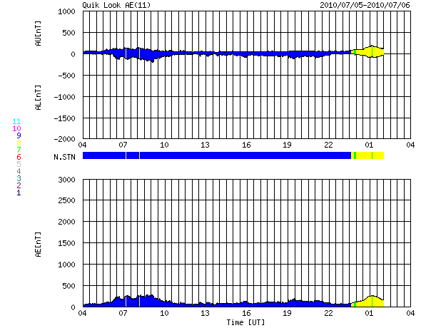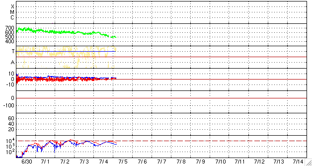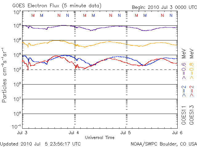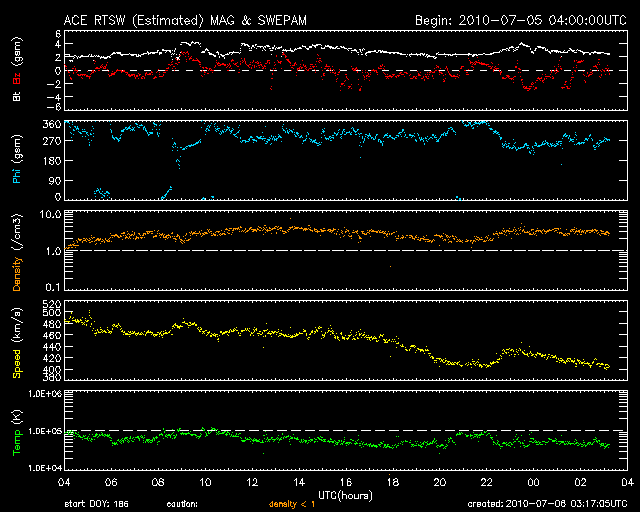 2010/ 7/ 6 12:17 更新 太陽風は通常の速度に下がりました。新しい黒点が出現しています。 担当 篠原 昨日報告しましたが、 6月30日に、宇宙天気ニュースのアクセス累計が300万件に達しました。 経過をまとめましたので、ご覧ください。 宇宙天気ニュース300万カウント到達 太陽風の速度は、昨日のニュース以降も下がり続け、 今朝くらいに、400km/秒と平均的な速度に戻りました。 磁場強度も3nTに弱まったままで、太陽風は穏やかになっています。 磁気圏も概ね静穏で、AE指数は200nTほどの小さな変化が見られる程度です。 太陽にはコロナホールは見られず、 これから1週間程度、穏やかな状態が続くでしょう。 (27日周期の図は、昨日より更新が止まっています。注意してください。) 放射線帯の高エネルギー電子は、ゆっくりと減少しています。 今日のグラフは、10,000の警戒ラインからは一段下がった印象です。 今後も、日を追う毎にゆっくりと低下していきます。 太陽では、1084黒点群のちょうど北半球側に、新しい黒点が出現しています。 1086黒点群と番号が付けられています。 X線グラフは、赤線が一段上昇しています。 1086黒点群の影響かもしれませんが、出現と変化は合っていないようで、 原因はよく分かりません。 特にフレアの変化は見られず、太陽は静穏の様です。 SOHO EIT195による太陽コロナ。 (c) SOHO (ESA & NASA) ![]() SOHOによる太陽可視光写真。 (c) SOHO (ESA & NASA) ![]() ACEが観測した太陽風の磁場(1番上の枠、白線は全体の強度、赤線は南北成分) および、太陽風の密度(3番目の橙線)、速度(4番目の黄線) (c) NOAA/SWPC ![]() リアルタイムAE指数 下段のAEグラフの値が高くなると、オーロラ活動が活発化しています。 (c) 京都大学, NICT ![]() 27日の太陽周期に合わせたデータプロット 太陽が同じ面を地球に向けていた27日前の変化から、今後を予想することができます。 (c) NICT