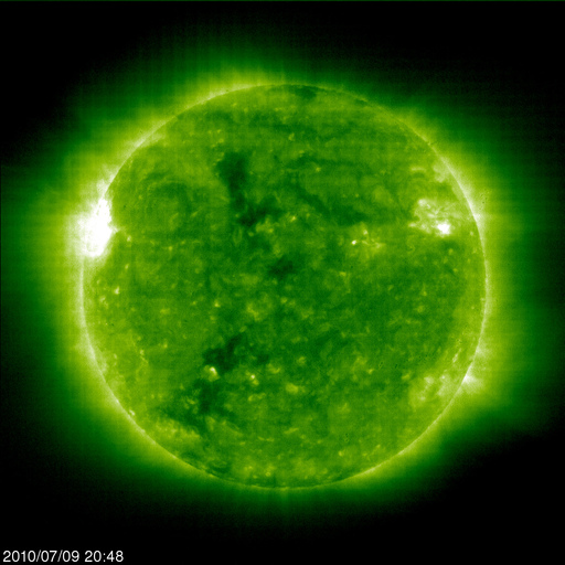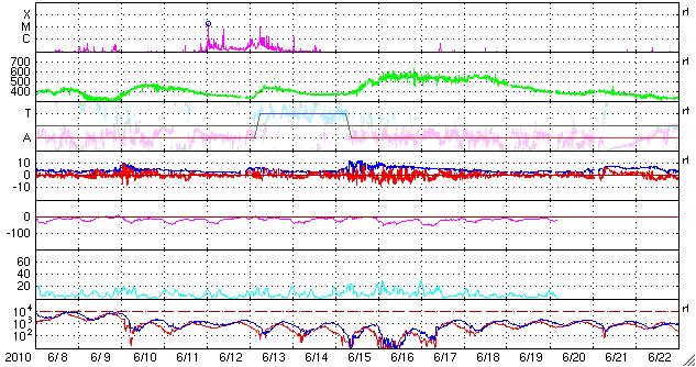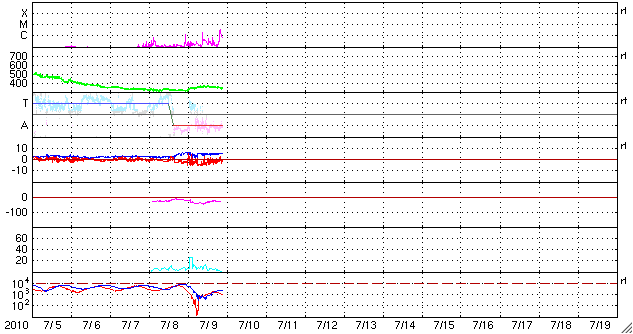 2010/ 7/10 06:19 更新 Cクラスの小規模フレアが発生しています。太陽風は低速です。 担当 篠原 太陽の北東(左上)に現れた活動領域に、小さな黒点が見えています。 1087黒点群と、番号が付けられたようです。 この黒点群が、Cクラスの小規模フレアを起こしています。 9日18時(世界時9日9時)に、C1.8、 10日4時(世界時9日19時)に、C3.4です。 どちらも規模は小さいですが、 黒点群は、活発に活動している様です。 今後の発達に注意して下さい。 太陽風は、低速状態が続いています。 速度は、320km/sから360km/sに少し上がっていて、 昨日の太陽風磁場の変化は、これに対応していたのかもしれません。 太陽風磁場は、南寄りになっています。 そのため、磁気圏がやや活動的になっています。 AE指数は300nT程度の小規模変動が続いています。 太陽風は、この後も基本的には低速状態が続くでしょう。 次の高速風をもたらすコロナホールは、太陽の中心線に近づいている所です。 今日は学校の用事で熊本の八代に来ています。 珍しく早朝の更新です。 SOHO EIT195による太陽コロナ (c) SOHO (ESA & NASA) ![]() SOHOによる太陽可視光写真。 (c) SOHO (ESA & NASA) ![]() GOES衛星の太陽X線データ (c) NOAA/SWPC ![]() ACEが観測した太陽風の磁場(1番上の枠、白線は全体の強度、赤線は南北成分) および、太陽風の密度(3番目の橙線)、速度(4番目の黄線) (c) NOAA/SWPC ![]() リアルタイムAE指数 下段のAEグラフの値が高くなると、オーロラ活動が活発化しています。 (c) 京都大学, NICT ![]() 27日の太陽周期に合わせたデータプロット 太陽が同じ面を地球に向けていた27日前の変化から、今後を予想することができます。 (c) 作図:宇宙天気ニュース