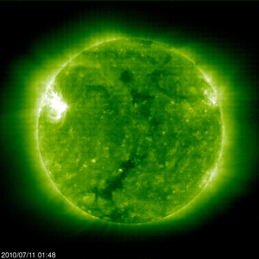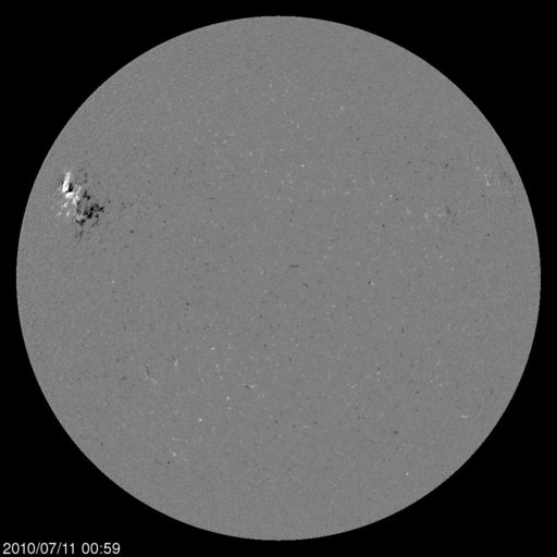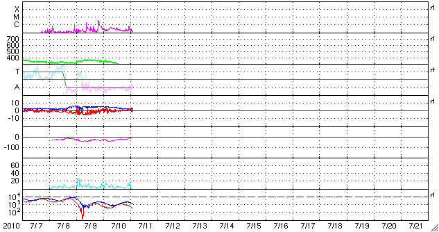 2010/ 7/11 11:56 更新 1087黒点群は、姿が大きくなっています。太陽風は、260km/sとかなり低速です。 担当 篠原 昨日、C3.4の小規模フレアを起こした1087黒点群は、 可視光写真でその姿が一気に大きくなっています。 磁場の写真でも、複雑な分布が見られるようになって来ました。 フレア活動としては、その後は目立った変化をしていません。 しかし、GOESのX線強度はBクラスに上がったままで、 今後活発化して、中小規模のフレアを発生させる可能性があります。 今朝にも、大きめのBクラスのフレアが起きていて、注目されます。 一方、太陽風は、昨夜に入って一段と速度が下がり、 260km/sとかなり遅い風になっています。 最近は、ここまで大きく下がるのは、月一回程度のことです。 磁気圏活動は静穏で、 AE指数は全く変化していません。 明日12日遅くか、明後日13日あたりから、 コロナホールによる高速の太陽風がやって来ると予想されます。 SOHO EIT195では、赤道を挟んで南北に伸びるコロナホールが、 太陽の真ん中に見えています。 27日周期の図を見ると、 12日の夜くらいに磁場強度が上昇を始め、 13日に入る頃から速度が上がりそうです。 前周期は、最高550km/sの高速風が、 3日半ほど続きました。 今回も同程度の高速風か、やや弱まるかもしれません。 SOHO EIT195による太陽コロナ (c) SOHO (ESA & NASA) ![]() SOHOによる太陽可視光写真。 (c) SOHO (ESA & NASA) ![]() SOHOによる太陽の磁場写真。 (c) SOHO (ESA & NASA) ![]() GOES衛星の太陽X線データ (c) NOAA/SWPC ![]() ACEが観測した太陽風の磁場(1番上の枠、白線は全体の強度、赤線は南北成分) および、太陽風の密度(3番目の橙線)、速度(4番目の黄線) (c) NOAA/SWPC ![]() リアルタイムAE指数 下段のAEグラフの値が高くなると、オーロラ活動が活発化しています。 (c) 京都大学, NICT ![]() 27日の太陽周期に合わせたデータプロット 太陽が同じ面を地球に向けていた27日前の変化から、今後を予想することができます。 (c) 作図:宇宙天気ニュース