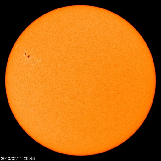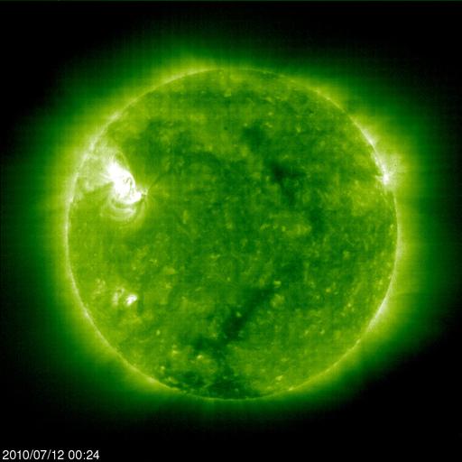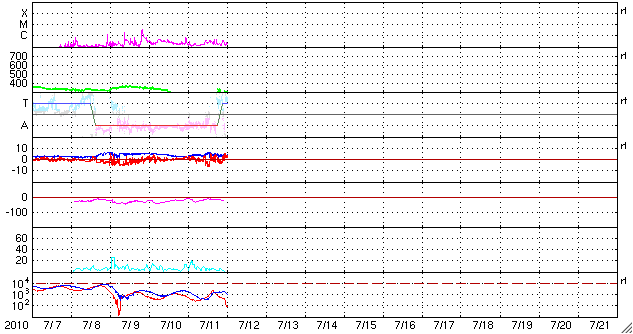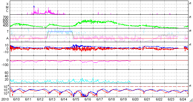 2010/ 7/12 09:55 更新 1087黒点群は、比較的穏やかです。太陽風は低速ですが、明日、高速風が到来しそうです。 担当 篠原 太陽の北東(左上)に見える1087黒点群は、 少しずつ黒点の形を変えながら、こちら側へ回ってきています。 可視光の見え方としては、黒点が前後ふたつに分かれていっているようです。 一昨日のC3.4以降、1087黒点群は目立ったフレア活動は起こしていませんが、 GOESのX線観測によると、Bクラスの小さな変動はずっと続いています。 今後活動を強めて、MクラスやCクラスの中小規模のフレアを発生させる可能性はあります。 引き続き注目してください。 また、太陽の南東(左下)側にも、小さな黒点が出現しています。 太陽風は、270km/秒から、310km/秒へわずかに上昇しています。 ACEのグラフでは、しっかり上昇しているように見えますが、 変化の幅は小さく、現在もかなり低速の太陽風です。 (27日周期の図で、全体を見るとよく分かります) このため、磁気圏も概ね静穏です。 そして、今夜か明日くらいから、 コロナホールによる高速の太陽風がやって来ると予想されます。 現在の太陽風は、全く穏やかですが、 今後、磁場強度が強まり始めると、それは速度上昇の前兆です。 27日周期の図を見て下さい。 前周期は、先ず6月15日に磁場強度が高まり、続いて16日に高速の太陽風がやって来ています。 今回到来する高速風がどのくらいの規模になるか、 コロナホールの規模が弱まっている様子なので、注目されます。 高速風は、3日程度続くと思われます。 SOHO EIT195による太陽コロナ。 (c) SOHO (ESA & NASA) ![]() SOHOによる太陽可視光写真。 (c) SOHO (ESA & NASA) ![]() GOES衛星の太陽X線データ (c) NOAA/SWPC ![]() ACEが観測した太陽風の磁場(1番上の枠、白線は全体の強度、赤線は南北成分) および、太陽風の密度(3番目の橙線)、速度(4番目の黄線) (c) NOAA/SWPC ![]() リアルタイムAE指数 下段のAEグラフの値が高くなると、オーロラ活動が活発化しています。 (c) 京都大学, NICT ![]() 27日の太陽周期に合わせたデータプロット 太陽が同じ面を地球に向けていた27日前の変化から、今後を予想することができます。 (c) 作図:宇宙天気ニュース
