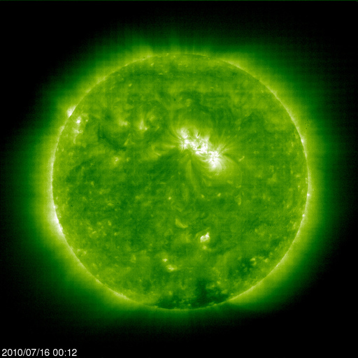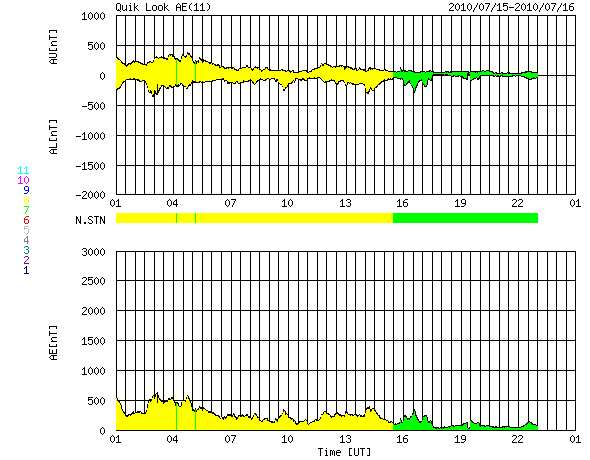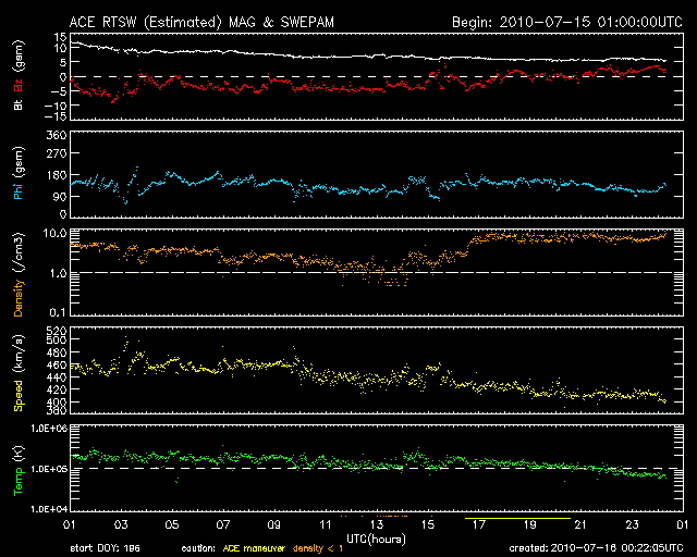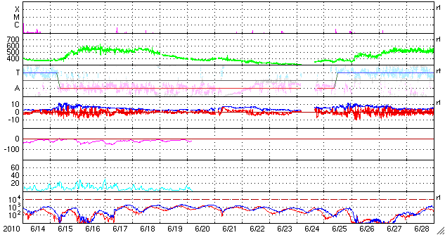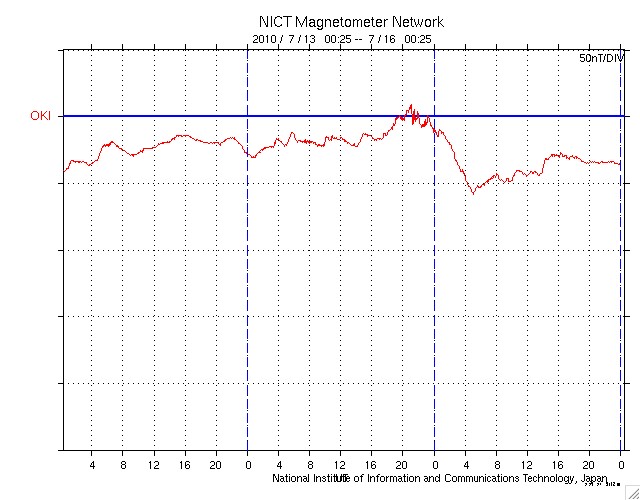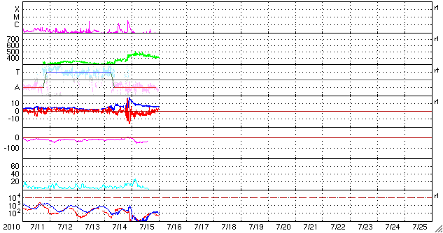 2010/ 7/16 09:23 更新 太陽は穏やかです。太陽風は速度が下がり、磁気圏も静穏になっています。 担当 篠原 昨日の朝のCクラスフレア以降、太陽では目立った活動は発生していません。 X線のグラフでは、Bクラスの小さなフレアが1度発生しただけです。 1087黒点群は、黒点としてはぽつんと小さく見える程度ですが、 EIT195を見ると、周囲に広い範囲で明るい活動領域が広がっています。 再び、間をおいてフレア活動を起こすかもしれませんので、 引き続き注目してください。 太陽風は、昨日の450km/秒が最高速だった様です。 昨日いっぱいはこの速度を保ちましたが、 夜遅くからゆっくりと下がり始め、現在は400km/秒と通常の速度に戻っています。 10nTを超えて強まっていた磁場強度も、 昨日のニュース以降はゆっくりと弱まり続け、 そろそろ5nTと、こちらも平均的な状態に戻りつつあります。 太陽風の乱れは、今回は規模も小さく、短期間で終わりました。 SOHO EIT195では、発生源のコロナホールはほとんど見えなくなっています。 速度の高まりがそれほどでもなかったため、磁気圏の擾乱は限定的でした。 AE指数は、その後1000nTの中規模変動が1度記録されましたが、 以降は、300nTほどの小規模活動程度です。 Dst指数も、50nTほどの減少に留まっています。 沖縄の磁場変化でその様子を見ることができます。 現在は太陽風も平均的な状態に戻り、これからは穏やかな風になるでしょう。 磁気圏も静穏になります。 放射線帯の高エネルギー電子は、減少から増加へ転じつつあります。 しかし、今回の磁気圏活動の様子から、あまり大きな増加にはならない様に思います。 明日のデータに注目してください。 SOHO EIT195による太陽コロナ。 (c) SOHO (ESA & NASA) ![]() SOHOによる太陽可視光写真。 (c) SOHO (ESA & NASA) ![]() GOES衛星の太陽X線データ (c) NOAA/SWPC ![]() ACEが観測した太陽風の磁場(1番上の枠、白線は全体の強度、赤線は南北成分) および、太陽風の密度(3番目の橙線)、速度(4番目の黄線) (c) NOAA/SWPC ![]() リアルタイムAE指数 下段のAEグラフの値が高くなると、オーロラ活動が活発化しています。 (c) 京都大学, NICT ![]() 沖縄の磁場擾乱 下へ下がるほど、擾乱が発達している事を意味します。 (c) NICT ![]() 27日の太陽周期に合わせたデータプロット 太陽が同じ面を地球に向けていた27日前の変化から、今後を予想することができます。 (c) 作図:宇宙天気ニュース
