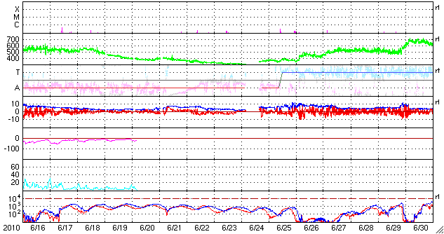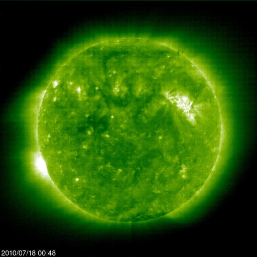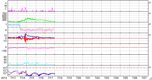 2010/ 7/18 10:07 更新 C2.4の小規模フレアが発生しました。太陽風は320km/秒の低速風です。 担当 篠原 深夜、18日2時(世界時17日17時)に、 1087黒点群で、C2.4の小規模フレアが発生しました。 SOHO EIT195の動画を見ると、激しく輝くというより、 コロナが噴き上げるような爆発の仕方をしています。 これに伴って、CME(太陽ガスの放出現象)が発生したようです。 規模は小さいのですが、地球へも影響がやって来る可能性があります。 4〜5日後くらいの太陽風の変化に注目してください。 1087黒点群は、黒点としてはだいぶ小さくなりました。 しかし、EIT195に見える活動領域は広く、 今回のような小規模活動をまた発生させるかもしれません。 EIT195では、北東(左上)の端付近に小さな活動領域が見え、 南東(左下)からは新しい活動領域が上がりつつあります。 今後は、これらの領域の活動に注目が移りそうです。 太陽風は、速度の低下が続き、320km/秒とすっかり低速の風になりました。 27日周期の図を見ると、この期間の太陽風速度は、 前周期(6月22日〜24日)も300km/秒近い低速風だったことが分かります。 今回も、これから22日くらいにかけて低速の太陽風が続くと予想されます。 磁気圏のオーロラ活動も非常に静穏で、AE指数は全く変化していません。 放射線帯の高エネルギー電子も、低いレベルで安定しています。 こちらは、次の高速風の到来までこの状態が続くでしょう。 SOHO EIT195による太陽コロナ。 (c) SOHO (ESA & NASA) ![]() SOHOによる太陽可視光写真。 (c) SOHO (ESA & NASA) ![]() GOES衛星の太陽X線データ (c) NOAA/SWPC ![]() ACEが観測した太陽風の磁場(1番上の枠、白線は全体の強度、赤線は南北成分) および、太陽風の密度(3番目の橙線)、速度(4番目の黄線) (c) NOAA/SWPC ![]() リアルタイムAE指数 下段のAEグラフの値が高くなると、オーロラ活動が活発化しています。 (c) 京都大学, NICT ![]() 27日の太陽周期に合わせたデータプロット 太陽が同じ面を地球に向けていた27日前の変化から、今後を予想することができます。 (c) 作図:宇宙天気ニュース
