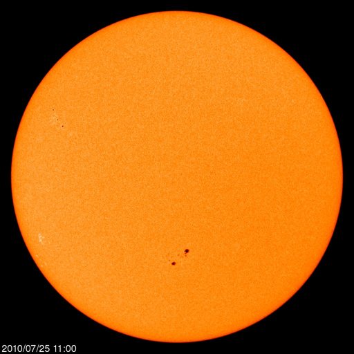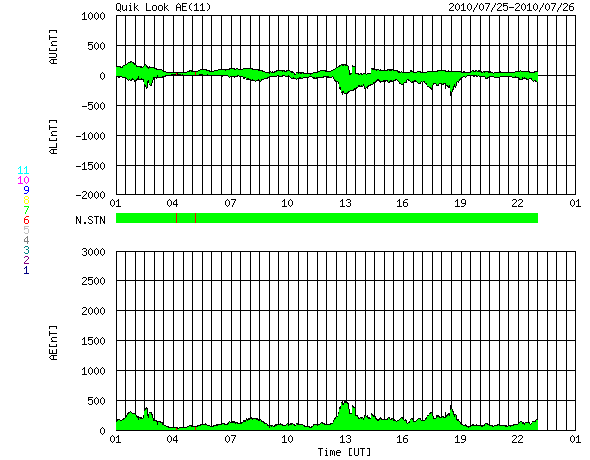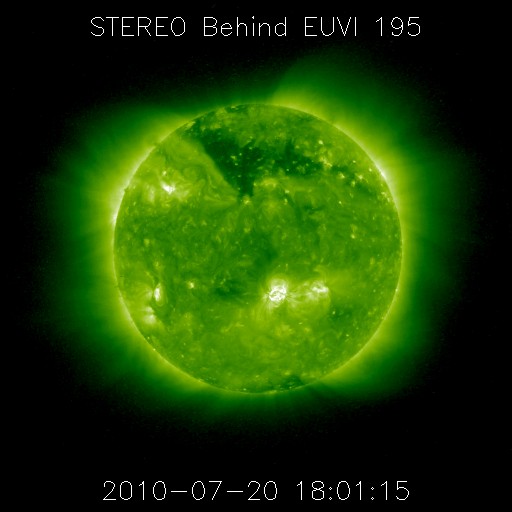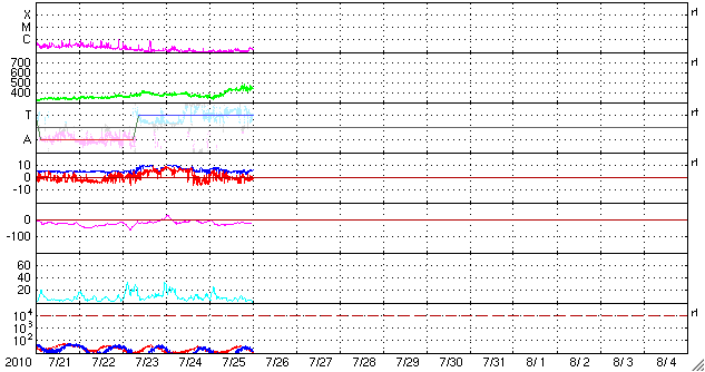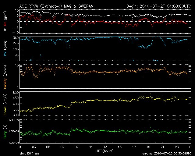 2010/ 7/26 09:30 更新 太陽風は450km/秒とやや高速の状態になっています。今後、更に高速の風が来る可能性があります。 担当 篠原 昨日の午後くらいから、太陽風の速度がゆっくりと上がって、 450km/秒とやや高速の風になりました。 高速風領域が回帰してきたと見られますが、その勢いは弱く、 27日周期の図で前周期と比較すると、高速風の分布がずいぶん変わっているようです。 SOHO EITの写真更新が停止しているので、 今日は、5日前にSTEREO Behindで撮影された太陽コロナ写真を掲載します。 地球とSTEREO Behindの位置は、5日分ほどずれています。 このため、5日前の写真より、現在地球から見える太陽の様子を推定することができます。 すると、太陽の北半球側に大きくコロナホールが広がっている事が分かります。 先頭(左側)は既に、太陽の西端(右端)まで大きく迫り出していますが、 現在までの太陽風の様子から、 この部分からの影響はほとんどなくなっていることになります。 続いて、コロナホールの太い部分が太陽の中心線を通過しています。 今後は、この領域からの影響がやって来ると考えられます。 前周期同様に、速度の高い太陽風がこれからやってくる可能性があります。 引き続き注目してください。 現在の磁気圏活動は、AE指数で300〜500nTの変化が時々見られる程度で、 比較的穏やかです。 速度が多少上がってきていますが、今後、更に上昇すると、 オーロラ活動も一段と活発化する可能性があります。 太陽は、中心の南側に1089黒点群、北東側(左上)に1090黒点群が見えています。 どちらも活動は特に起こしておらず、太陽は穏やかです。 特に、1089群は、黒点が少なくなり、形も単純になっていて、 勢力は弱まり続けているようです。 STEREO Behindによる、5日前の太陽コロナ。この写真から、地球から見える現在の太陽を推定できます。 (c) NASA ![]() SOHOによる太陽可視光写真。 (c) SOHO (ESA & NASA) ![]() ACEが観測した太陽風の磁場(1番上の枠、白線は全体の強度、赤線は南北成分) および、太陽風の密度(3番目の橙線)、速度(4番目の黄線) (c) NOAA/SWPC ![]() リアルタイムAE指数 下段のAEグラフの値が高くなると、オーロラ活動が活発化しています。 (c) 京都大学, NICT ![]() 27日の太陽周期に合わせたデータプロット 太陽が同じ面を地球に向けていた27日前の変化から、今後を予想することができます。 (c) 作図:宇宙天気ニュース
