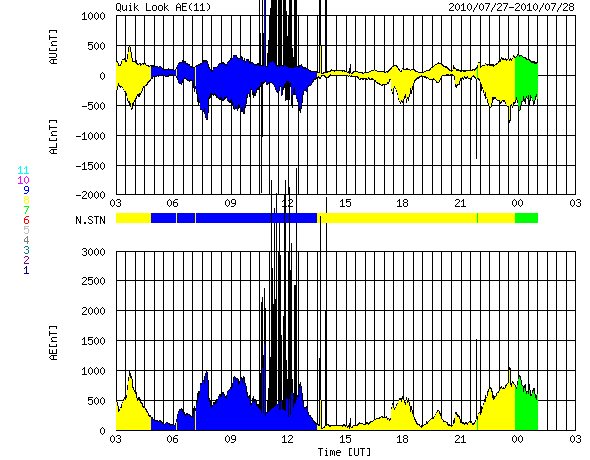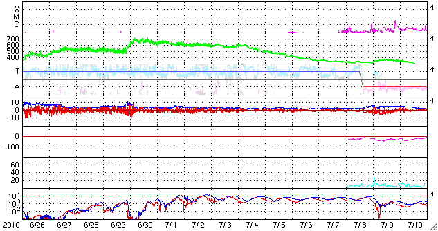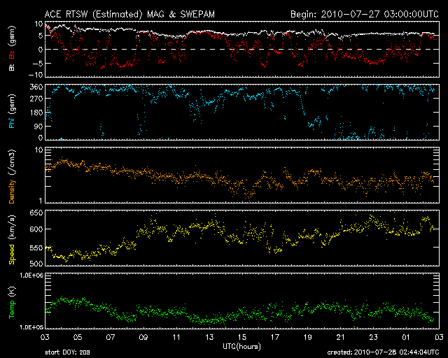 2010/ 7/28 11:45 更新 高速太陽風が600km/秒台に上昇し、磁気圏のオーロラ活動も強まっています。 担当 篠原 昨日の夕方より、太陽風の速度はもう一段上昇して、600km/秒になりました。 やや遅れましたが、前周期に比較的近いタイミングで、 より速度の高い太陽風がやって来ました。 前周期同様に、このまま600km/秒台が続くのか、 すぐに500km/秒台に下がってしまうのか、今後の変化にも注目してください。 速度がだいぶ高まったことと、磁場強度が5nTをやや超えるレベルにあったため、 磁気圏のオーロラ活動も活発化しています。 AE指数では、800〜900nTに達する中規模活動が頻繁に記録されています。 太陽のコロナ写真を見ると、コロナホールの最も広い領域から影響を受けるのは、 明日、明後日くらいと見込まれます。 従って、高速風は、もう2〜3日程度は勢いの良い状態が続き、 その後、ゆっくりと弱まっていくのではないでしょうか。 27日周期の図で、前周期の変化と見比べながら、今後の展開に注目してください。 高速風を受けて、放射線帯の高エネルギー電子が増加を始めました。 今日の変化はまだ小幅ですが、明日以降、警戒レベルへ増加する可能性があるので、 今後は、このグラフにも注意してください。 太陽は、昨日、C2の小規模フレアが発生したきりで、 それ以降は、Bクラスの小さな変化が見られた程度です。 一方、太陽東端に見える活動領域は、いよいよこちら側に現われます。 X線のグラフはやや落ち着いていますが、1日おきに活動が強まったりすることもあるので、 こちらの変化にも注意が必要です。 GOES-14のX線カメラによる太陽コロナ。 (c) NOAA SOHOによる太陽可視光写真。 (c) SOHO (ESA & NASA) ![]() ACEが観測した太陽風の磁場(1番上の枠、白線は全体の強度、赤線は南北成分) および、太陽風の密度(3番目の橙線)、速度(4番目の黄線) (c) NOAA/SWPC ![]() リアルタイムAE指数 下段のAEグラフの値が高くなると、オーロラ活動が活発化しています。 (c) 京都大学, NICT ![]() 27日の太陽周期に合わせたデータプロット 太陽が同じ面を地球に向けていた27日前の変化から、今後を予想することができます。 (c) 作図:宇宙天気ニュース