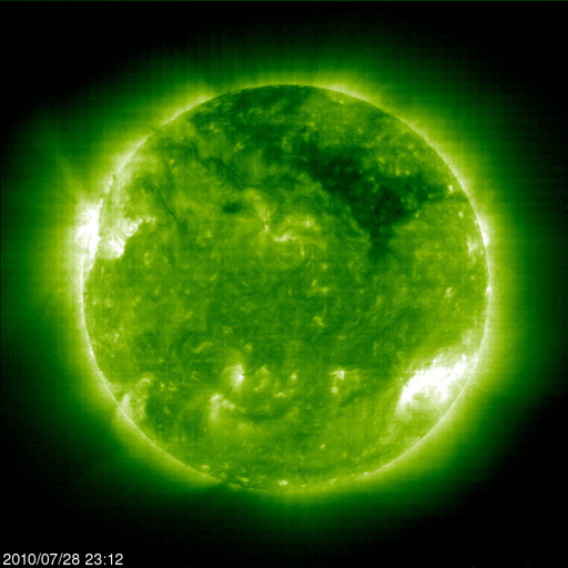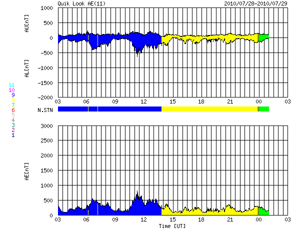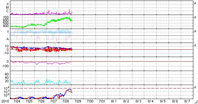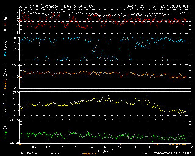 2010/ 7/29 11:21 更新 太陽風の速度が700km/秒近くまで上昇しました。オーロラ活動はそれほど強まっていません。 担当 篠原 昨日のニュース以降も、太陽風の速度はゆっくりと上昇し、 夜には、680km/秒くらいまで上昇しました。 今朝に入ってやや下がり、現在は600km/秒の高速風です。 27日周期の図を見て下さい。 結果的に、前周期とほぼ同じレベルまで最高速度は上がりました。 しかし、最初にぐっと速度が上がった前周期(6月30日)に対して、 今回は、2日ほどかけて最高速度へ達する様な(7月27-28日)変化になりました。 磁場強度は、4nTヘ下がっています。 変化としては小幅ですが、5nTを割ったということは、 高速風領域の山は越えたのかもしれません。 磁気圏のオーロラ活動は、AE指数で600nTが最高で、 その他は、目立った活動になっていません。 速度は上昇しましたが、磁場の南北成分は0nT付近に留まっていて、 太陽風から磁気圏へのエネルギーの流れ込みが小さかった様です。 この後は、磁場強度は弱まる傾向ですから、 オーロラが大きく活発化することはないでしょう。 SOHOのEIT195の更新が再開されています。 これによると、コロナホールの最も太い部分は、西側に半分ほど迫り出していて、 地球への影響が最も強まっているタイミングだと思われます。 今日、明日と高い速度が続いて、その後、ゆっくりと低下に向かうでしょう。 太陽風の変動を受けて、放射線帯の高エネルギー電子が、 数千のレベルまで一気に増加しています。 明日以降、警戒レベルに達しそうですので、 衛星の運用などでは注意が必要になるでしょう。 太陽では、今朝、29日5時半(世界時28日20時半)に、C2.8の小規模フレアが発生しました。 西の端(右端)に近づいている、1089黒点群です。 この黒点群は、こうやって思い出したように活動を起こします。 一方、東側から新しい黒点群が顔を出しています。 1092黒点群です。 こちらは黒点の構造が単純で、STEREOで見ていると、活動度は下がってきている印象です。 SOHO EIT195による太陽コロナ。 (c) SOHO (ESA & NASA) ![]() SOHOによる太陽可視光写真。 (c) SOHO (ESA & NASA) ![]() ACEが観測した太陽風の磁場(1番上の枠、白線は全体の強度、赤線は南北成分) および、太陽風の密度(3番目の橙線)、速度(4番目の黄線) (c) NOAA/SWPC ![]() リアルタイムAE指数 下段のAEグラフの値が高くなると、オーロラ活動が活発化しています。 (c) 京都大学, NICT ![]() 27日の太陽周期に合わせたデータプロット 太陽が同じ面を地球に向けていた27日前の変化から、今後を予想することができます。 (c) 作図:宇宙天気ニュース