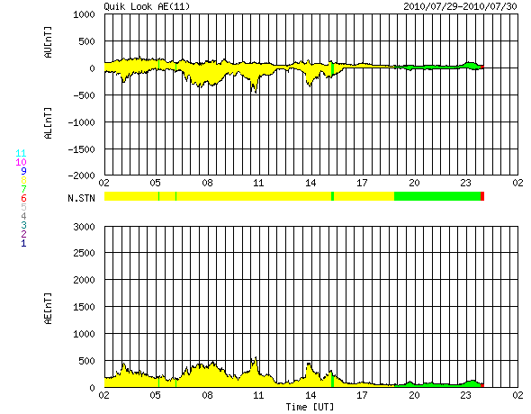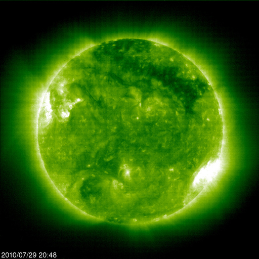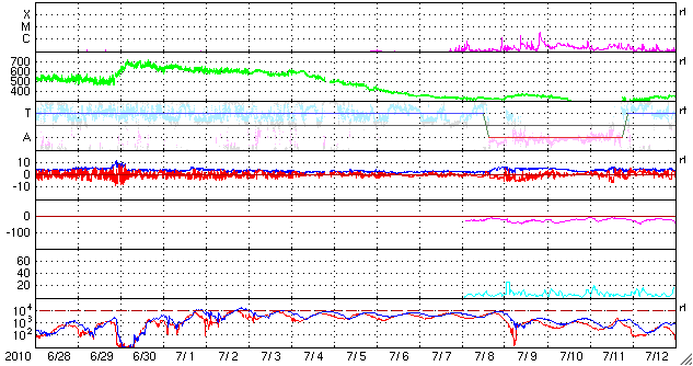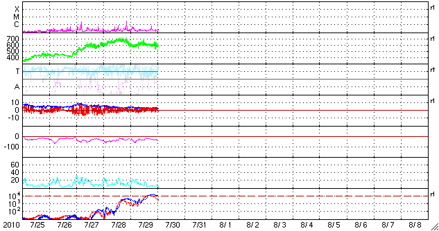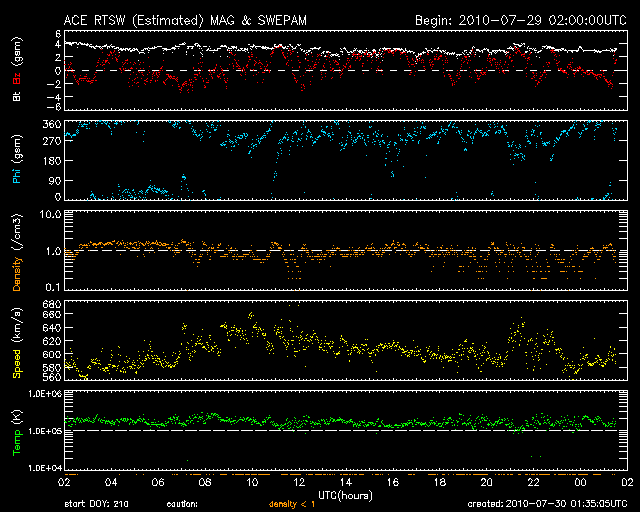 2010/ 7/30 10:32 更新 600km/秒の高速太陽風が続いています。高速風は、後半にさしかかっているようです。 担当 篠原 600km/秒前後の高い速度の太陽風が続いています。 一方、太陽風の磁場強度は、4nTから3nTへ下がっています。 現在、地球は、高速風領域の最も強い部分を通過しているところです。 磁場強度が弱まってきたことから、後半部に入ろうとしていると思われます。 SOHO EIT195では、高速風の発生源であるコロナホールは、 次第に緯度が上がって、北極へ向かって伸びています。 こうなると、地球への影響は弱まってきます。 前周期同様に(27日周期の図参照)、 明日以降は、太陽風の勢いは次第に弱まっていくでしょう。 8月2日には、普通の速度に戻りそうです。 磁気圏は、やや活動的な状態です。 AE指数では、500nTほどの変動が数時間ごとに観測されています。 太陽風の速度はずいぶん上がっているのですが、 磁場の南北成分は北寄りになっているため(ACEの赤線がプラス方向に寄っている)、 磁気圏へエネルギーが流れ込みにくい状態が続いているためです。 太陽風は次第に弱まっていくと思われるので、、 オーロラ活動もこれ以上活発化することはないでしょう。 放射線帯の高エネルギー電子が10,000のラインに達しています。 こちらは、一旦増えるとしばらく続きます。 衛星の運用などでは、注意してください。 太陽の可視光写真は、昨日と同じです。 X線のデータは、Bクラスの小さな変化は起きていますが、 特に強まっているなどの様子は見られません。 1089群、1092群ともに、Cクラス程度のフレアへの注意でよいでしょう。 SOHO EIT195による太陽コロナ。 (c) SOHO (ESA & NASA) ![]() SOHOによる太陽可視光写真。 (c) SOHO (ESA & NASA) ![]() ACEが観測した太陽風の磁場(1番上の枠、白線は全体の強度、赤線は南北成分) および、太陽風の密度(3番目の橙線)、速度(4番目の黄線) (c) NOAA/SWPC ![]() リアルタイムAE指数 下段のAEグラフの値が高くなると、オーロラ活動が活発化しています。 (c) 京都大学, NICT ![]() 27日の太陽周期に合わせたデータプロット 太陽が同じ面を地球に向けていた27日前の変化から、今後を予想することができます。 (c) 作図:宇宙天気ニュース