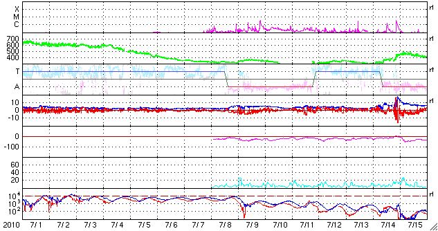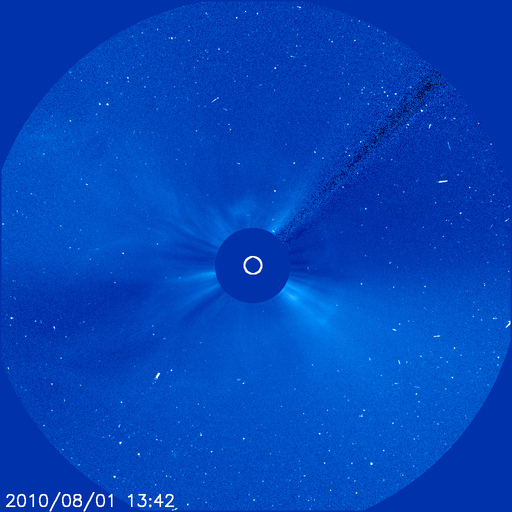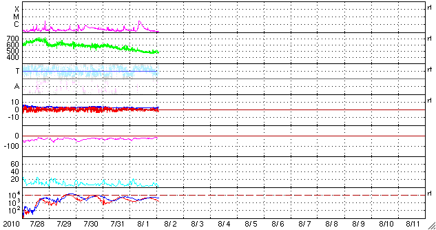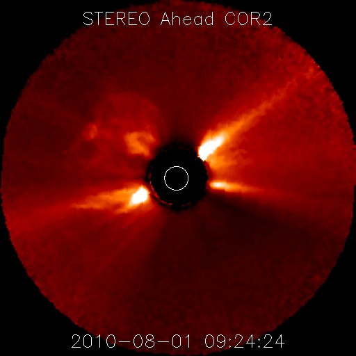 2010/ 8/ 2 11:31 更新 C3の小規模フレアが発生しました。CMEを伴っており、地球へ影響が来るでしょう。 担当 篠原 昨日の夕方、1日17時(世界時1日8時)に、C3.2の小規模フレアが発生しました。 発生箇所は、1092黒点群です。 X線のグラフが長時間増加する長時間タイプのフレアで、 同時にCME(太陽ガスの放出現象)も発生しています。 しかし、この時間帯に、SOHO、STEREO Behundの更新が止まっていて、 詳しい様子を見ることができませんでした。 最初に写真を2枚掲載しますが、1枚目は、SOHO LASCO C3の少し遅れての写真です。 CMEで噴き出したガスが、太陽の周囲に広く漂っている様子が分かります。 1092黒点群は太陽の中ほどに来ていたため、 太陽を包むように広がる、ハロー型のCMEとなった様です。 2枚目の写真は、もう少し前の時間のSTEREO Ahead COR2です。 太陽から左に向かって(地球の方向)、ガスが飛び出しています。 CMEの擾乱の到着まで3日前後と見込むと、明後日、4日ごろとなるでしょうか。 CMEの規模から考えて、あまり大きな変動にはならないと思いますが、 飛ばされてくる磁場の変動によっては、案外大きな乱れとなることもあります。 オーロラ活動が強まるチャンスですので、注目してください。 現在の太陽風は、速度がまた少し下がって、480km/秒となっています。 前周期よりはがんばっていますが、高速風は終わりに近づいています。 今日、明日と一旦下がって、その後、CMEによる擾乱の到来となるでしょう。 磁気圏の活動も、現在は小規模で、AE指数はほとんど変化していません。 放射線帯の高エネルギー電子は、警戒ライン(10,000)を少し割ったレベルで安定しています。 明日より、8月11日までカムチャッカ半島へ観測装置のメンテナンスに出かけます。 現地より記事の更新はできる予定ですが、更新の時間や頻度が不定になります。 ご了解下さい。 SOHO LASCO C3によるCMEの広がり。 (c) SOHO (ESA & NASA) ![]() STEREO Aheadによる、CMEの噴出の様子。左が地球の方向。 (c) NASA ![]() SOHO EIT195による太陽コロナ。 (c) SOHO (ESA & NASA) ![]() SOHOによる太陽可視光写真。 (c) SOHO (ESA & NASA) ![]() GOES衛星の太陽X線データ (c) NOAA/SWPC ![]() ACEが観測した太陽風の磁場(1番上の枠、白線は全体の強度、赤線は南北成分) および、太陽風の密度(3番目の橙線)、速度(4番目の黄線) (c) NOAA/SWPC ![]() リアルタイムAE指数 下段のAEグラフの値が高くなると、オーロラ活動が活発化しています。 (c) 京都大学, NICT ![]() 27日の太陽周期に合わせたデータプロット 太陽が同じ面を地球に向けていた27日前の変化から、今後を予想することができます。 (c) 作図:宇宙天気ニュース