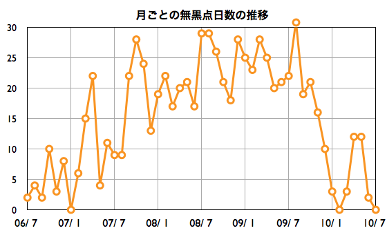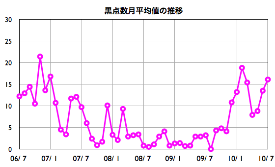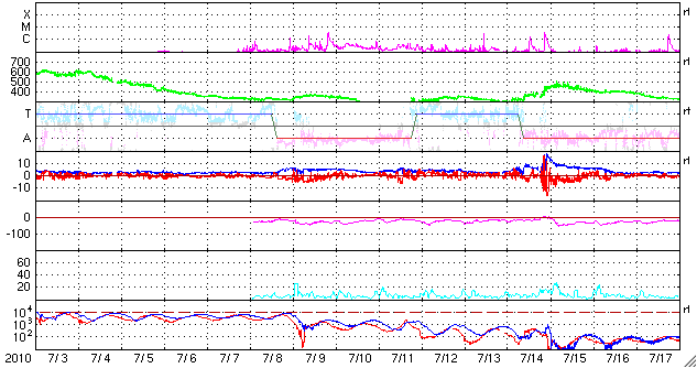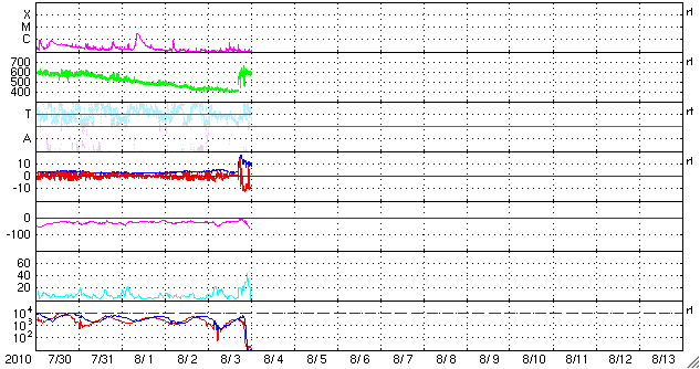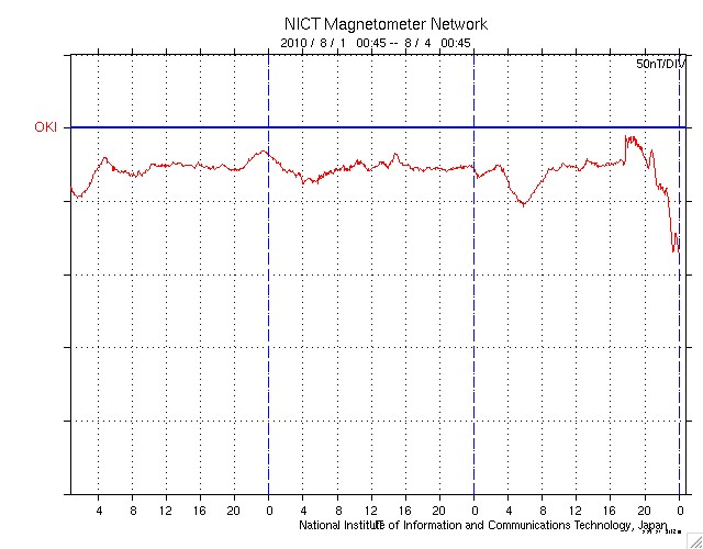 2010/ 8/ 4 09:45 更新 CMEによる太陽風の擾乱が到来し、磁気嵐が発生しています。7月の黒点数を報告します。 担当 篠原 SIDCより、7月の黒点数が発表されました。 それによると、7月は31日間すべての日で黒点が見えていて、 無黒点日数は0日でした。 今年の2月以来、今期2度目です。 1枚目のグラフを見て下さい。 4月、5月と無黒点の日数が再び上昇して、どうなることかと思いましたが、 6月にまた下がって、7月も0日と、全体として日数減少の傾向は続いているようです。 そろそろ無黒点日数では太陽活動の変化が見にくくなってきたので、 今回は、黒点数の一ヶ月平均値のグラフを作成しました。 縦軸が同じ数字なので紛らわしいですが、こちらは日数ではなく、黒点数です。 7月の平均値は15程度だったということになります。 黒点数というのは、[黒点群の数] × [10] + [黒点の数] と計算します。 このため、黒点がひとつ見えていると、1 ではなく、1×10+1=11 となるのです。 従って、月平均が15ということは、 小さな黒点群が毎日1〜2個ほど見えていたというくらいの数値です。 全く大きな数値ではありません。 それにしても、黒点数グラフを見ると、2008年から2009年にかけて、 0に張り付くような変化をしています。 本当に黒点が少なかったのだなと実感されます。 さて、その太陽ですが、今日は1092黒点群がほぼ中心に来ています。 X線データを見ると、Bクラスの小さな活動がいくつか発生していますが、 またおとなしくなった印象です。 Cクラスのフレアなどを起こす可能性はありますが、 活動度としてはその程度でしょう。 太陽風は、夜のうちに、CMEの影響である擾乱がやって来ました。 ACEの観測によると、4日2時(世界時3日17時)に、 太陽風の速度が600km/秒、磁場強度が15nTへ急に強まる変動がやって来ました。 C3フレアの発生から2日半ほどです。 フレアの規模が比較的小さかった割には、速度が大きく上昇している印象です。 磁場の強まりは、初めは北向きだったのですが、 1時間ほどで南向きに転じ、-10nTの強い南向き磁場が5時間にわたって続いています。 その間、速度も600km/秒に高まっていて、大きなエネルギーが磁気圏に流れ込んでいます。 AE指数は既に1000nTに達する大きな変動を記録しています。 この活動は現在も続いていると思われます。 また、京都大学のDst指数も-100nTの減少を記録しており、磁気嵐が発生しています。 Dstの減少はまだ続いていて、磁気嵐の規模はもう一段階強まる可能性があります。 その様子は、沖縄の磁場データでも見ることができます。 沖縄の図の場合、地方時の関係があるためDst指数の減り方をそのまま見ることはできません。 それでも、現在、-70nT程度の変動幅(下がり幅)となっています。 (磁場データにオフセットが発生しているようで、静穏レベルは青線よりも下にあるようです) CMEの規模から考えて、太陽風の乱れはあまり長く続かないと思います。 今日1日程度高速状態が続いて、明日には下がり始めるのではないでしょうか。 下がっていくと、今度は300km/秒台の低速風に変わるかもしれません。 27日周期の図によると、前周期のこの期間はかなり遅い太陽風が続いています。 放射線帯の高エネルギー電子は、太陽風の乱れを受けて大きく減少しています。 磁気圏の乱れによって、この後大きく増加する可能性があります。 今後の変化に注意してください。 2006年7月以降の、月ごとの無黒点日数の変化。 (c) 作図 : 宇宙天気ニュース、データ : SIDC ![]() 2006年7月以降の、黒点数の月平均値。 (c) 作図 : 宇宙天気ニュース、データ : SIDC ![]() SOHOによる太陽可視光写真。 (c) SOHO (ESA & NASA) ![]() GOES衛星の太陽X線データ (c) NOAA/SWPC ![]() ACEが観測した太陽風の磁場(1番上の枠、白線は全体の強度、赤線は南北成分) および、太陽風の密度(3番目の橙線)、速度(4番目の黄線) (c) NOAA/SWPC ![]() リアルタイムAE指数 下段のAEグラフの値が高くなると、オーロラ活動が活発化しています。 (c) 京都大学, NICT ![]() 沖縄の磁場擾乱 下へ下がるほど、擾乱が発達している事を意味します。 (c) NICT ![]() 27日の太陽周期に合わせたデータプロット 太陽が同じ面を地球に向けていた27日前の変化から、今後を予想することができます。 (c) 作図:宇宙天気ニュース