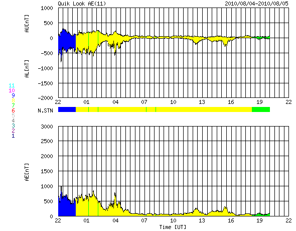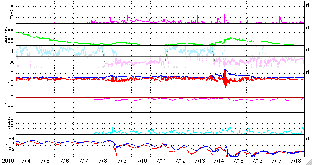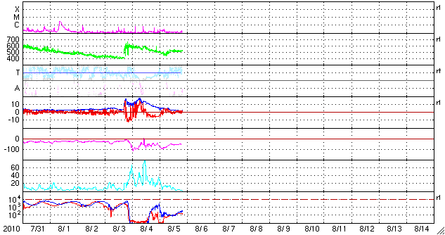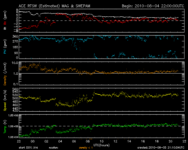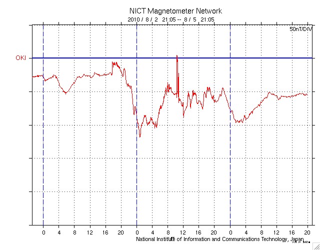2010/ 8/ 6 06:10 更新 高速太陽風は続いていますが、大きな乱れは終わりました。 担当 篠原 CMEによる太陽風の乱れは、まだ残っています。 現在の太陽風の速度は、500km/秒と依然高速状態が続いています。 しかし、磁場強度はすっかり弱ってしまって、2nTほどになっています。 この後、速度も低下に向かうと思われます。 以降は穏やかな太陽風となるでしょう。 磁気圏の乱れも、ほぼ収まっています。 AE指数の変化は、昨日の昼以降すっかり小さくなっています。 図の後半は200nTほどの変化しかありません。 沖縄の磁場変化は、まだ50nT近く下がった状態です。 磁気嵐に発生する環電流はゆっくりと減少しますので、 こちらの影響はもう数日残るでしょう。 しかし、磁気圏としては静穏になったと言えます。 放射線帯の高エネルギー電子は、現在もそれほど強まっていません。 今回は高まることはないでしょう。 太陽も静穏のようです。 黒点の様子に特に変化はなく、X線データにもほとんど変化は見られません。 今日は時間がほとんどないので、簡単な更新です。 週末いっぱい、更新が不定期になる可能性があります。 SOHO EIT195による太陽コロナ。 (c) SOHO (ESA & NASA) ![]() SOHOによる太陽可視光写真。 (c) SOHO (ESA & NASA) ![]() ACEが観測した太陽風の磁場(1番上の枠、白線は全体の強度、赤線は南北成分) および、太陽風の密度(3番目の橙線)、速度(4番目の黄線) (c) NOAA/SWPC ![]() リアルタイムAE指数 下段のAEグラフの値が高くなると、オーロラ活動が活発化しています。 (c) 京都大学, NICT ![]() 沖縄の磁場擾乱 下へ下がるほど、擾乱が発達している事を意味します。 (c) NICT ![]() 27日の太陽周期に合わせたデータプロット 太陽が同じ面を地球に向けていた27日前の変化から、今後を予想することができます。 (c) 作図:宇宙天気ニュース