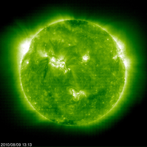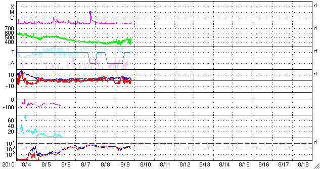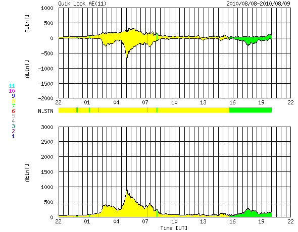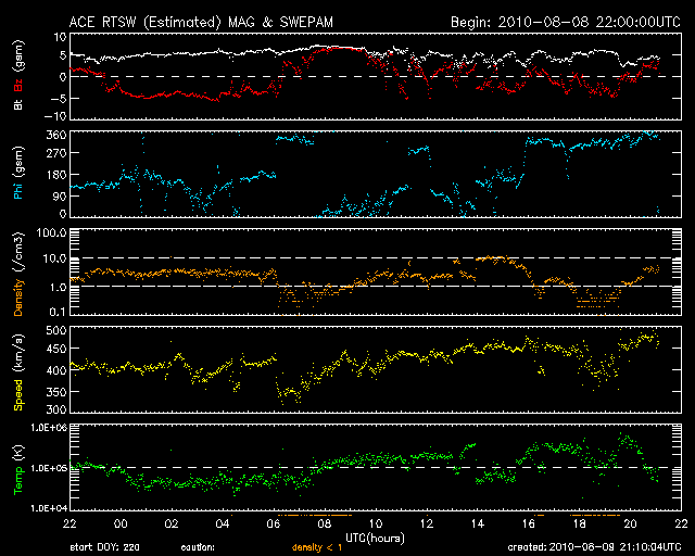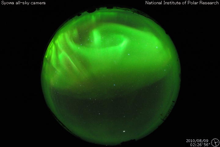 2010/ 8/10 06:11 更新 太陽風の速度がやや高速になっています。南向き磁場の影響で、オーロラ活動が活発になりました。 担当 篠原 太陽風の速度がやや上昇しています。 昨日の午後くらいからじわじわっと上がって、現在470km/秒ほどになっています。 はっきりした上がり方ではないため、掲載のACEの図では分かりにくい変化です。 磁場強度は、強弱の変化はありますが、5nT前後を保っています。 太陽に目立ったコロナホールなどはありませんでしたので、 ここから大きく変化することはないと思います。 この速度の上昇に先立って、 太陽風の磁場が7時間にわたって-5nTの南向きになりました。 この影響で活発なオーロラが発生しています。 AE指数では、500nTから最大で900nTの中規模の変化が発生しています。 南極、昭和基地の全天カメラで、このオーロラの最初の輝きがとらえられています。 その1枚を下に掲載します。 活動が最大の頃は空が明るくなっていて、残念ながら撮影されていませんでした。 太陽は、黒点がいくつも見えていてにぎやかですが、 X線データではほとんど変化はなく、太陽は静穏です。 太陽の中央やや上に新しく現われた1096黒点群が、少し成長しています。 更に広がるでしょうか。 SOHO EIT195によると、東端(左端)から強く光る活動領域が上がってきました。 可視光写真にも、白斑が見えています。 STEREO Behindの動画を参照すると、それほど活動的でもないようです。 南極の昭和基地で、全天カメラにより撮影されたオーロラ。 (c) 国立極地研究所 ![]() SOHO EIT195による太陽コロナ。 (c) SOHO (ESA & NASA) ![]() SOHOによる太陽可視光写真。 (c) SOHO (ESA & NASA) ![]() ACEが観測した太陽風の磁場(1番上の枠、白線は全体の強度、赤線は南北成分) および、太陽風の密度(3番目の橙線)、速度(4番目の黄線) (c) NOAA/SWPC ![]() リアルタイムAE指数 下段のAEグラフの値が高くなると、オーロラ活動が活発化しています。 (c) 京都大学, NICT ![]() 27日の太陽周期に合わせたデータプロット 太陽が同じ面を地球に向けていた27日前の変化から、今後を予想することができます。 (c) 作図:宇宙天気ニュース