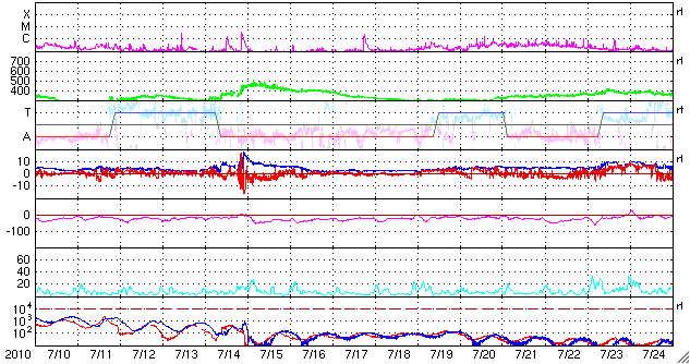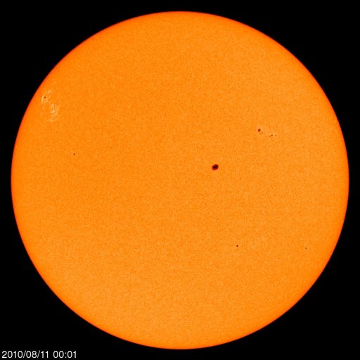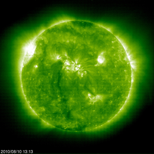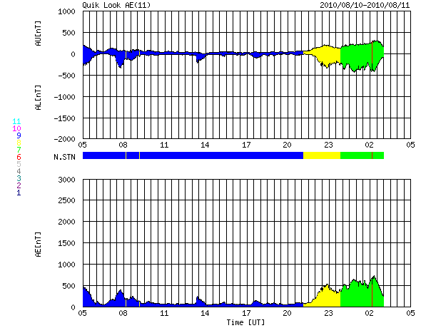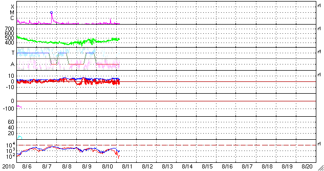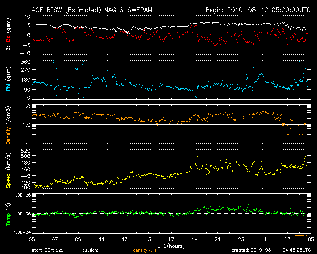 2010/ 8/11 13:46 更新 新しい黒点が現れています。太陽風はやや高速です。 担当 篠原 太陽は今日も黒点がいくつも見えて、にぎやかです。 昨日、東の端から白斑が現れましたが、 それに続いて黒点が姿を現しています。 1097黒点群と番号が付いていて、 早速、B8の小さなフレアを起こしました。 その1097黒点群の右下にも、小さな黒点が現れています。 また、右上側に見える1096群も、小さなフレアを数回起こしている様です。 活発という状態ではありませんが、 今後、小規模のフレアなどが発生するかもしれません。 太陽風は、一旦、400km/秒に下がったものの、 また460km/秒に上がっています。 磁場強度は、5nTでだいたい安定しています。 AE指数では、図の後半に500nTを少し越える程度の高まりが見られ、 中規模の磁気圏活動が発生しています。 しかし、太陽風の磁場はそれ程南を向いている様子でもないのですが、 よく変化しています。 今後も太陽風は基本的には穏やかに推移すると思われます。 先ほど帰国し、成田空港から更新しています。 やはり、日本は暑いです。 エアコンの効いた空港内で、汗をかいています。 SOHO EIT195による太陽コロナ。 (c) SOHO (ESA & NASA) ![]() SOHOによる太陽可視光写真。 (c) SOHO (ESA & NASA) ![]() GOES衛星の太陽X線データ (c) NOAA/SWPC ![]() ACEが観測した太陽風の磁場(1番上の枠、白線は全体の強度、赤線は南北成分) および、太陽風の密度(3番目の橙線)、速度(4番目の黄線) (c) NOAA/SWPC ![]() リアルタイムAE指数 下段のAEグラフの値が高くなると、オーロラ活動が活発化しています。 (c) 京都大学, NICT ![]() 27日の太陽周期に合わせたデータプロット 太陽が同じ面を地球に向けていた27日前の変化から、今後を予想することができます。 (c) 作図:宇宙天気ニュース