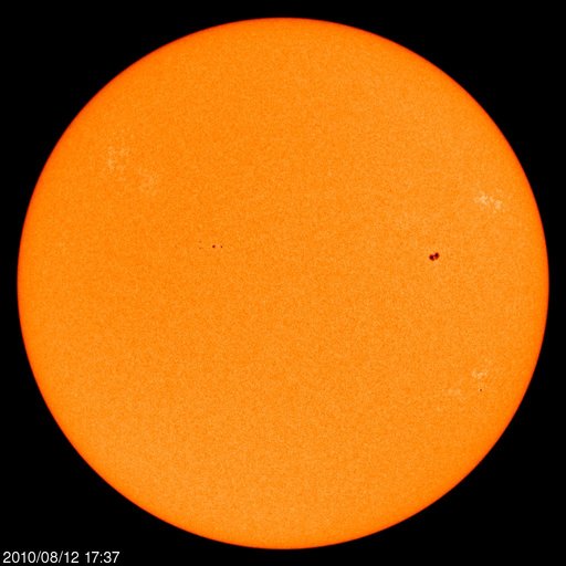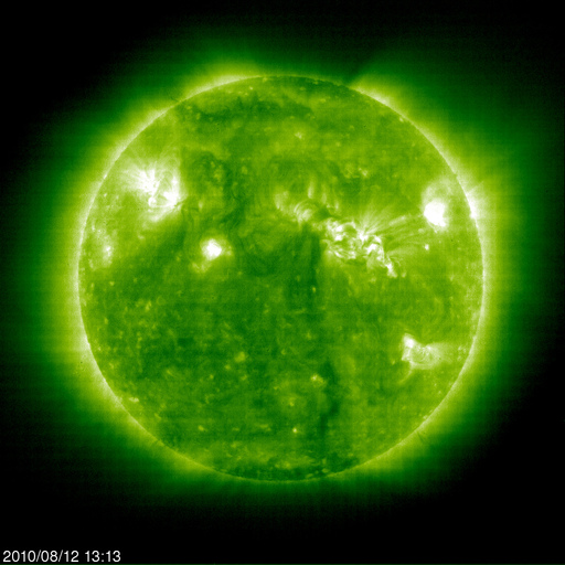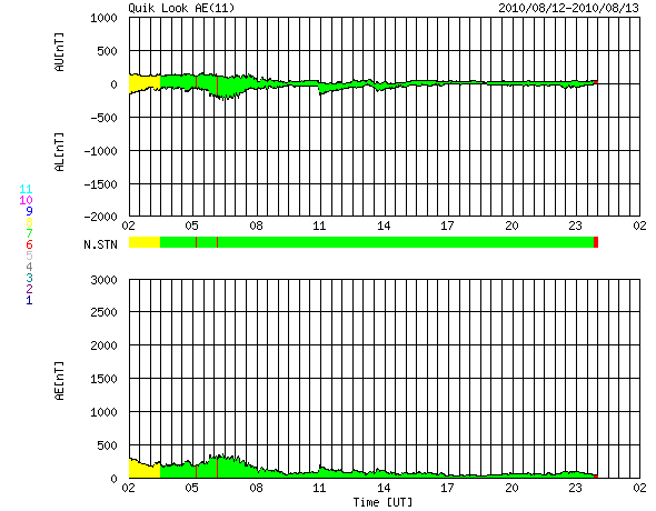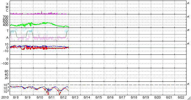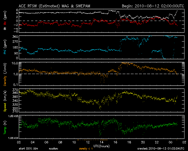2010/ 8/13 10:02 更新 350km/s程の低速の太陽風が続いています。太陽も静穏です。 担当 篠原 太陽風は、速度360〜340km/sと、 昨日とほとんど同じ低速の風です。 磁場強度も、4nTから2nTへと弱まっていて、 太陽風は、とても穏やかです。 磁気圏も静穏で、AE指数は、 前半に南向き磁場の影響による小さな変化が見られるだけで、 とても静かです。 このまましばらくの間、 穏やかな太陽風、磁気圏となるでしょう。 27日周期の図の前周期のグラフは、 最後の頃に400km/s台に上がっています。 この後、高速風がやって来るでしょう。 太陽の活動も、静穏です。 X線のグラフでは、Bクラスの小さな変化も見られなくなりました。 1098黒点群は、小さくなっていて、 弱まり始めている様です。 また、ずっと1つの大きな黒点だった1093黒点群が、 2つの黒点に分かれて見えます。 SOHO EIT195による太陽コロナ。 (c) SOHO (ESA & NASA) ![]() SOHOによる太陽可視光写真。 (c) SOHO (ESA & NASA) ![]() ACEが観測した太陽風の磁場(1番上の枠、白線は全体の強度、赤線は南北成分) および、太陽風の密度(3番目の橙線)、速度(4番目の黄線) (c) NOAA/SWPC ![]() リアルタイムAE指数 下段のAEグラフの値が高くなると、オーロラ活動が活発化しています。 (c) 京都大学, NICT ![]() 27日の太陽周期に合わせたデータプロット 太陽が同じ面を地球に向けていた27日前の変化から、今後を予想することができます。 (c) 作図:宇宙天気ニュース