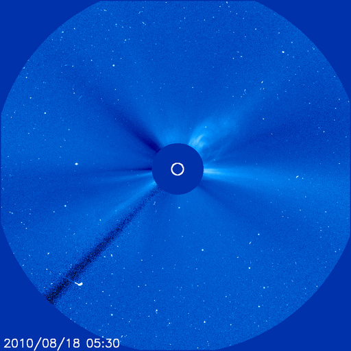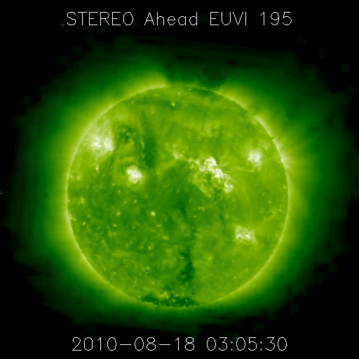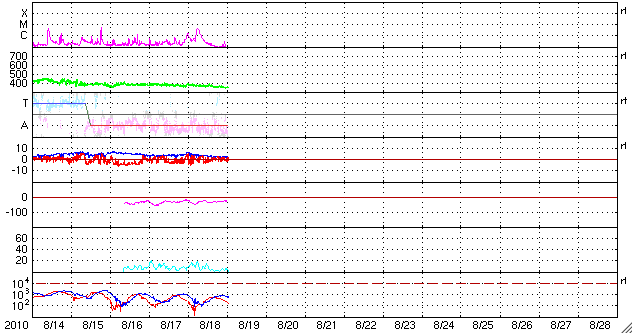 2010/ 8/19 10:14 更新 西に沈んだ1099黒点群で、C4.5のフレアが発生しました。太陽風は低速風です。 担当 篠原 昨日、18日14時(世界時18日5時)に、1099黒点群でC4.5のフレアが発生しました。 地球から見ると、1099黒点群は既に太陽の向こう側に回り込んでいます (昨日のGOESの写真を参照して下さい)。 従って、C4.5というのは、太陽の端から頭を出した部分のX線の強度です。 実際のフレアはもっと大きな規模だったと考えられます。 地球よりも前方を進んでいるSTEREO Aheadでは、 このフレアをほぼ正面から見ることができました。 今日の1枚目の動画は、STEREO AheadのEUVI195によるものです。 爆発とともに、太陽からガスが飛び出している様子を見ることができます。 CME(太陽ガスの放出現象)です。 地球からは、このCMEは、ほぼ真横に向かって飛び出して見えました。 2枚目の動画は、SOHO LASCO C3カメラによるものです。 なかなか豪快に飛び出していますが、地球への影響はありません。 現在、地球から見た太陽には、 西の端(右端)に1098黒点群、東の端(左端)に1100黒点群と、 左右に2つの黒点群があります。 しかし、どちらもたいへん微かで、消えてしまいそうです。 1099黒点群が見えなくなってしまったことで、 (地球から見える側の)太陽の活動は穏やかになりそうです。 太陽風は、やや速度が下がって、350km/秒と低速風になっています。 磁場強度も3nTほどに弱まっています。 結局、14日のCMEの影響は見られず、このまま22日頃まで静穏に過ぎていくでしょう。 磁気圏の活動も、小さなオーロラ活動が3回ほど見られた程度です。 太陽コロナの写真は、今日もGOES14です。 東から回ってきたコロナホールは、そろそろ太陽の中心線に達します。 中心線通過後、3日ほどで高速風は地球までやって来ますから、 高速風の始まりは23日頃からとなりそうです。 前周期は、最高で700km/秒まで速度が上がり、活発なオーロラも発生しました。 今周期も期待したいところです。 STEREO Aheadから見た、1099黒点群のC4.5フレア。 (c) NASA、動画加工 : 宇宙天気ニュース ![]() C4.5のフレアにより、CMEが発生しました。撮影:SOHO LASCO C3 (c) SOHO (ESA & NASA)、動画加工 : 宇宙天気ニュース ![]() GOES-14のX線カメラによる太陽コロナ。 (c) NOAA ![]() SOHO衛星による太陽の可視光写真。マウスの矢印を写真に重ねると、黒点番号付きの写真に切り替わります。 (c) SOHO (ESA & NASA) ![]() GOES衛星の太陽X線データ (c) NOAA/SWPC ![]() ACEが観測した太陽風の磁場(1番上の枠、白線は全体の強度、赤線は南北成分) および、太陽風の密度(3番目の橙線)、速度(4番目の黄線) (c) NOAA/SWPC ![]() リアルタイムAE指数 下段のAEグラフの値が高くなると、オーロラ活動が活発化しています。 (c) 京都大学, NICT ![]() 27日の太陽周期に合わせたデータプロット 太陽が同じ面を地球に向けていた27日前の変化から、今後を予想することができます。 (c) 作図:宇宙天気ニュース
